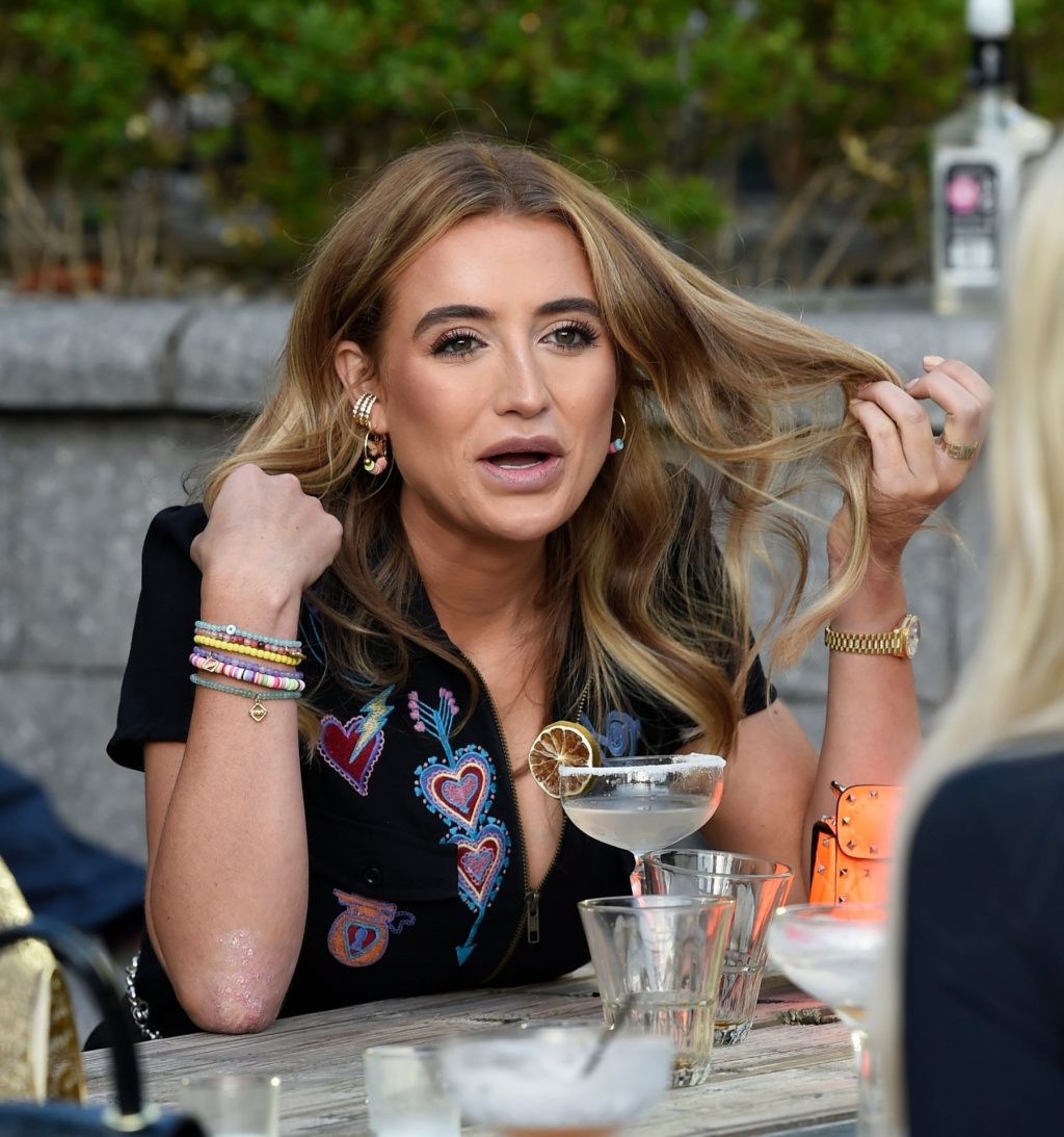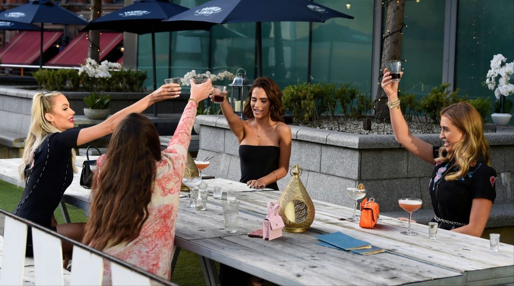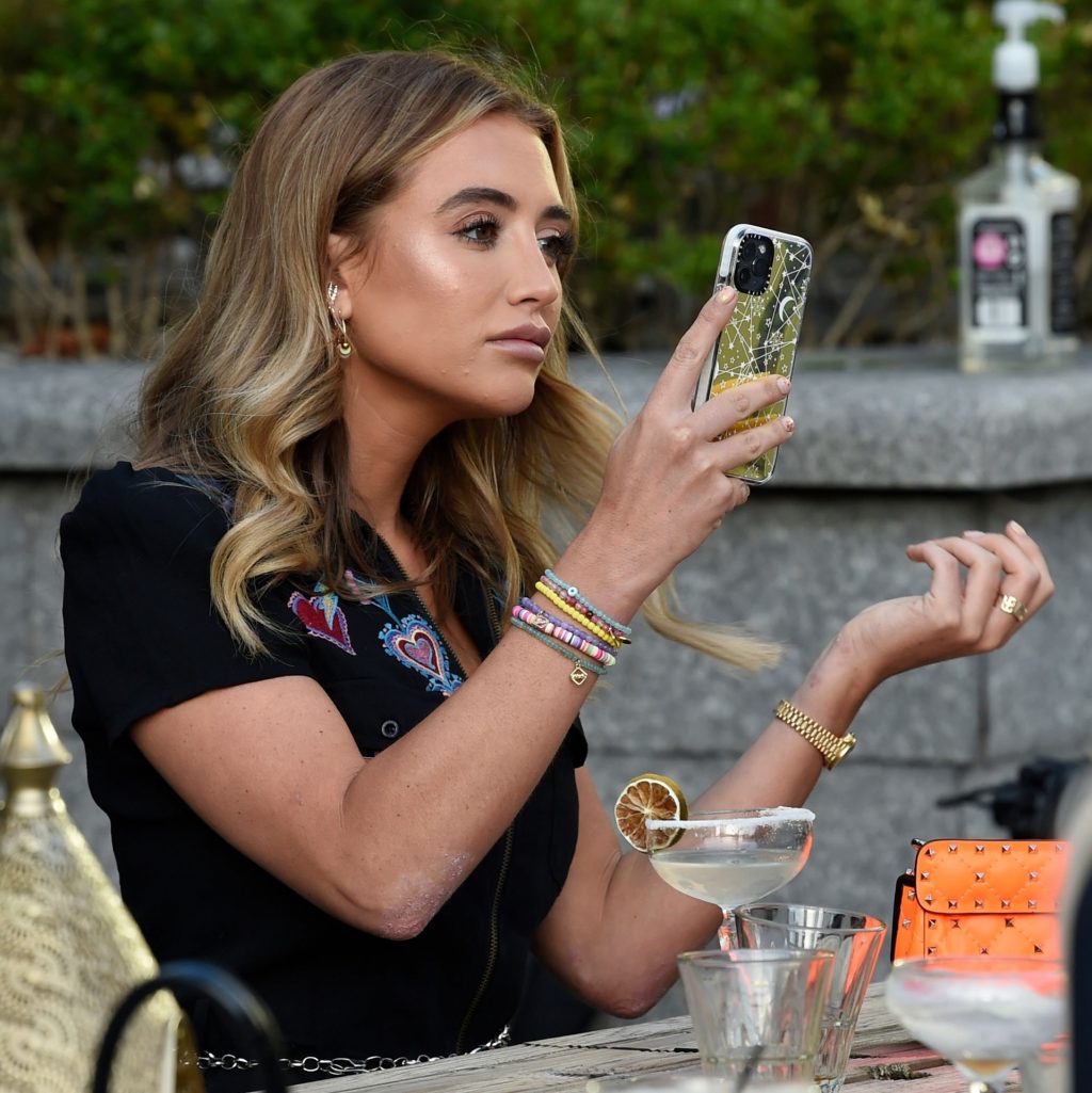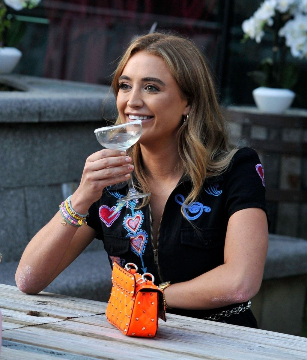 Love Island y la estrella de TOWIE Georgia Harrison presume de sus nuevos pechos 32C de $8K mientras filma Olivia Meets her Match con Nicole Bass y Fran Parman en Manchester en Impossible Bar, 09/02/2020.