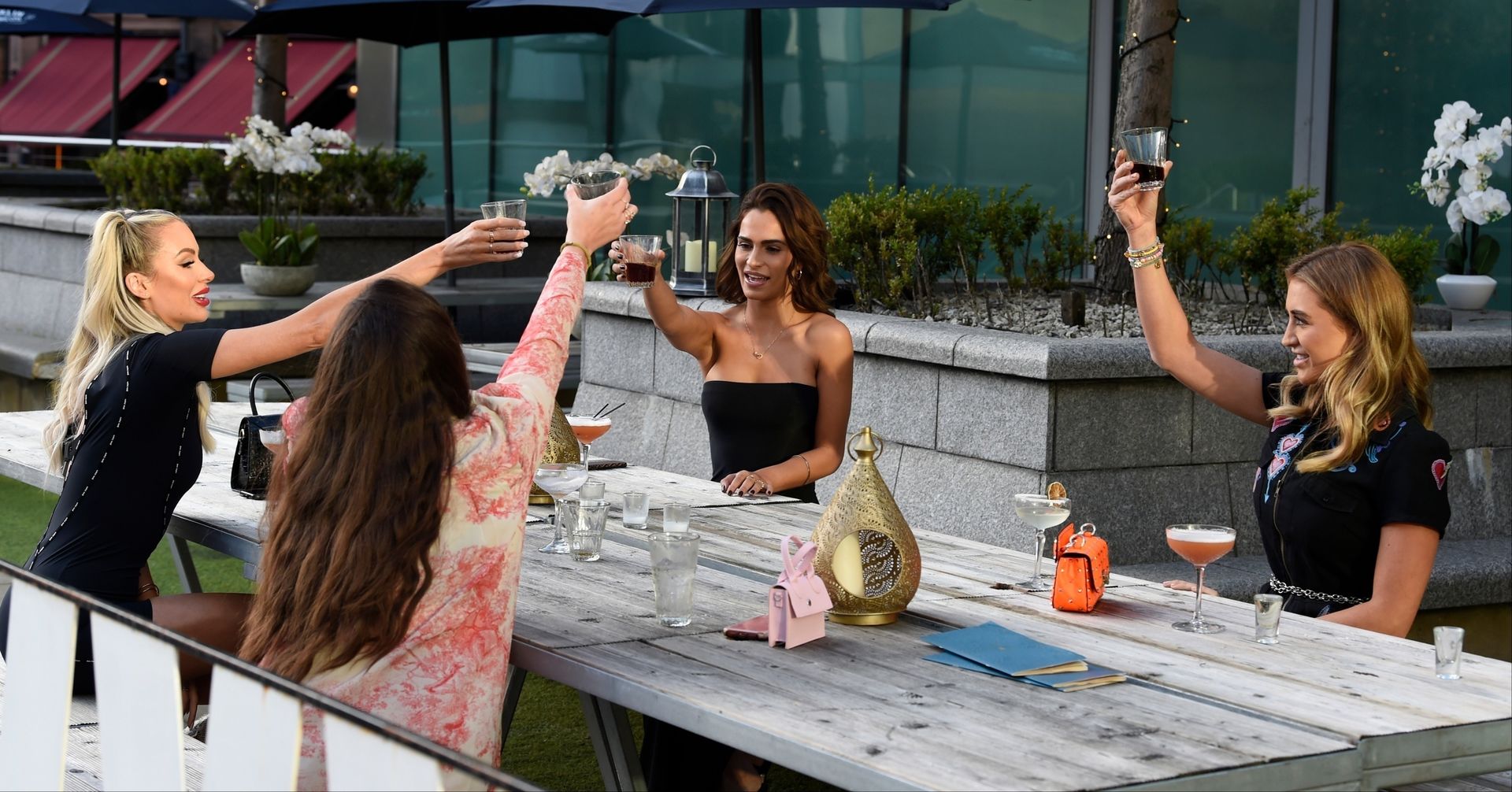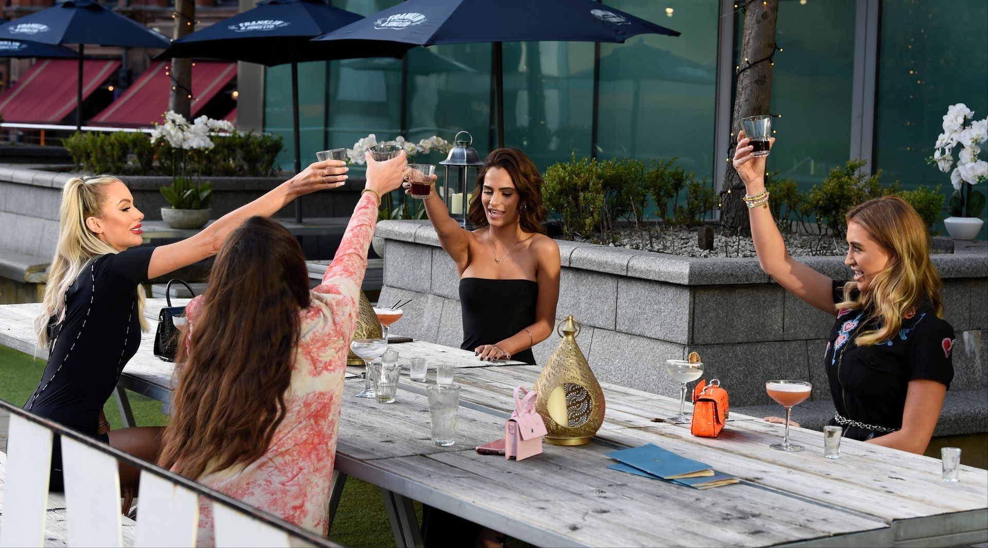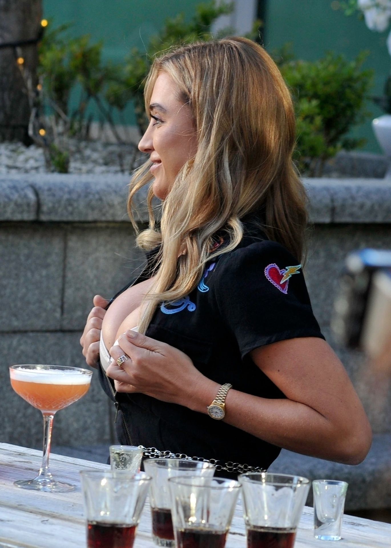 Love Island y la estrella de TOWIE Georgia Harrison presume de sus nuevos pechos 32C de $8K mientras filma Olivia Meets her Match con Nicole Bass y Fran Parman en Manchester en Impossible Bar, 09/02/2020.
