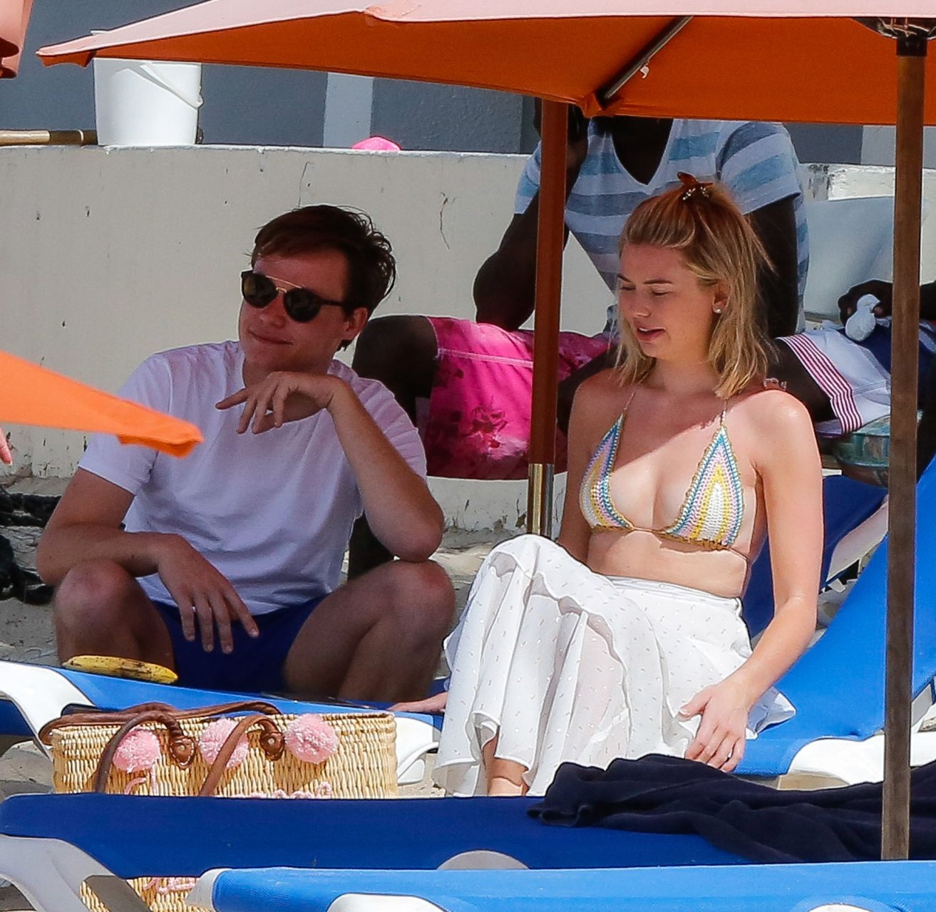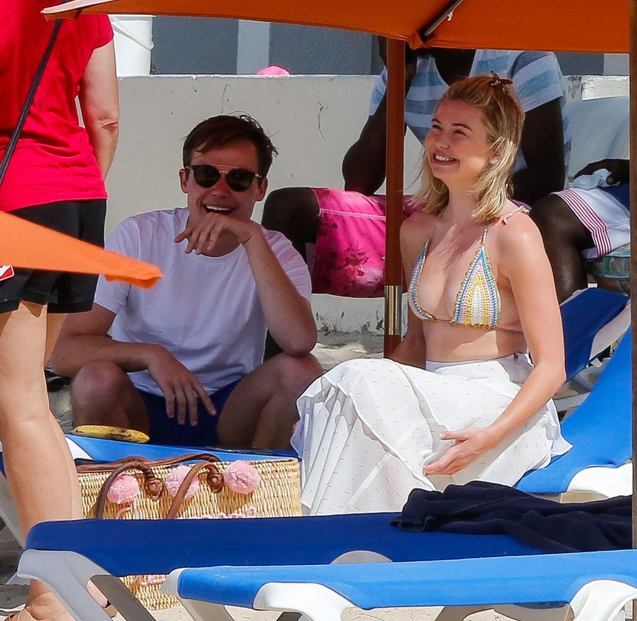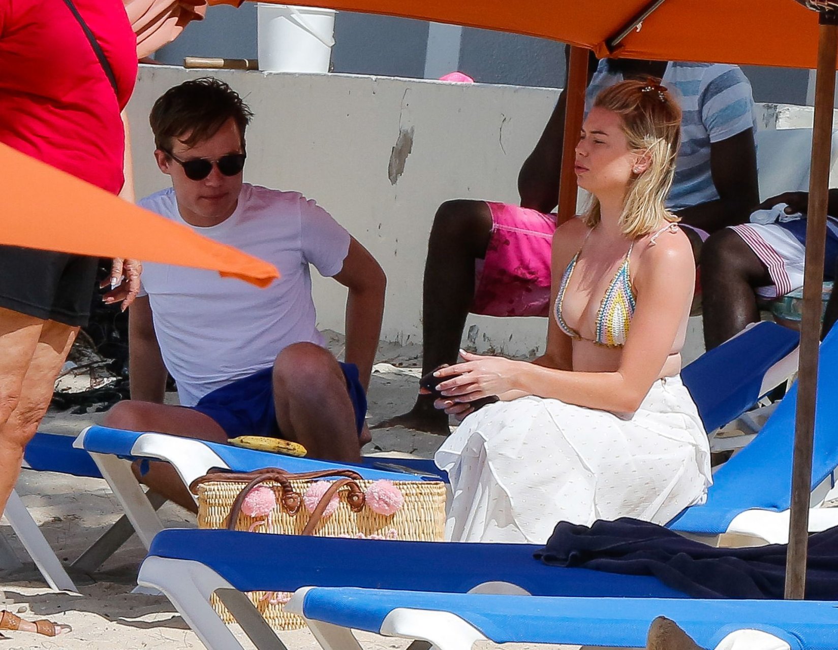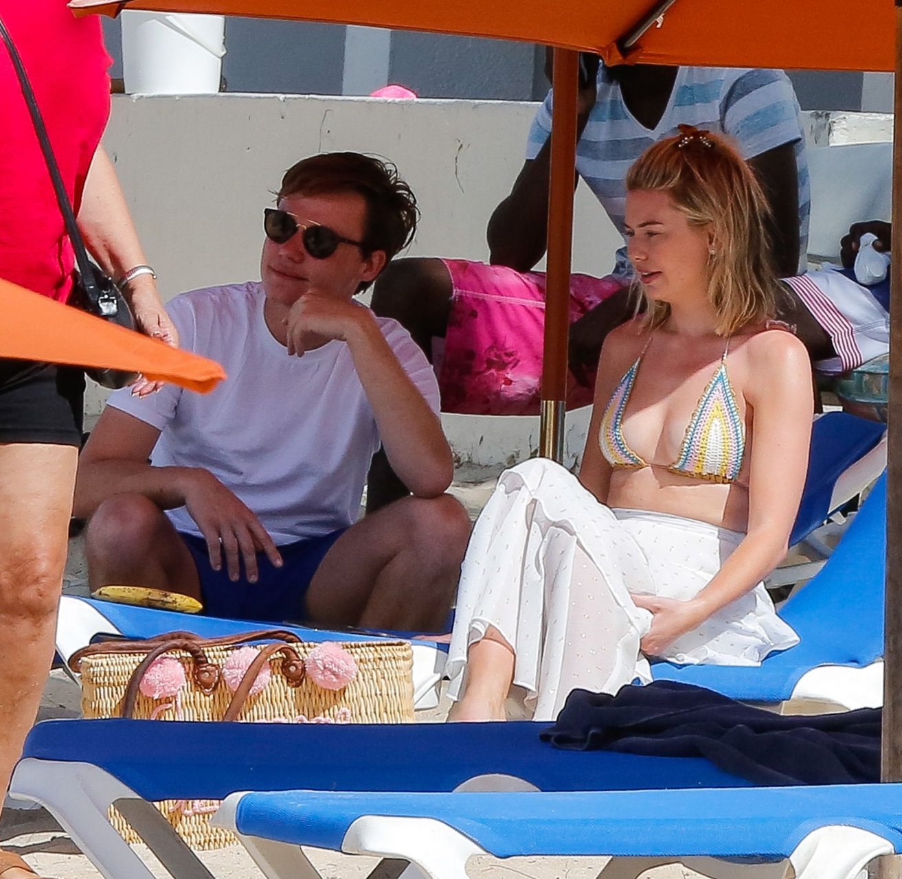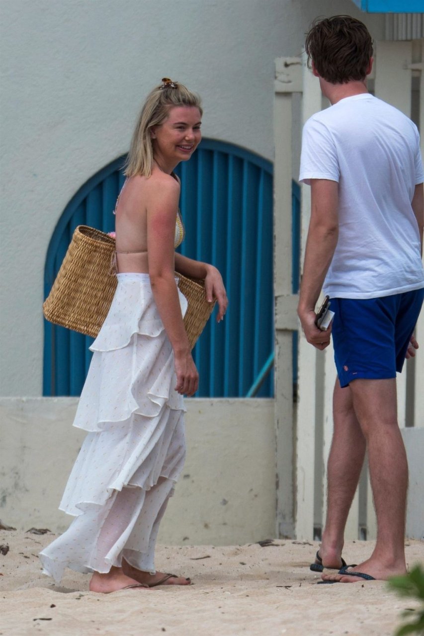 Sexy rubia Georgia “Toff” Toffolo, Reina de la Jungla, es vista en la playa con un top de bikini y una falda fluida mientras está de vacaciones en Barbados, 01/11/2019.