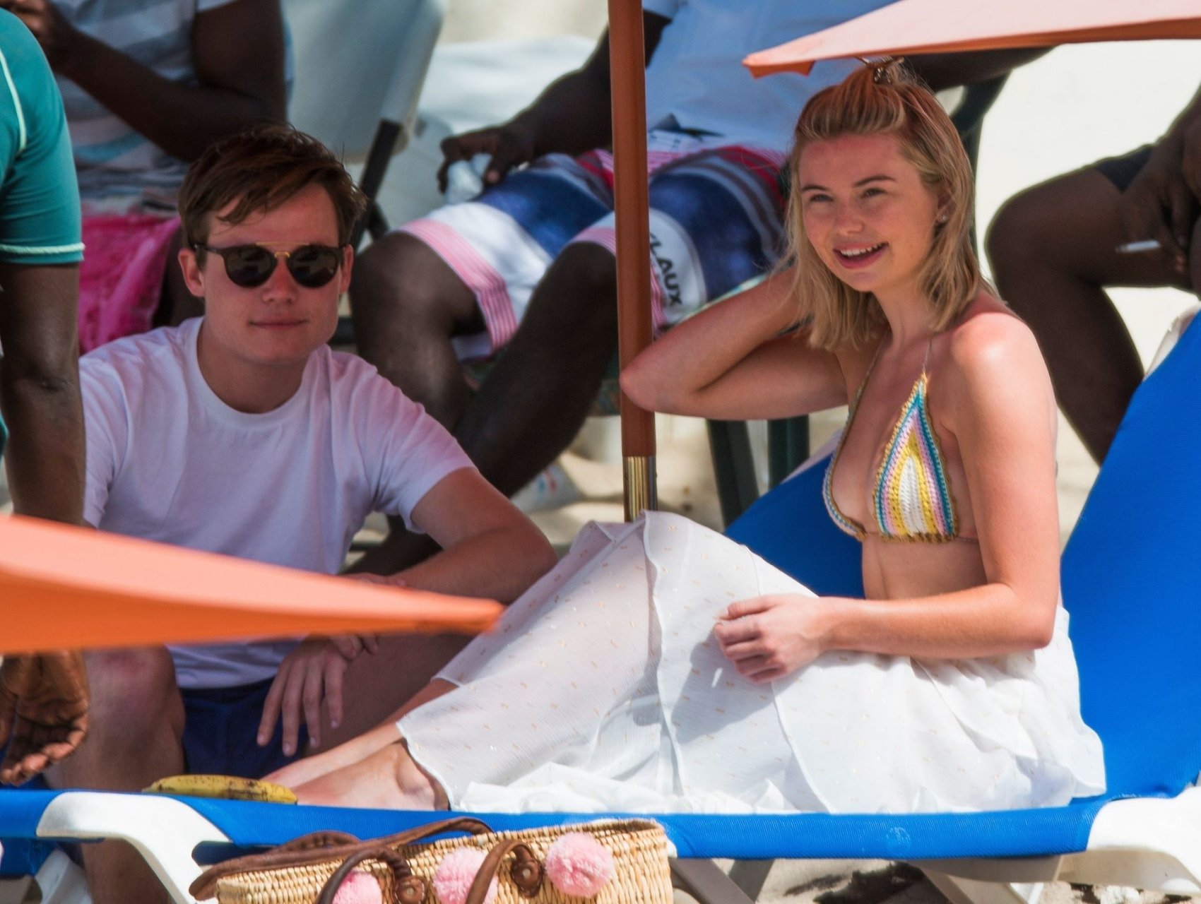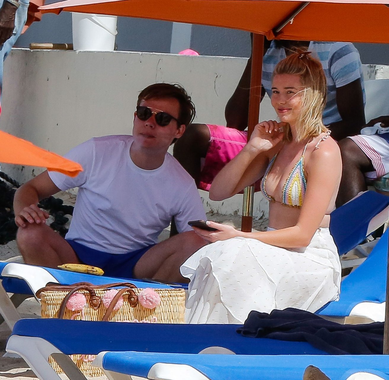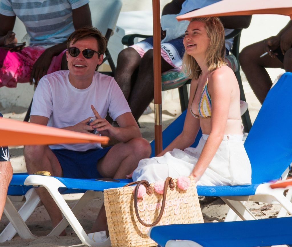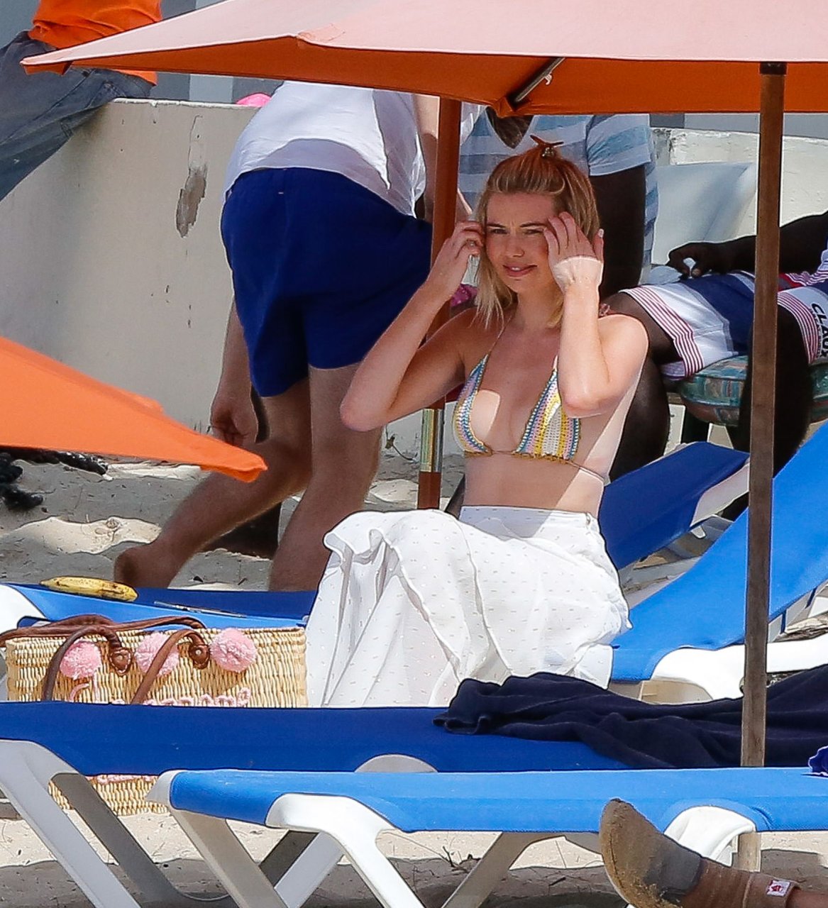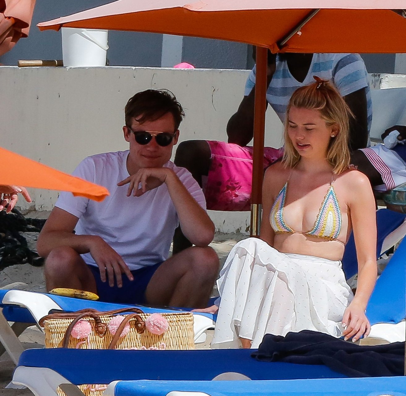 Sexy rubia Georgia “Toff” Toffolo, Reina de la Jungla, es vista en la playa con un top de bikini y una falda fluida mientras está de vacaciones en Barbados, 01/11/2019.