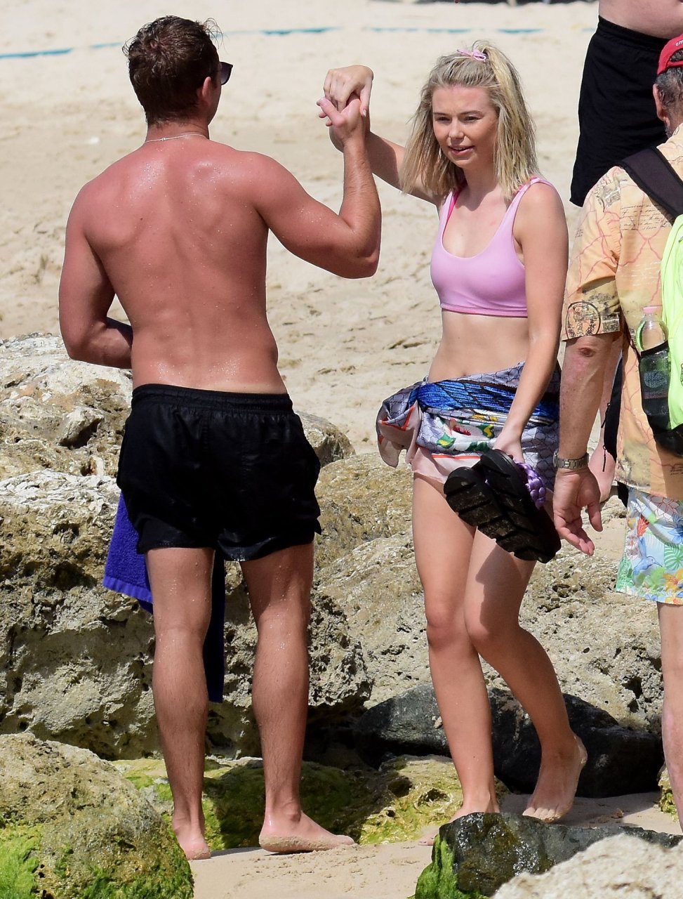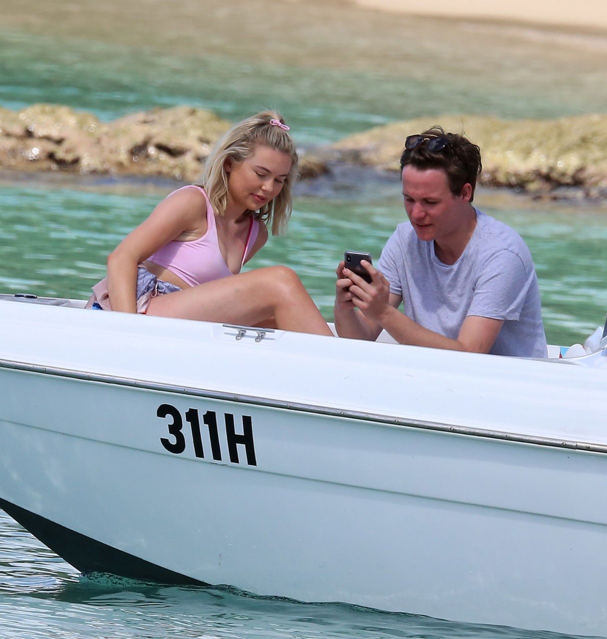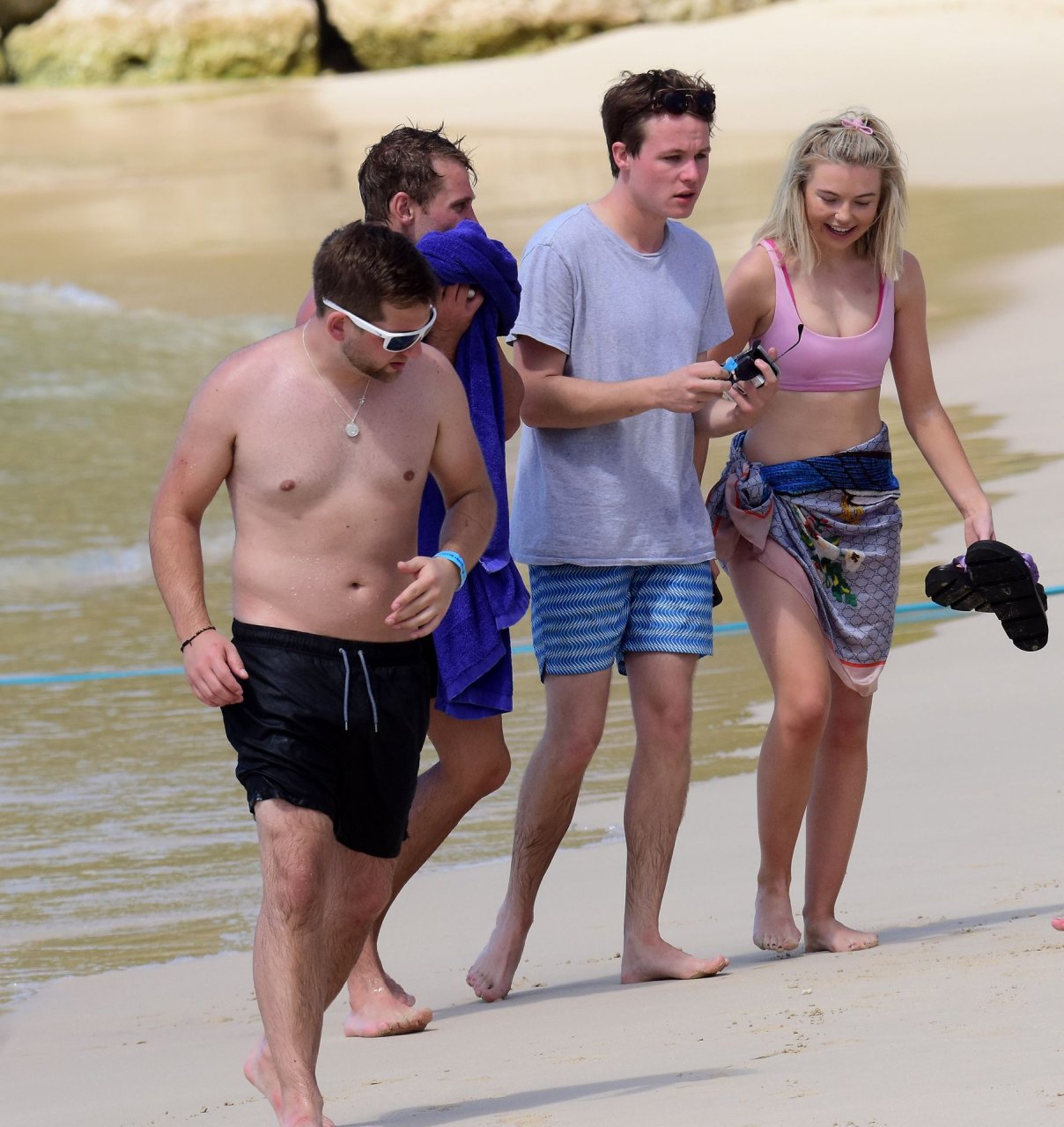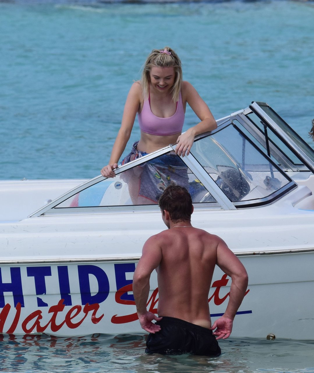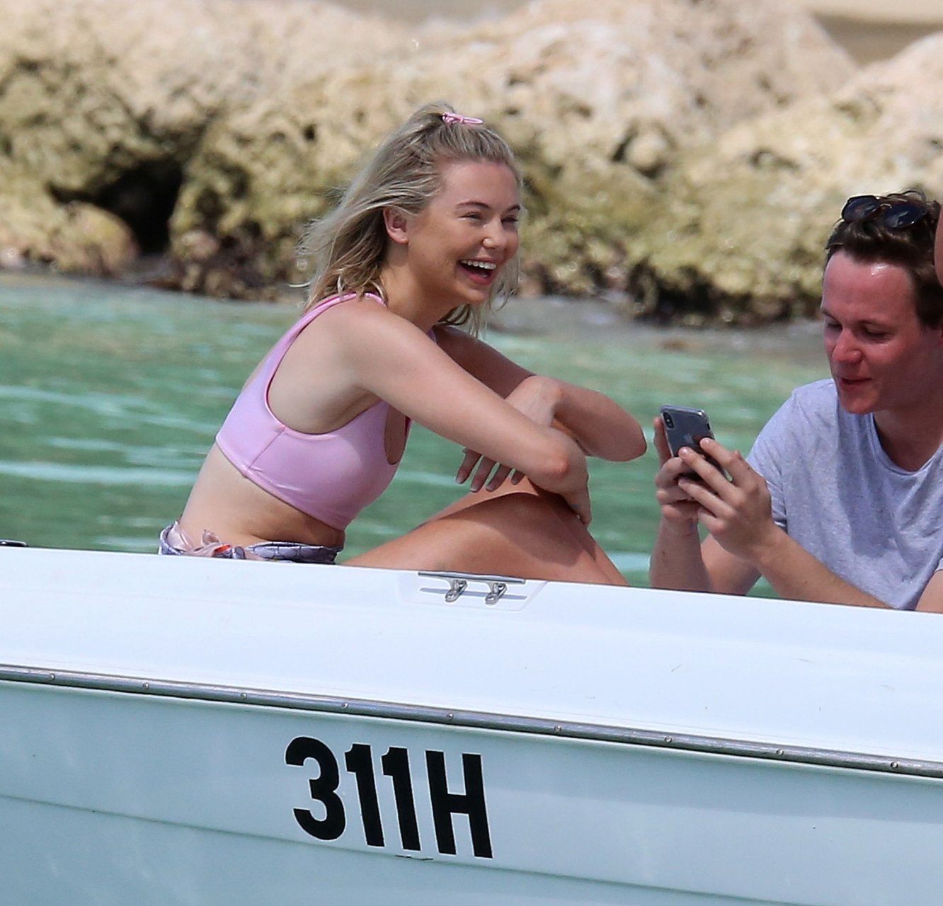 Georgia Toffolo (24) se la ve disfrutando del sol con un bikini rosa y posando felizmente con un fan para fotos en la playa de Barbados, 01/08/2019.