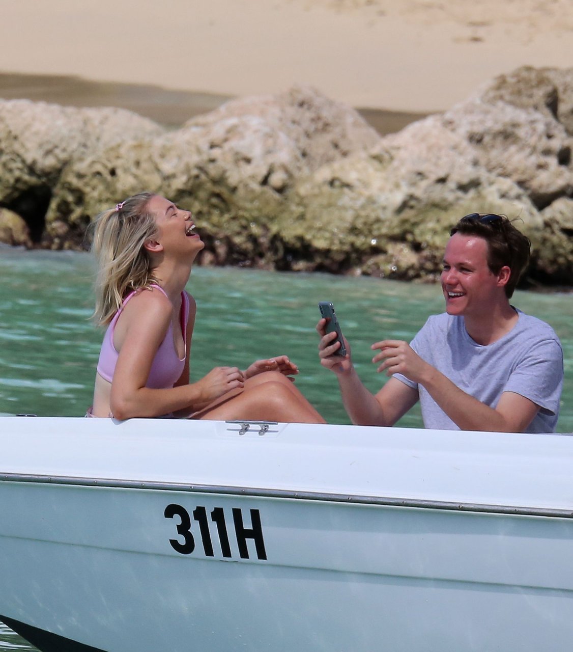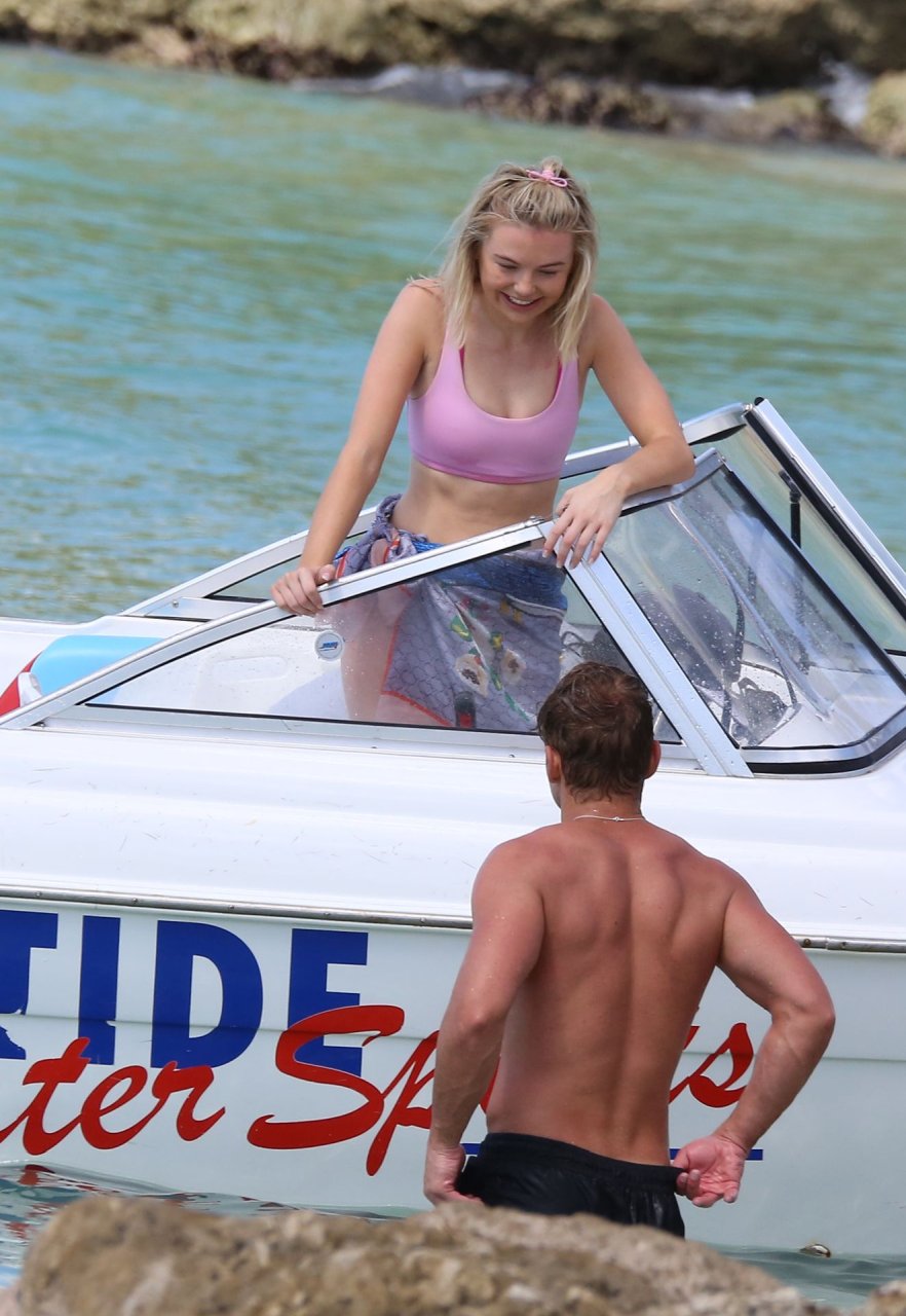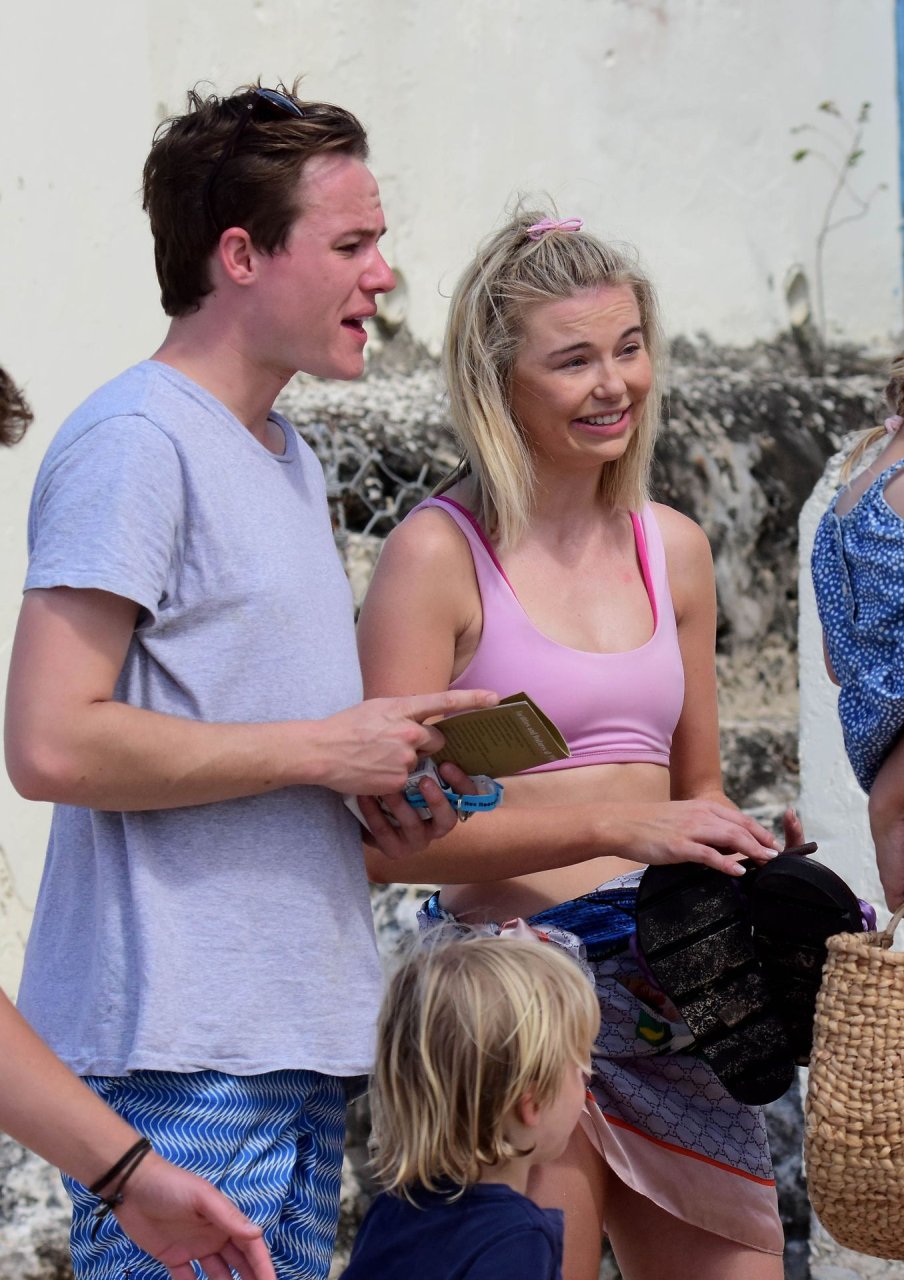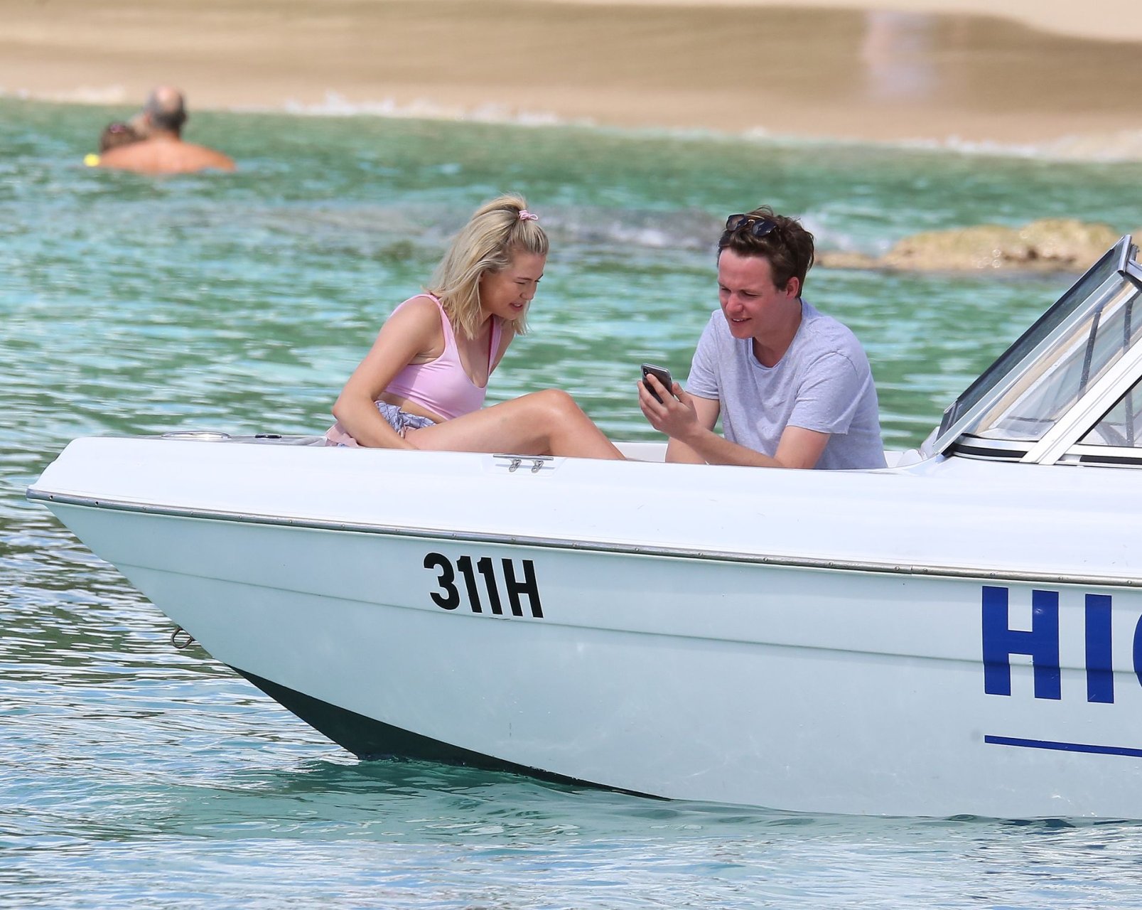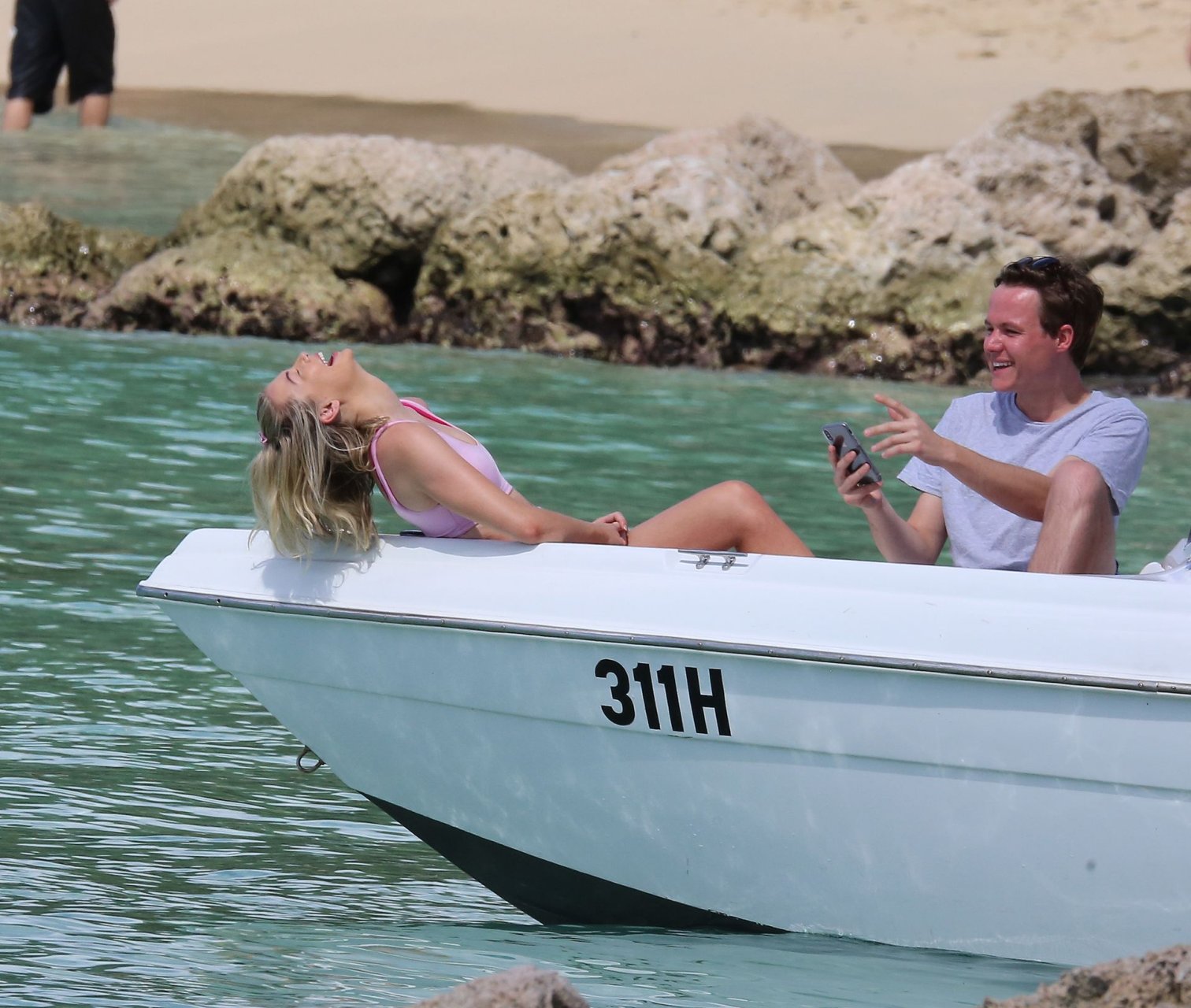 Georgia Toffolo (24) se la ve disfrutando del sol con un bikini rosa y posando felizmente con un fan para fotos en la playa de Barbados, 01/08/2019.