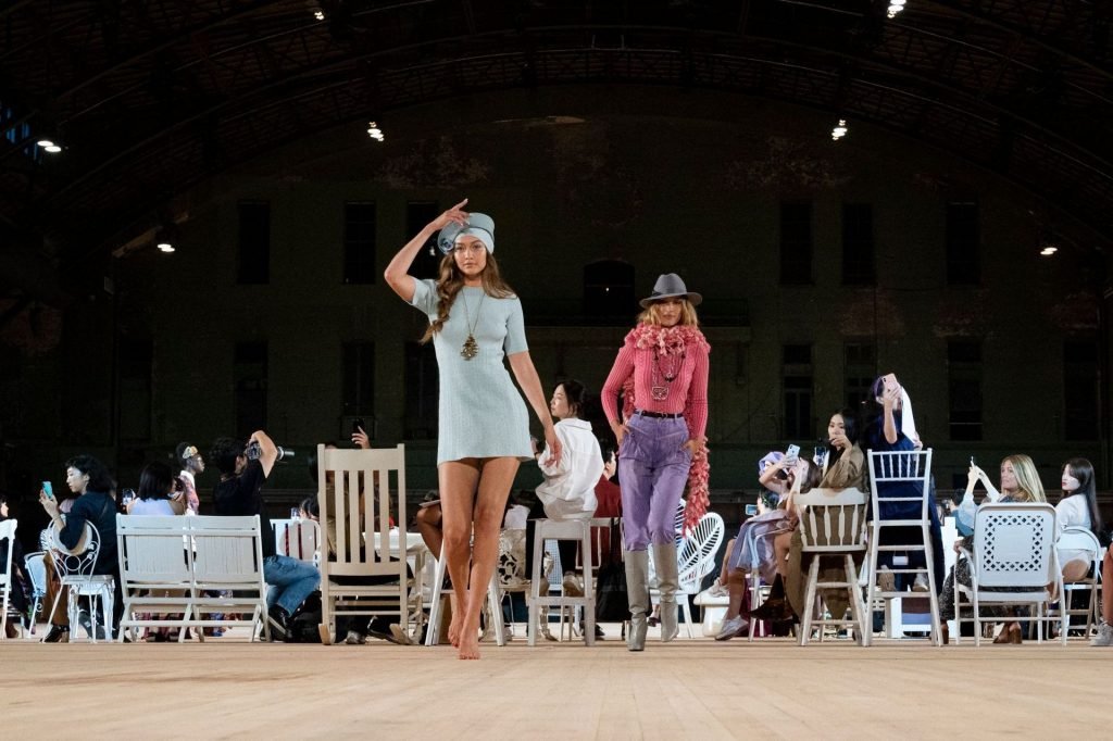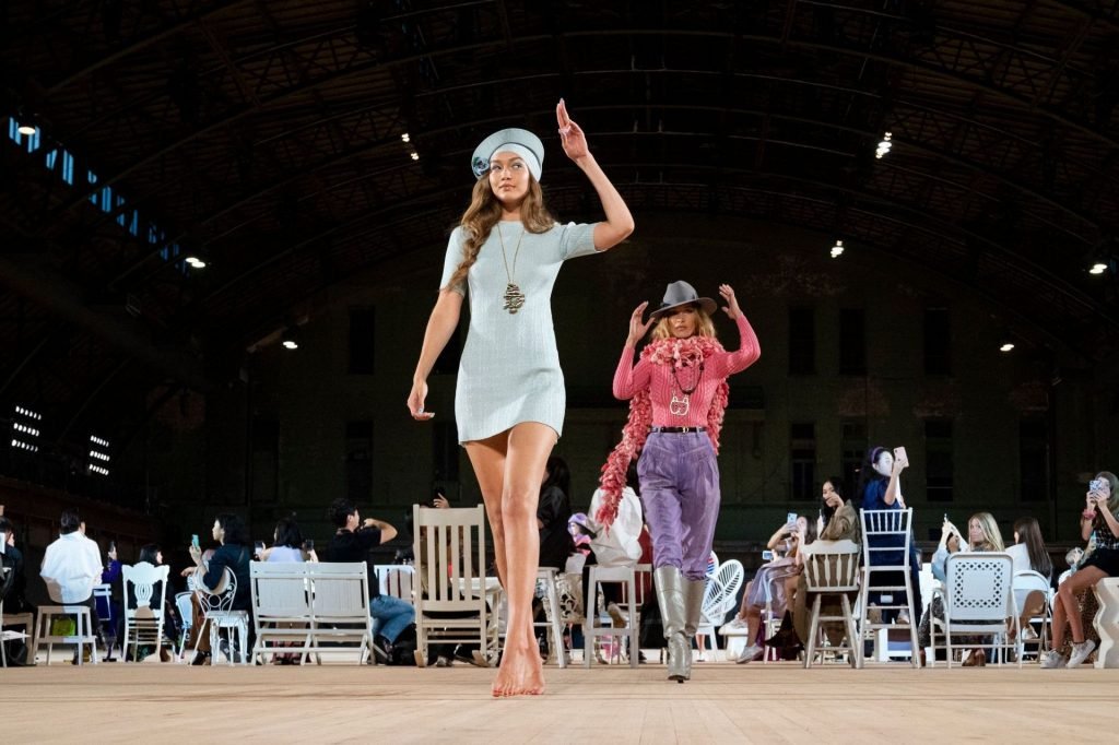 Modelo sin sujetador Gigi Hadid camina descalza por la pasarela durante el desfile de moda Marc Jacobs Primavera 2020 en Park Avenue Armory en Nueva York, 11/09/2019.