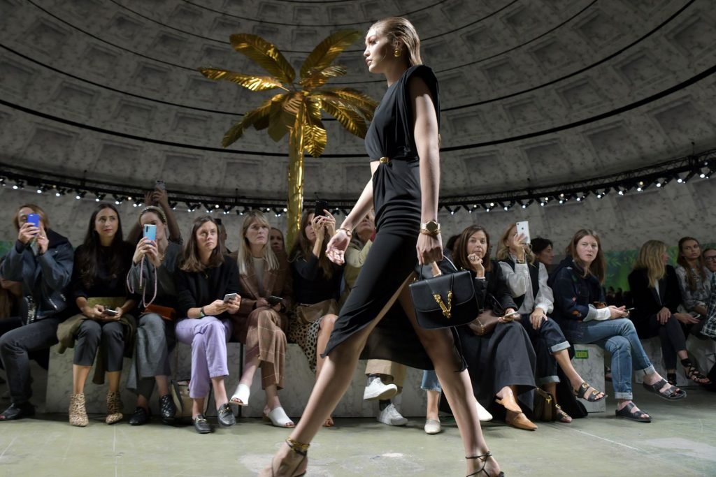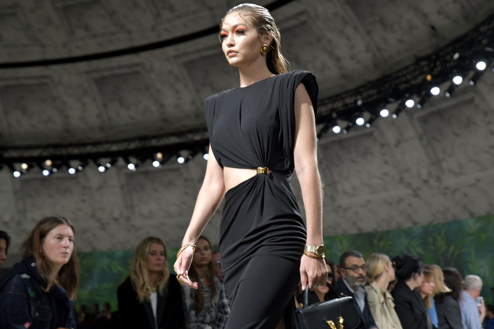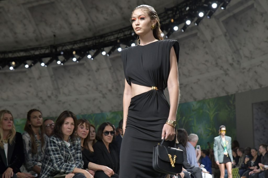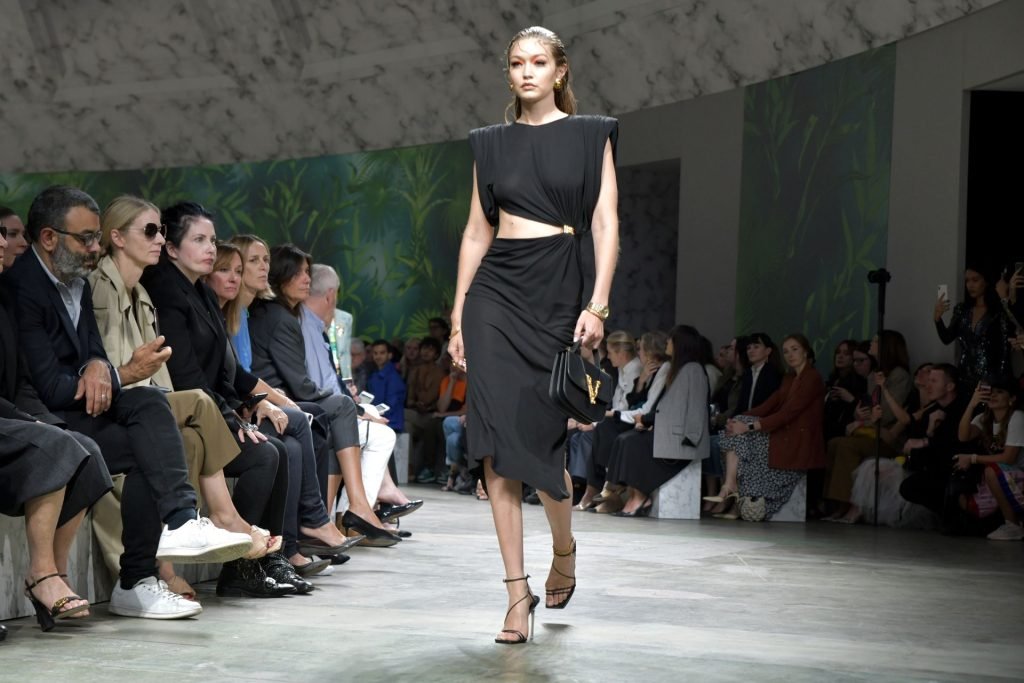 Modelo Gigi Hadid camina por la pasarela sin sostén para el desfile de Versace Primavera/Verano 2020 durante la Semana de la Moda de Milán en Italia, 20/09/2019.