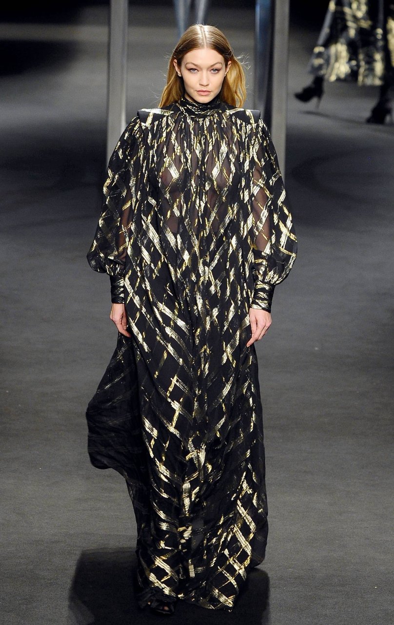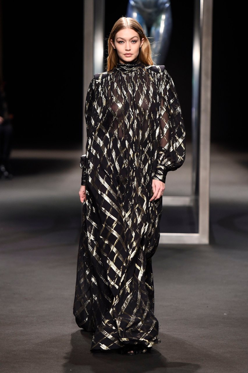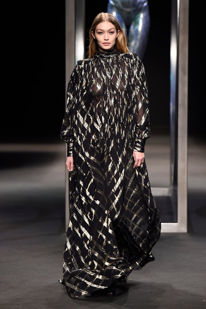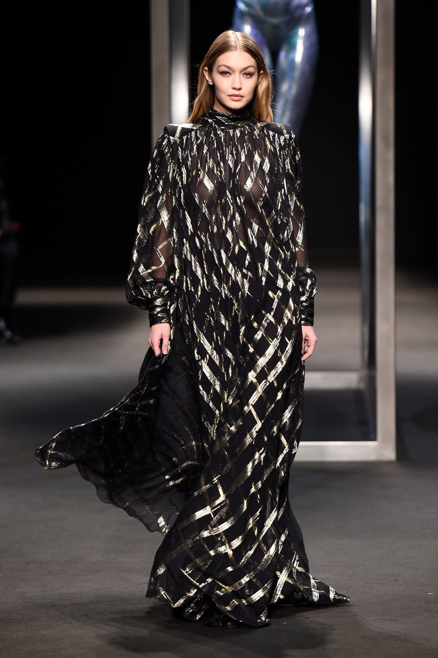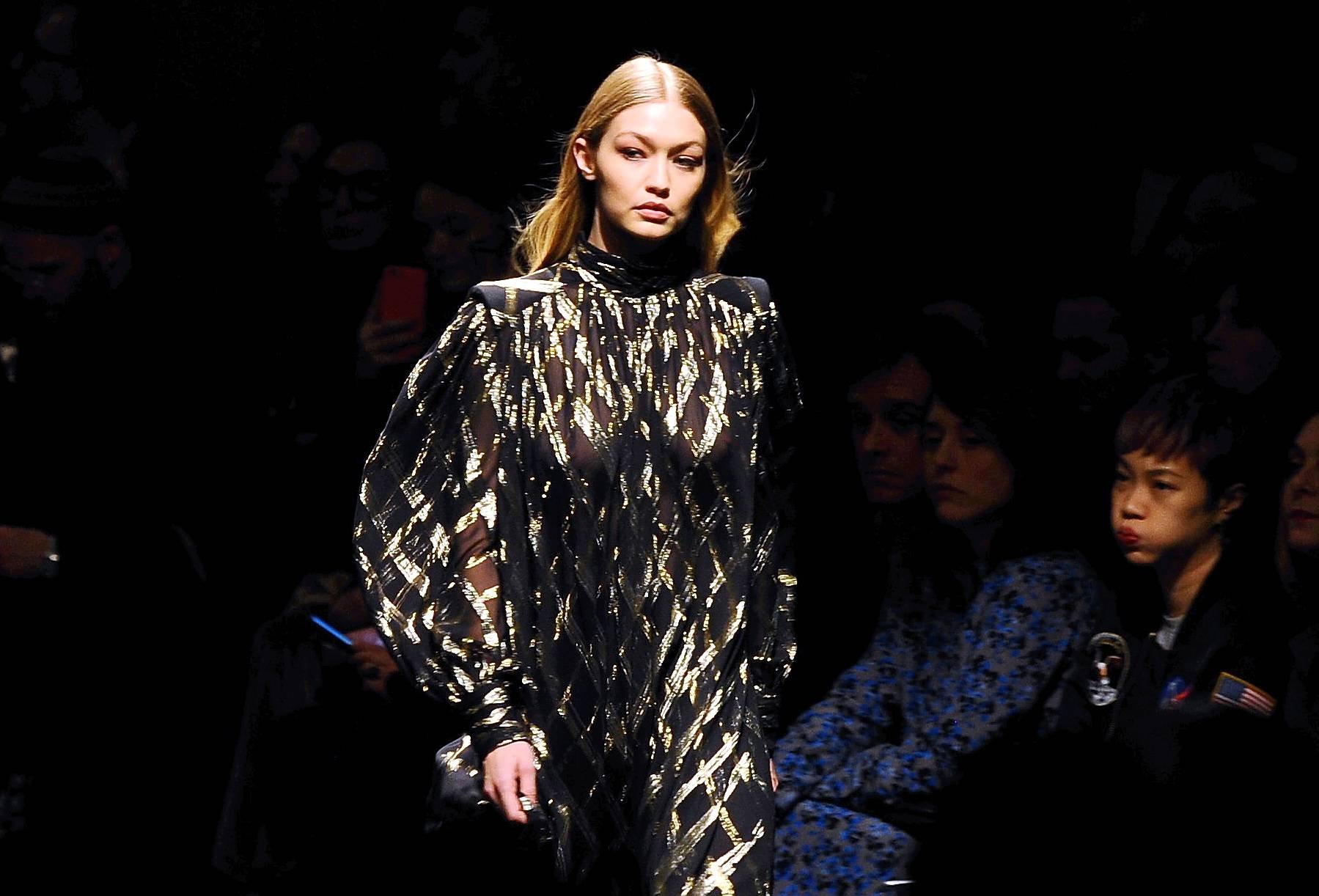 Model Gigi Hadid desfila durante el show de Alberta Ferretti Otoño/Invierno 2018/2019 en Milán, 21/02/2018.