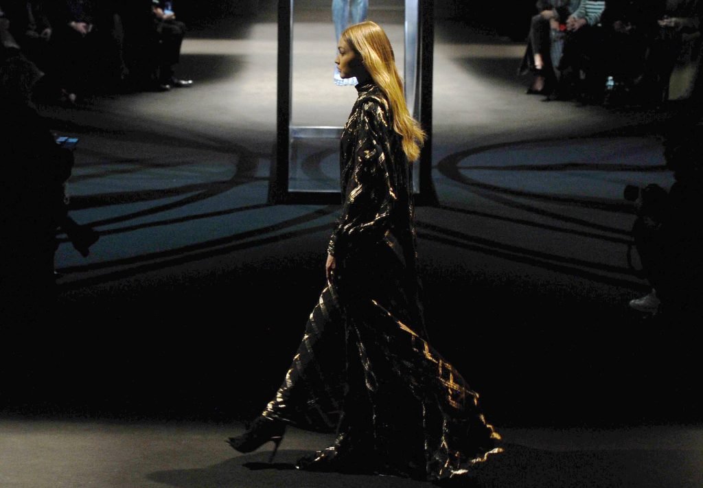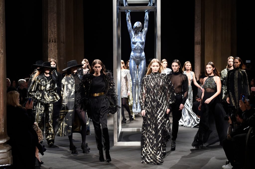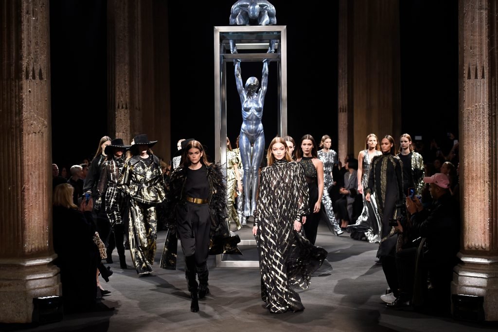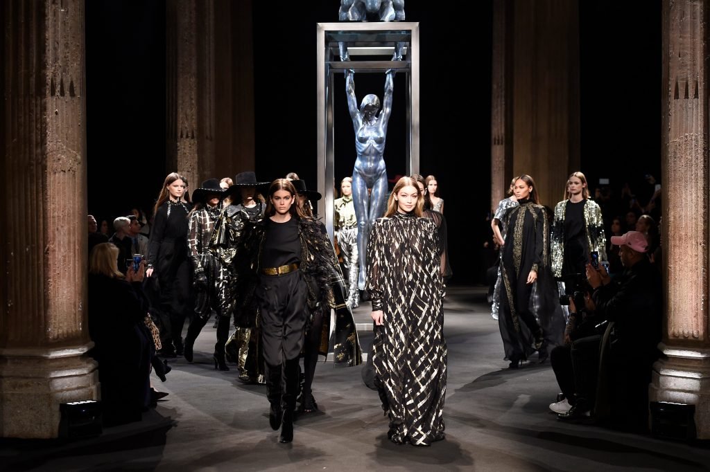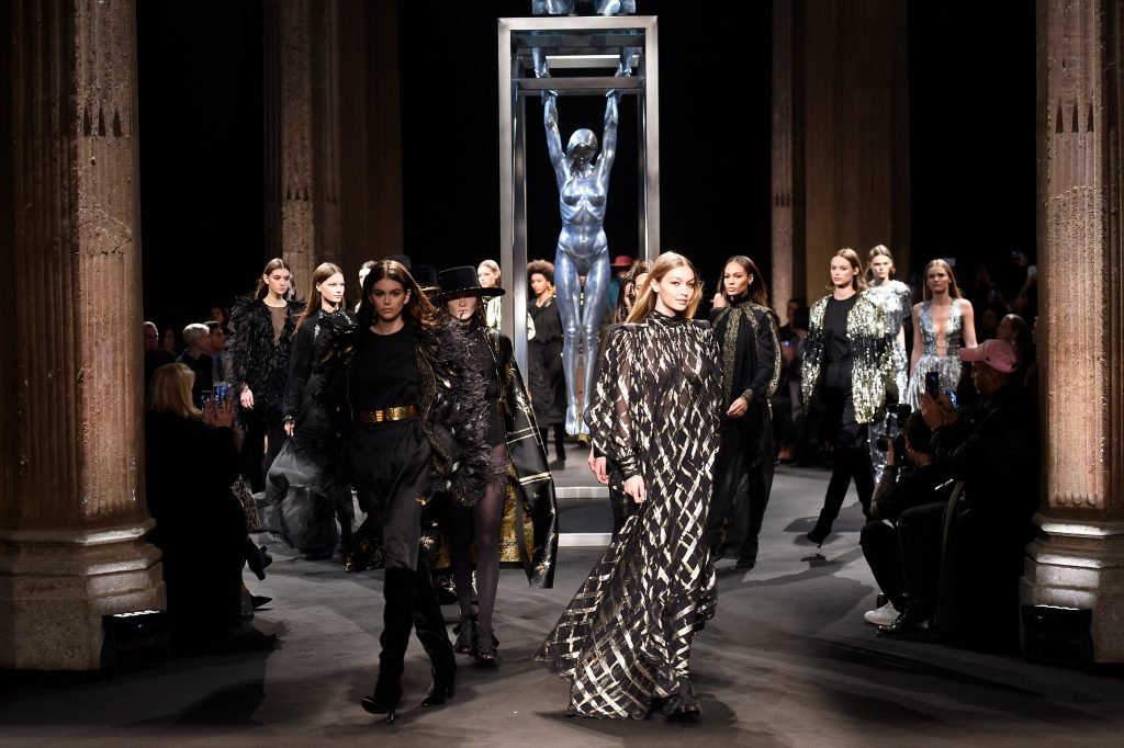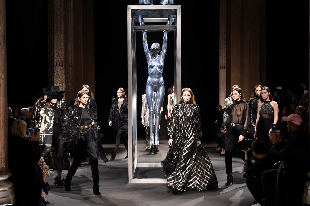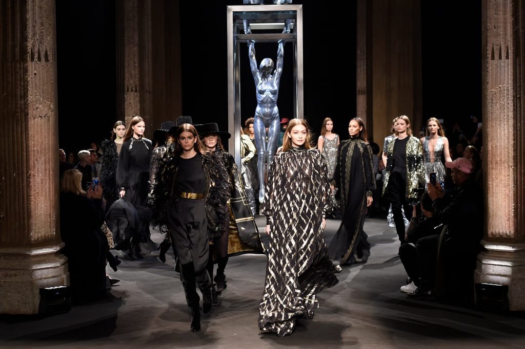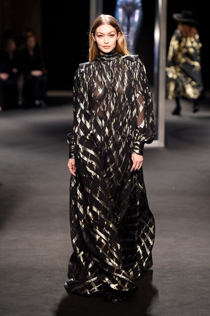 Model Gigi Hadid desfila durante el show de Alberta Ferretti Otoño/Invierno 2018/2019 en Milán, 21/02/2018.