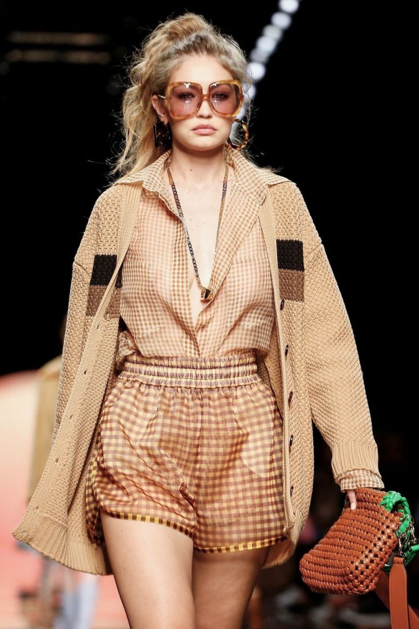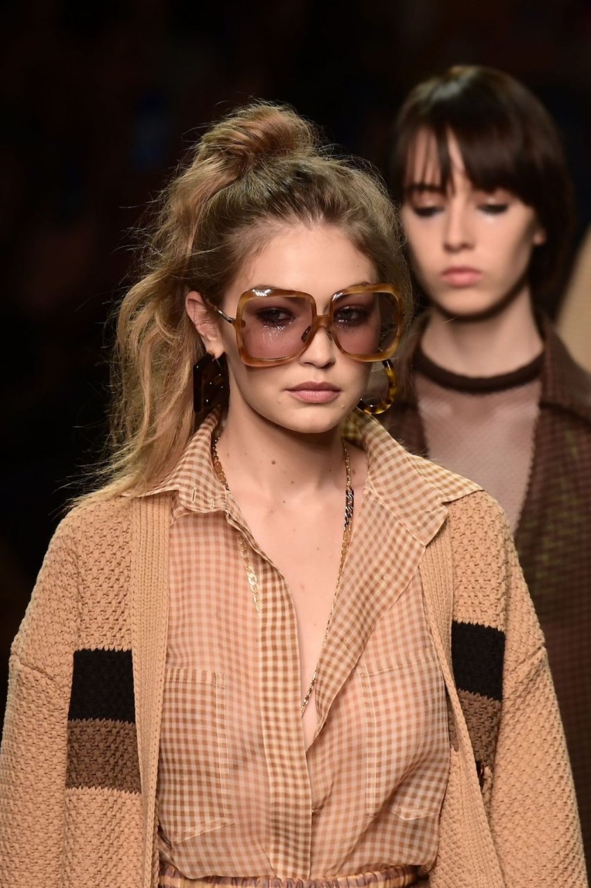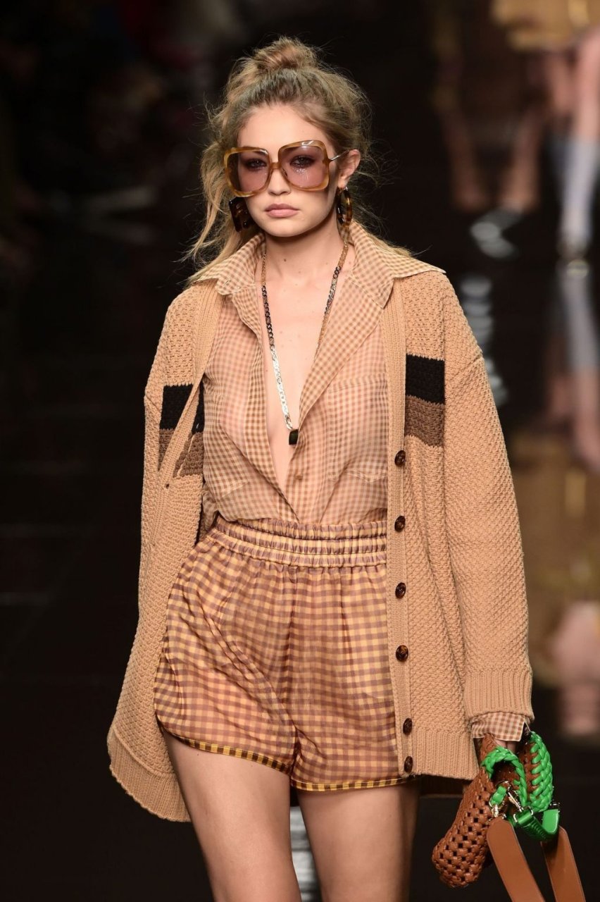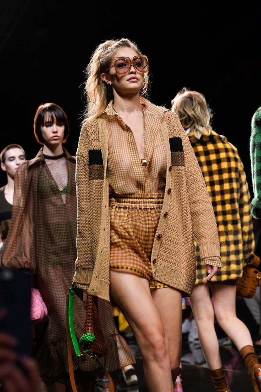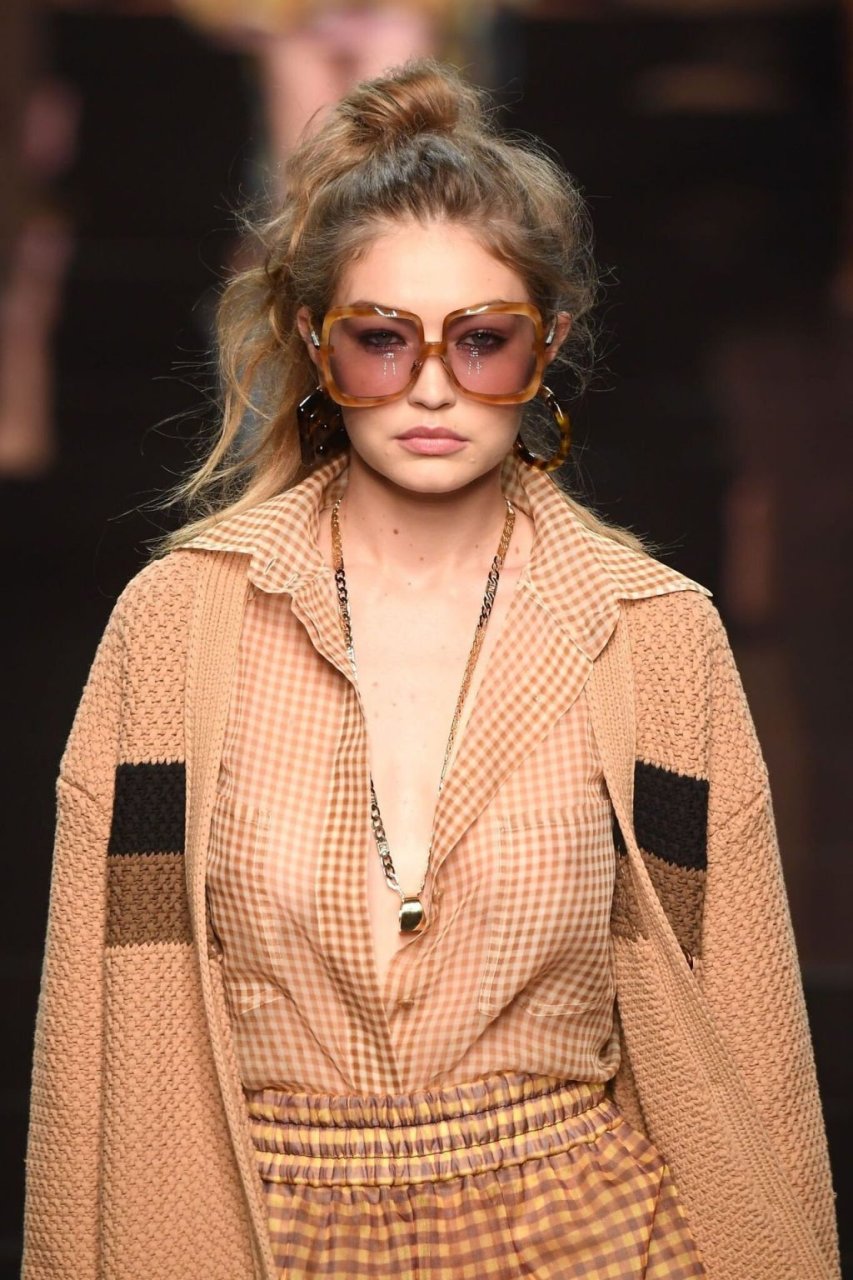 Model Gigi Hadid mostró su escote, vistiendo una camisa transparente en el desfile de Fendi durante la Semana de la Moda de Milán Primavera/Verano 2020, 19/09/2019.