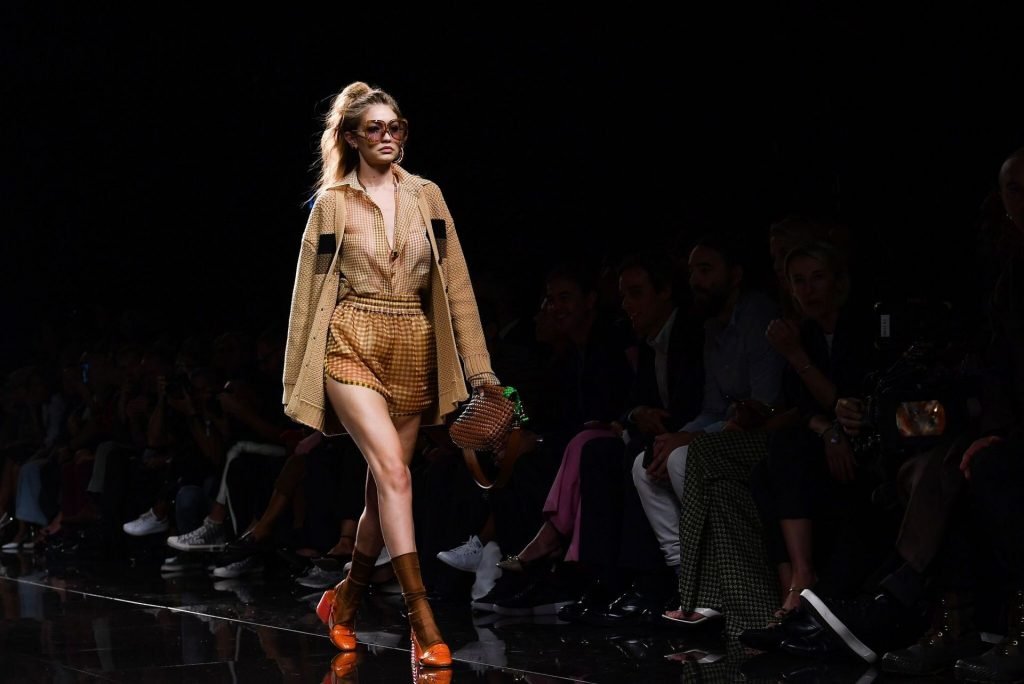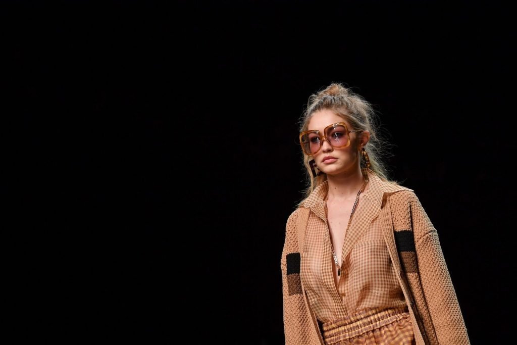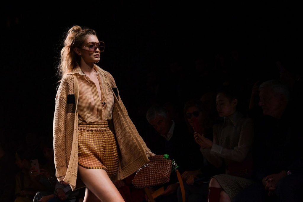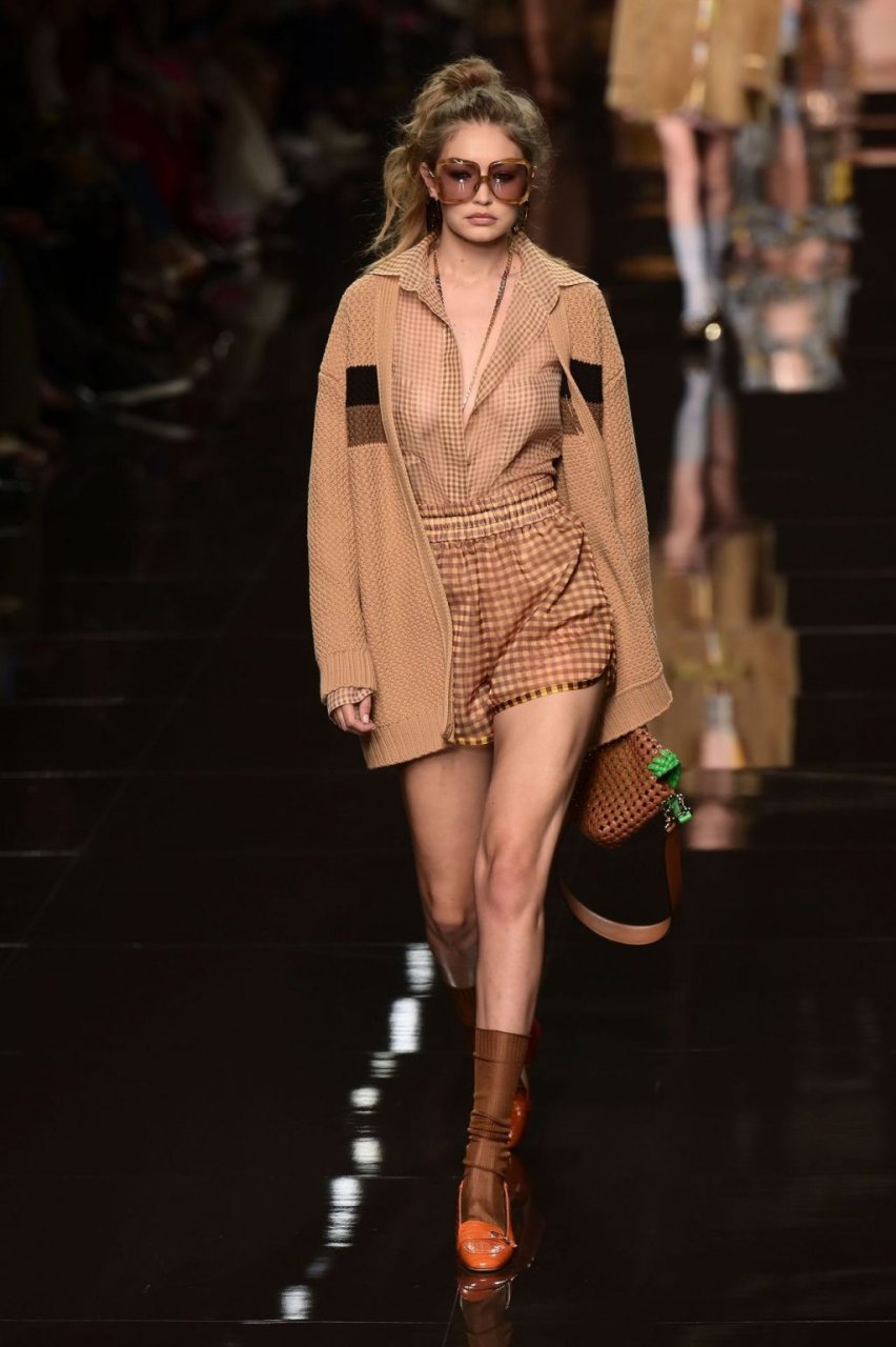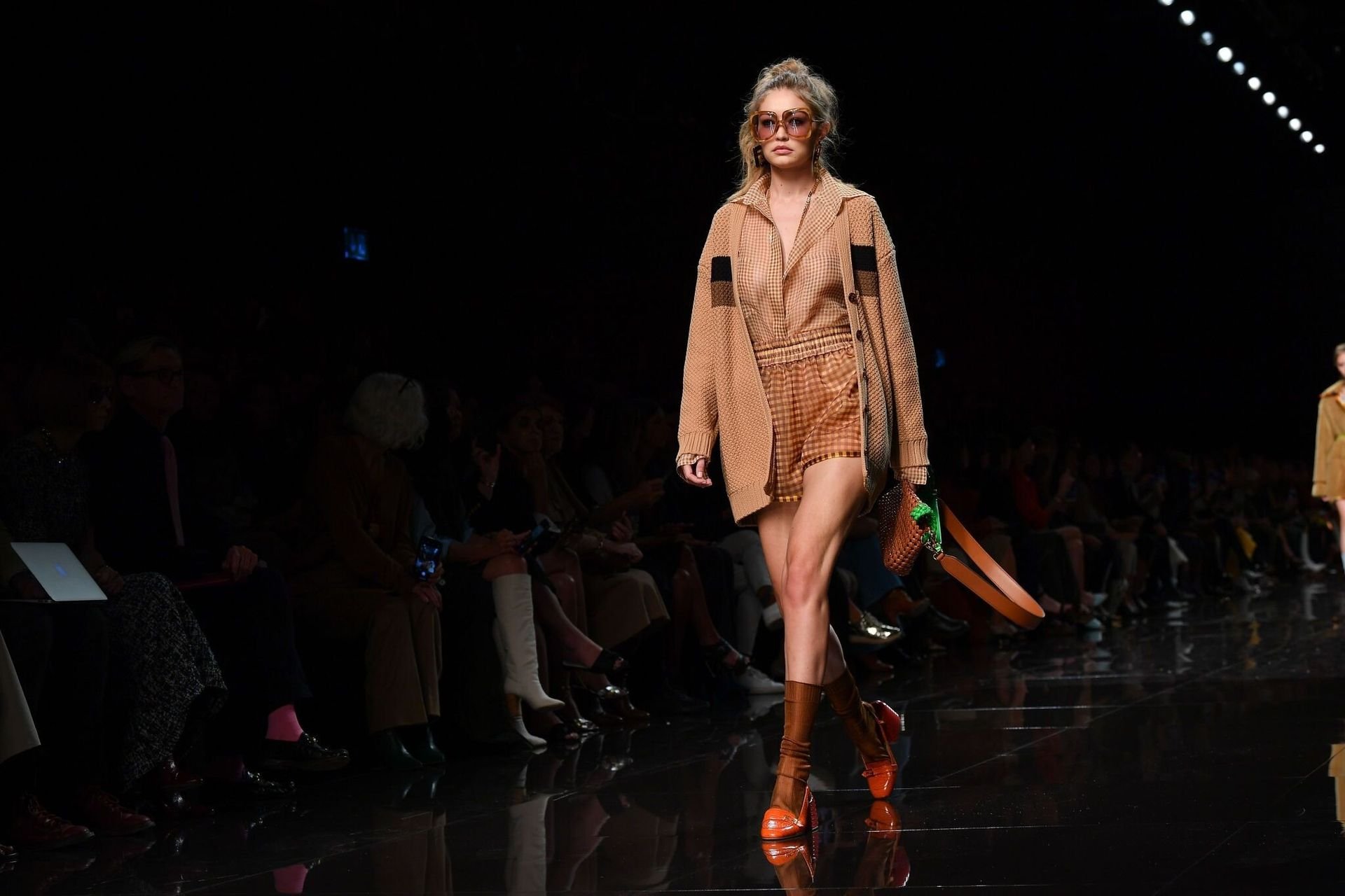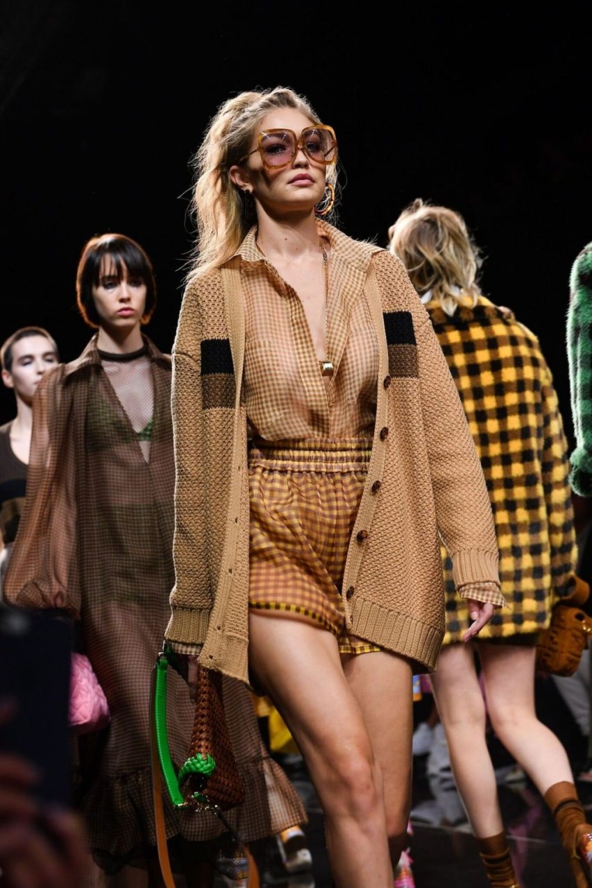 Model Gigi Hadid mostró su escote, vistiendo una camisa transparente en el desfile de Fendi durante la Semana de la Moda de Milán Primavera/Verano 2020, 19/09/2019.