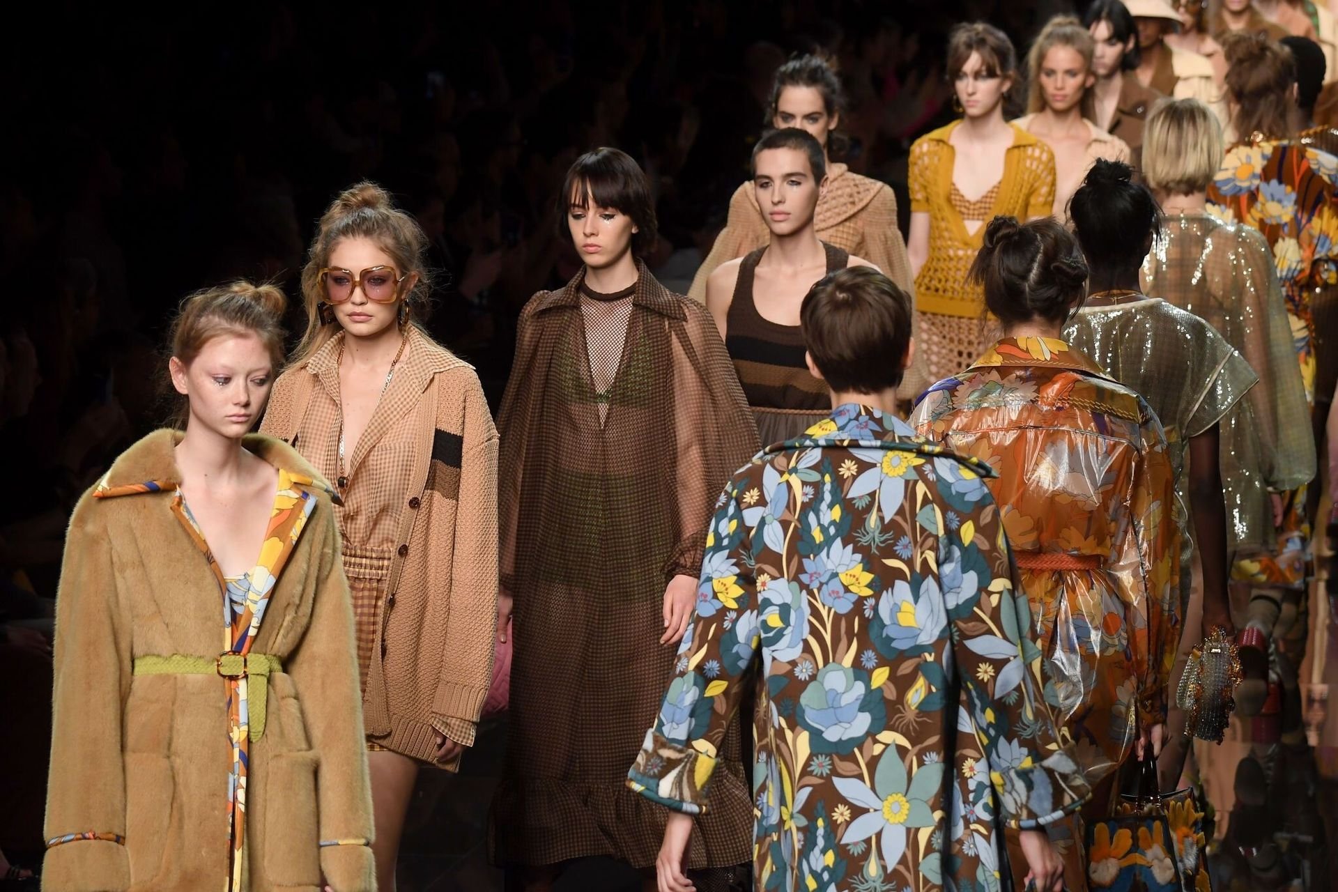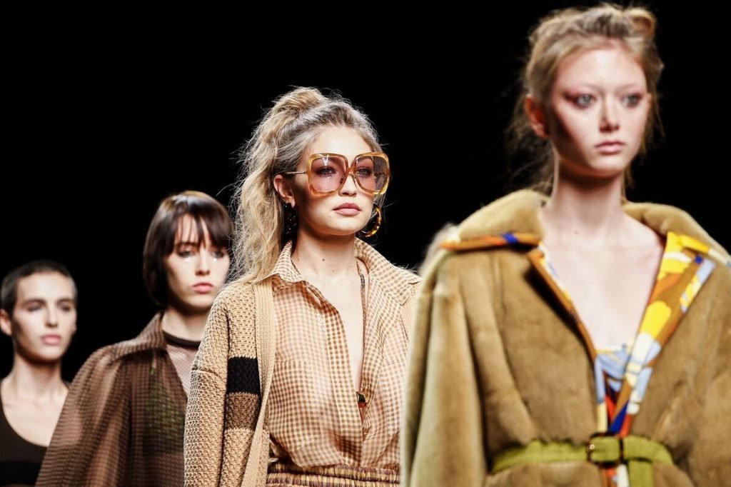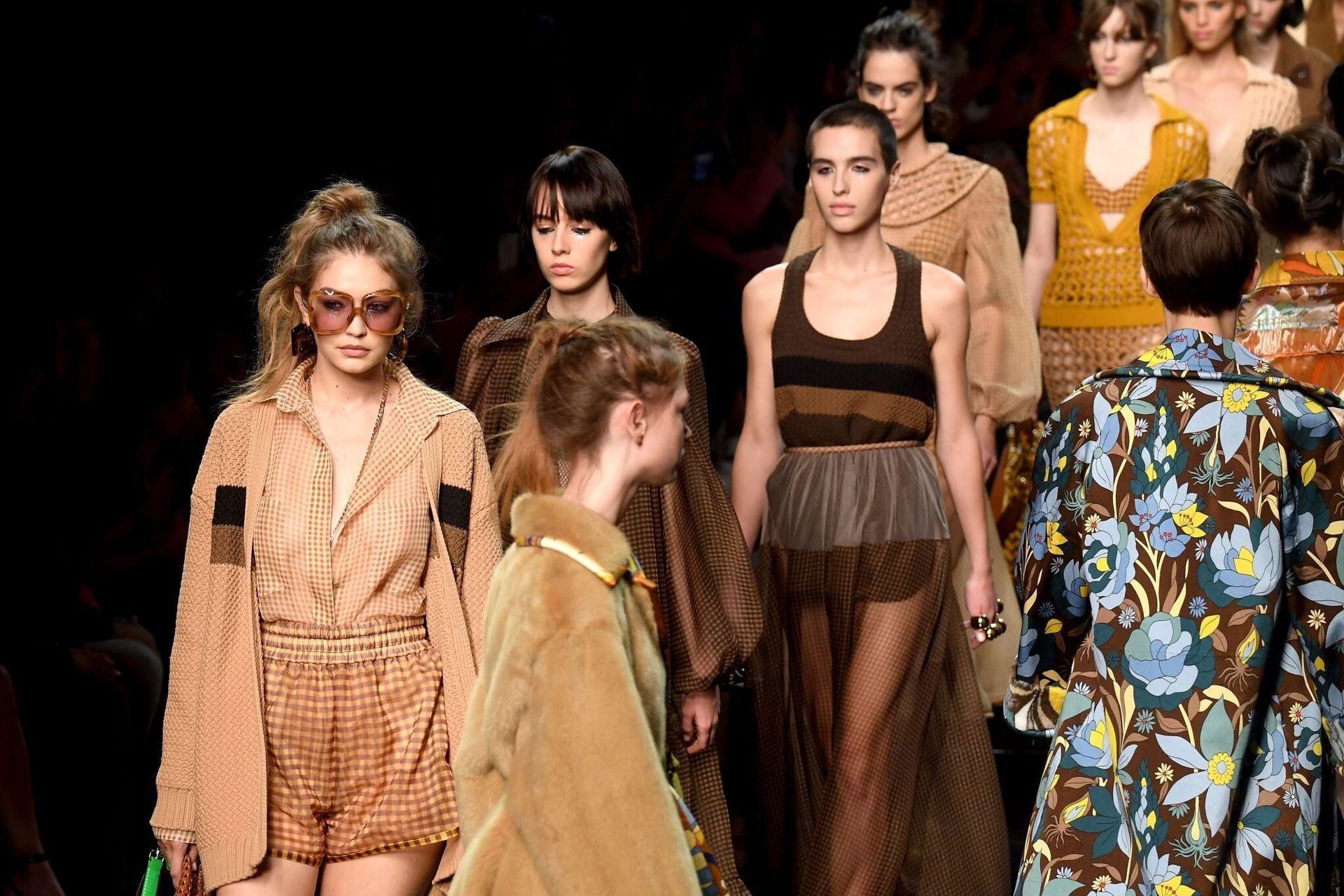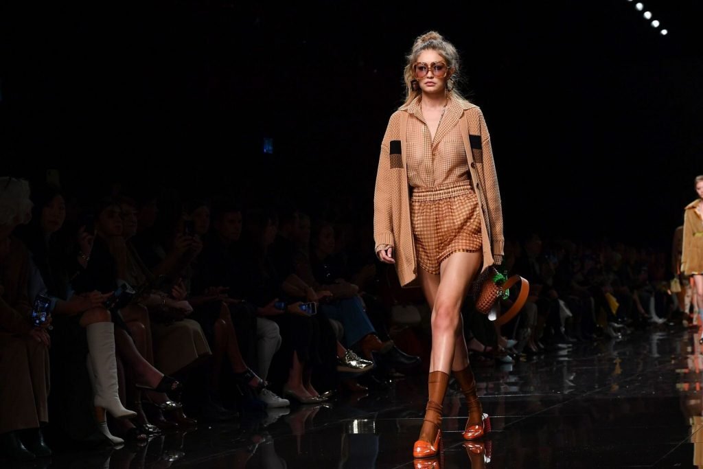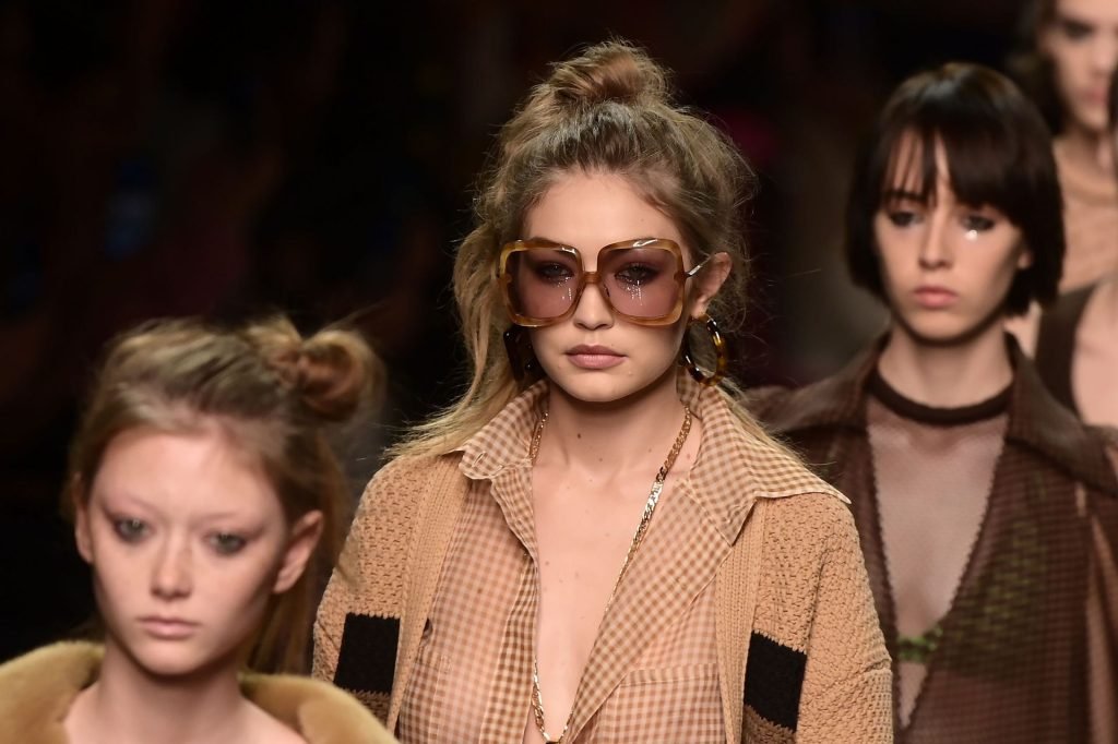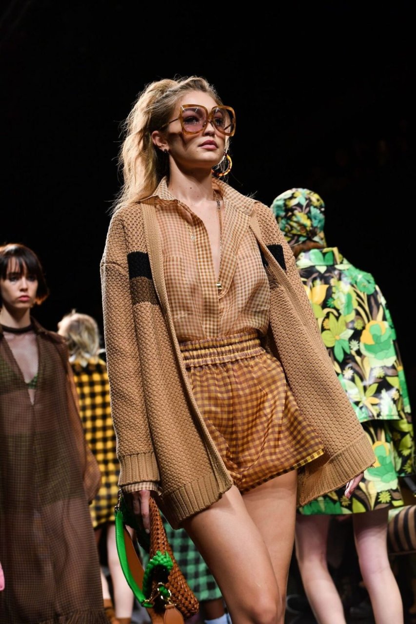 Model Gigi Hadid mostró su escote, vistiendo una camisa transparente en el desfile de Fendi durante la Semana de la Moda de Milán Primavera/Verano 2020, 19/09/2019.