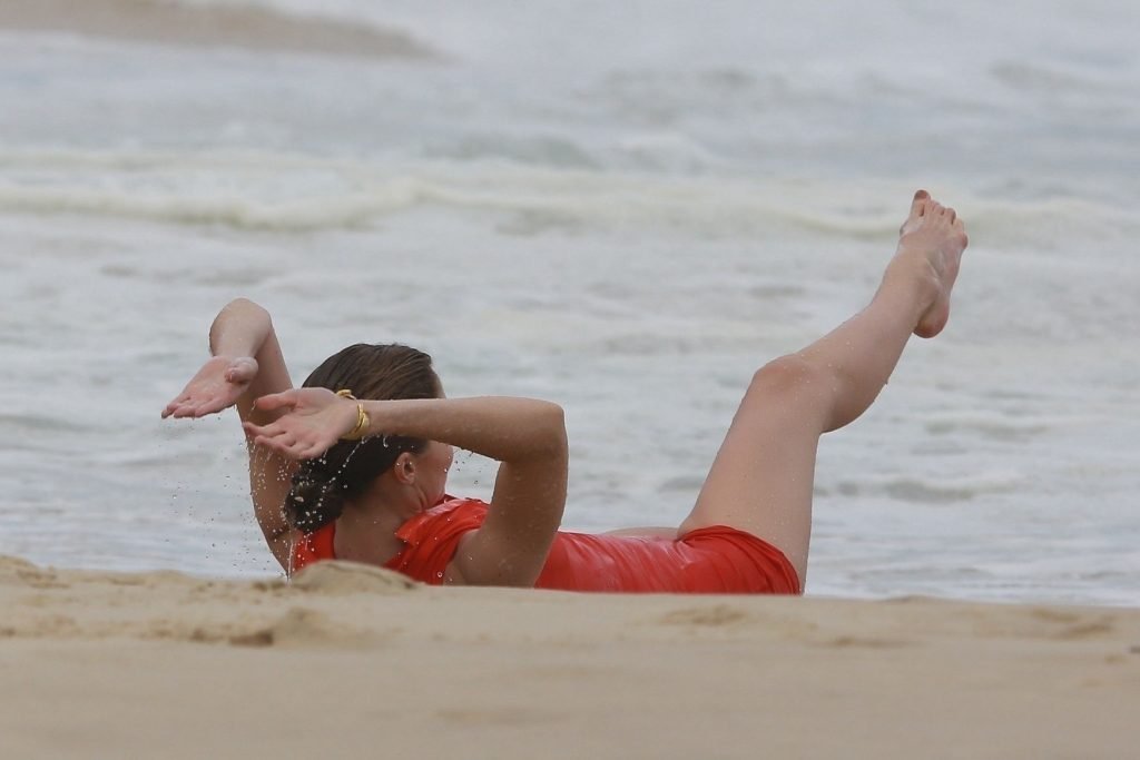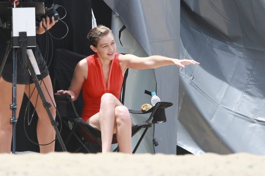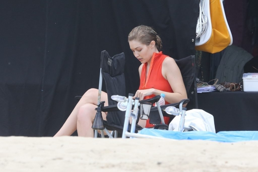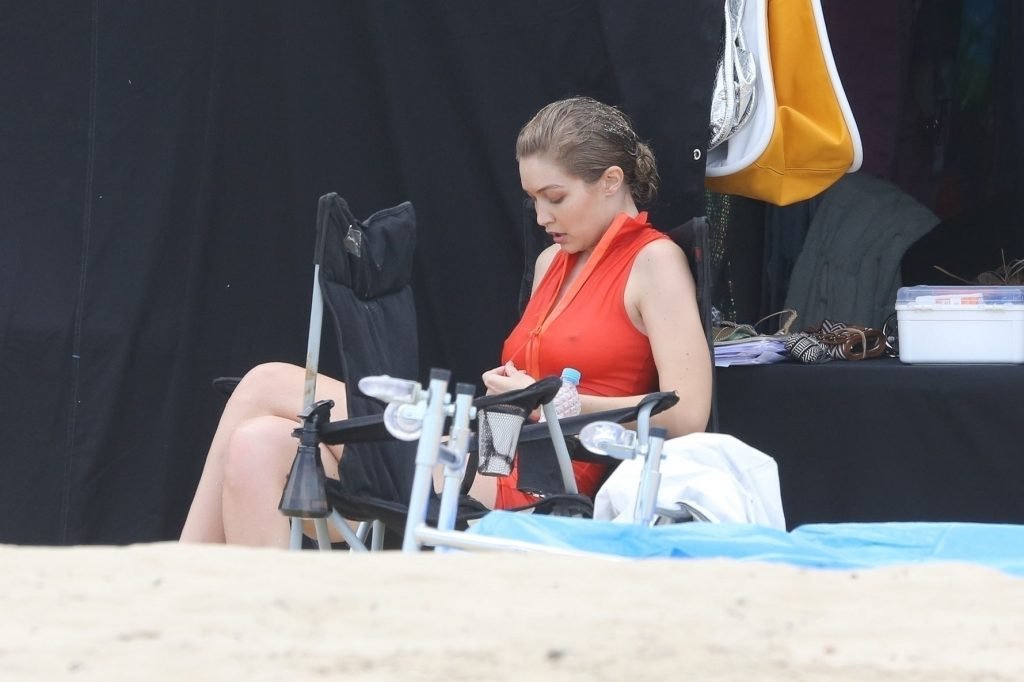 Model Gigi Hadid luce increíble con un bikini rojo de una pieza durante una sesión de fotos en la playa de Ipanema en Río, Brasil, 20/10/2018.