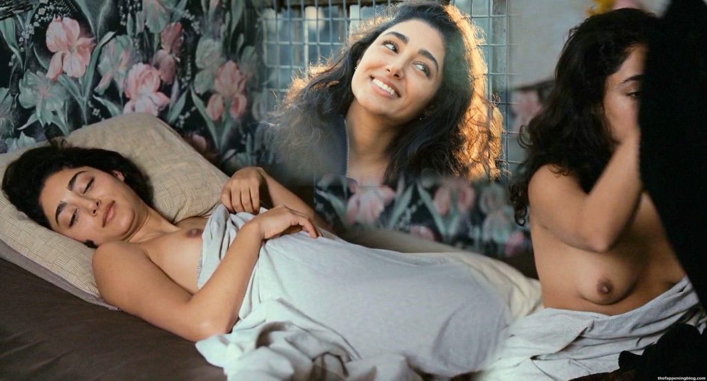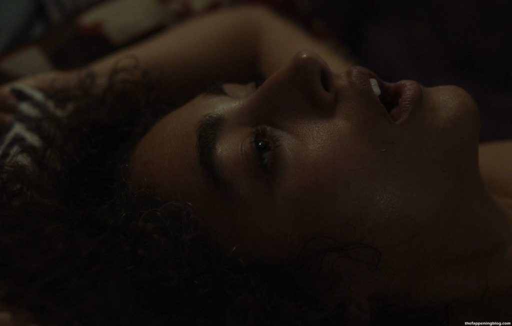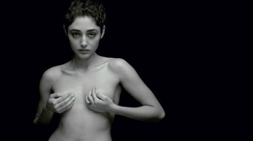 Golshifteh Farahani is hunched over naked as she squats in the corner of a room bathing herself from a bucket, showing side boob pressed against her leg and flashing her nipple briefly when she leans back a little.