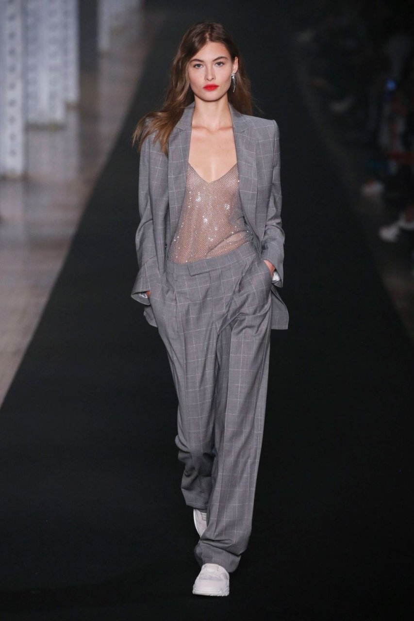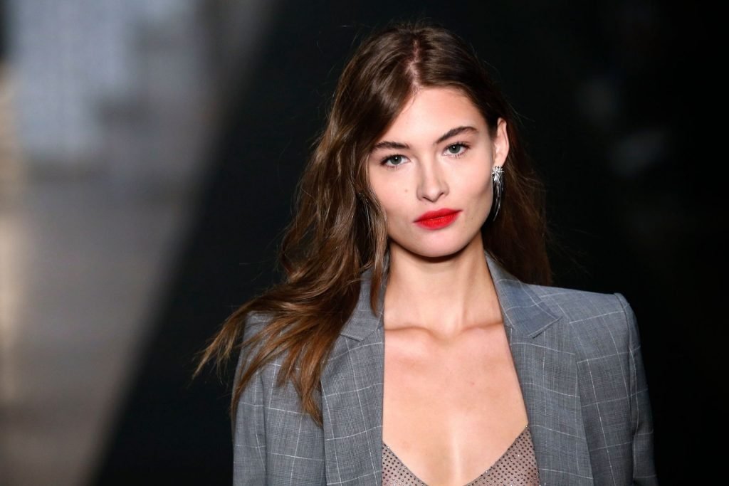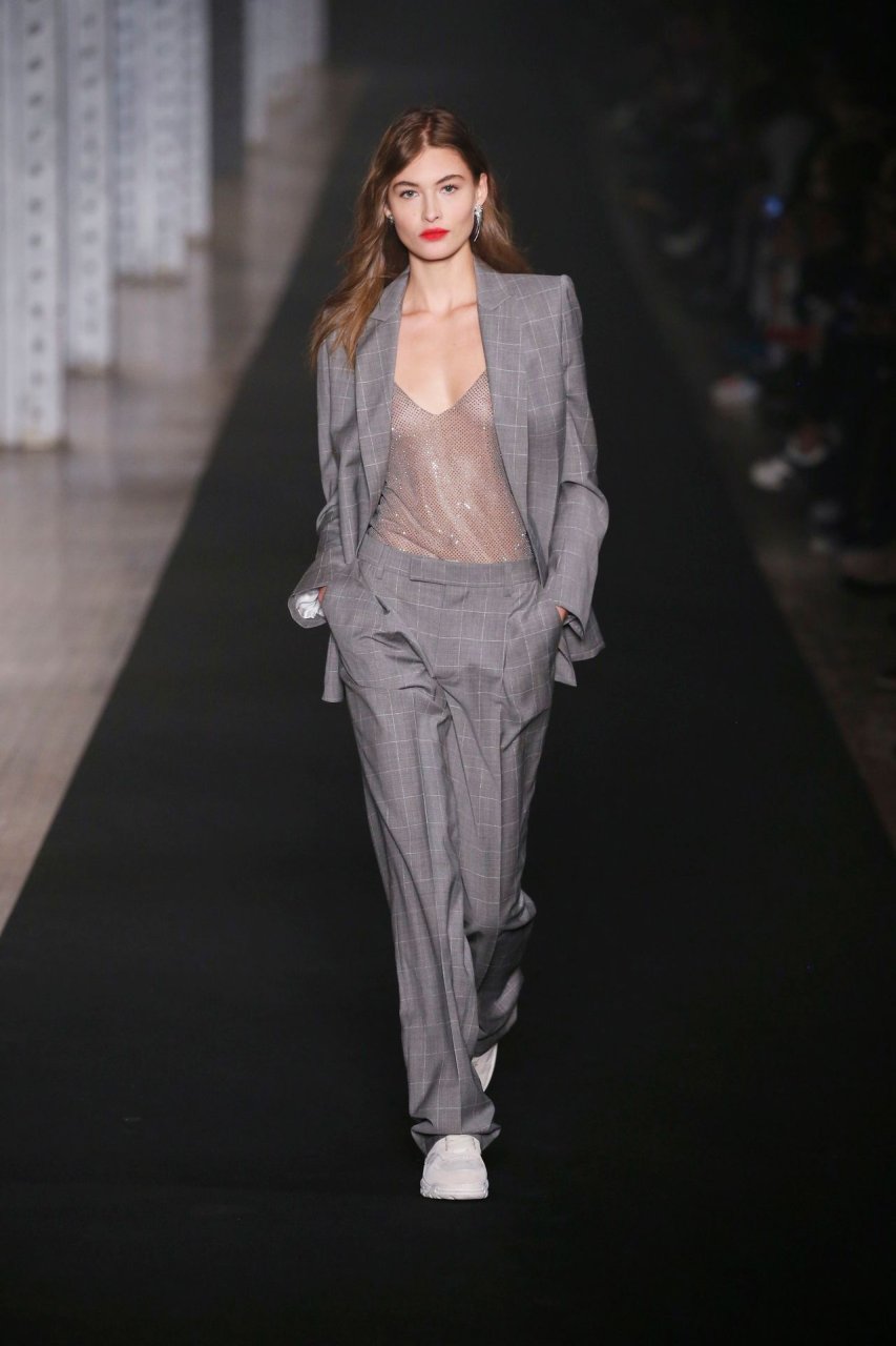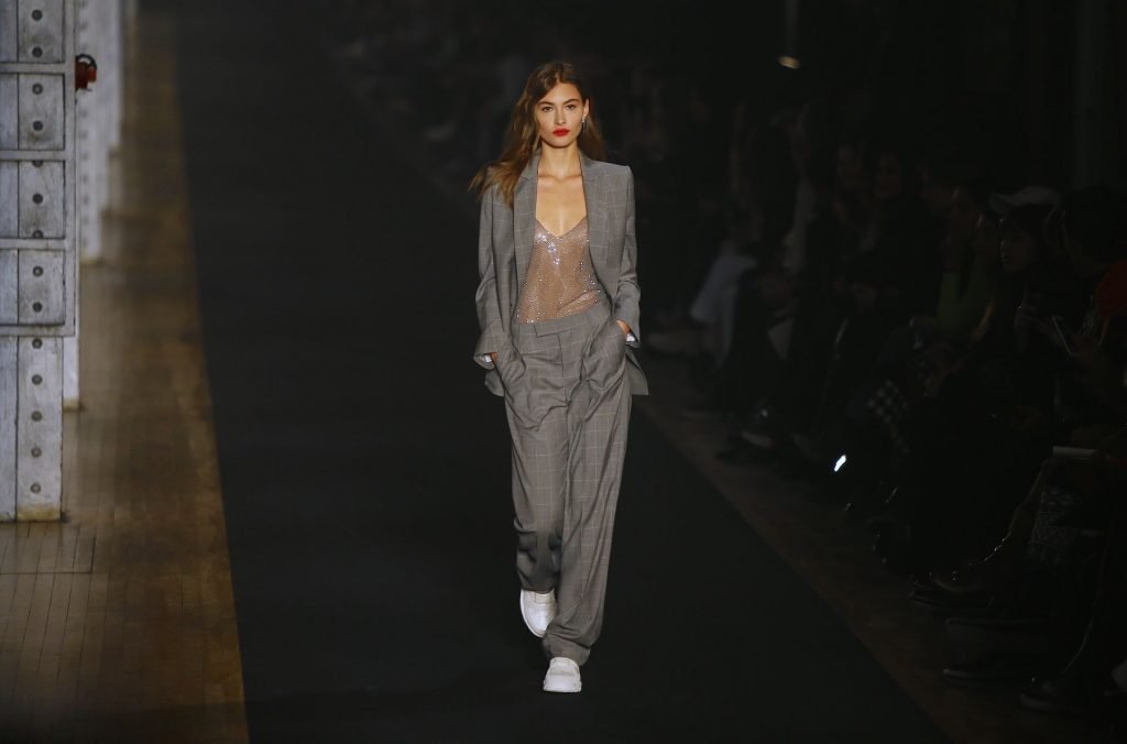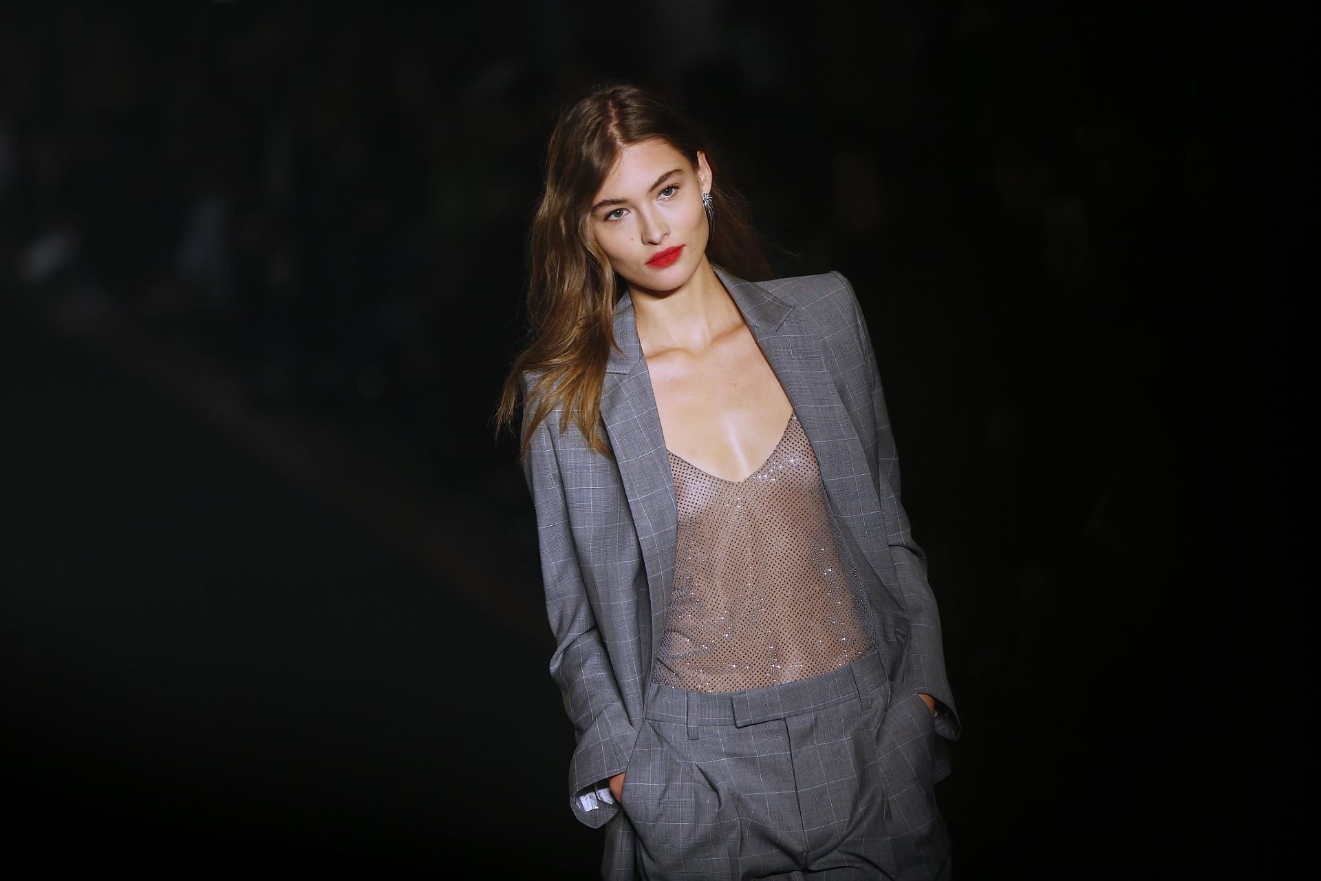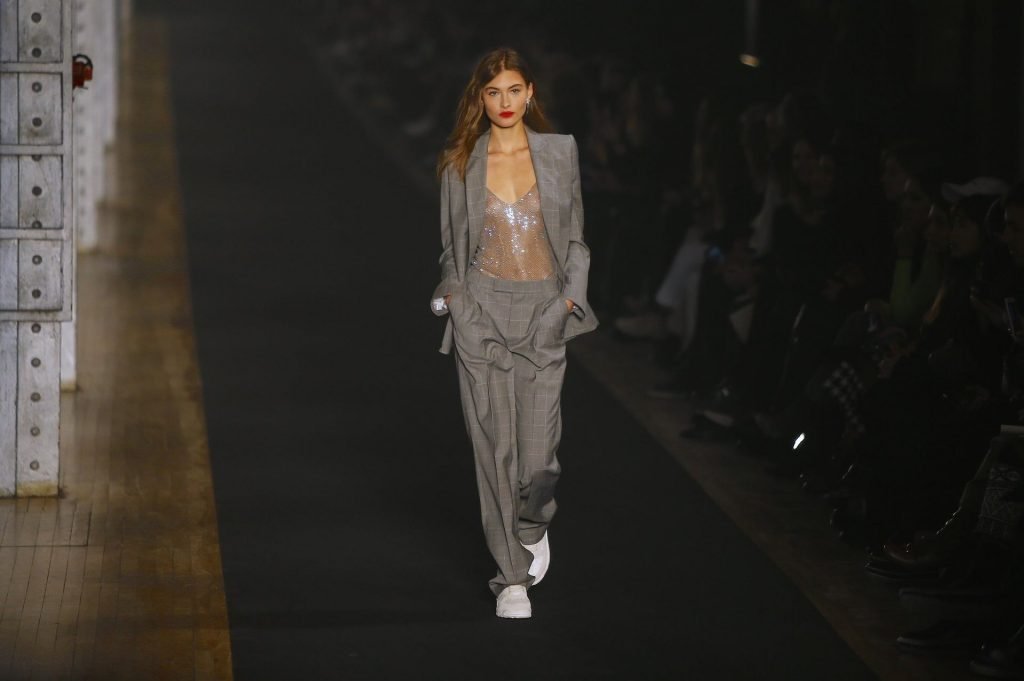 Model Grace Elizabeth camina por la pasarela con un top transparente sin sostén en el desfile de Zadig & Voltaire durante la Semana de la Moda de Nueva York en Nueva York, 13/02/2019.