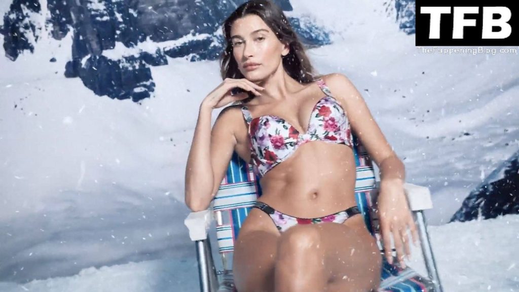Hailey, de 25 años, juega en un paisaje invernal recreado en el estudio para los nuevos accesorios que incluyen sujetadores, bragas, bodies y más. Un portavoz dijo que la nueva colección tiene “un brillo helado”.
