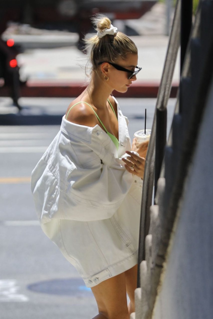 ¿Qué lleva puesto debajo de eso?! Hailey Baldwin se cubre con una chaqueta vaquera blanca de gran tamaño y lo que parece ser un sujetador deportivo verde neón o parte superior de traje de baño debajo – West Hollywood, 20/08/2019.
