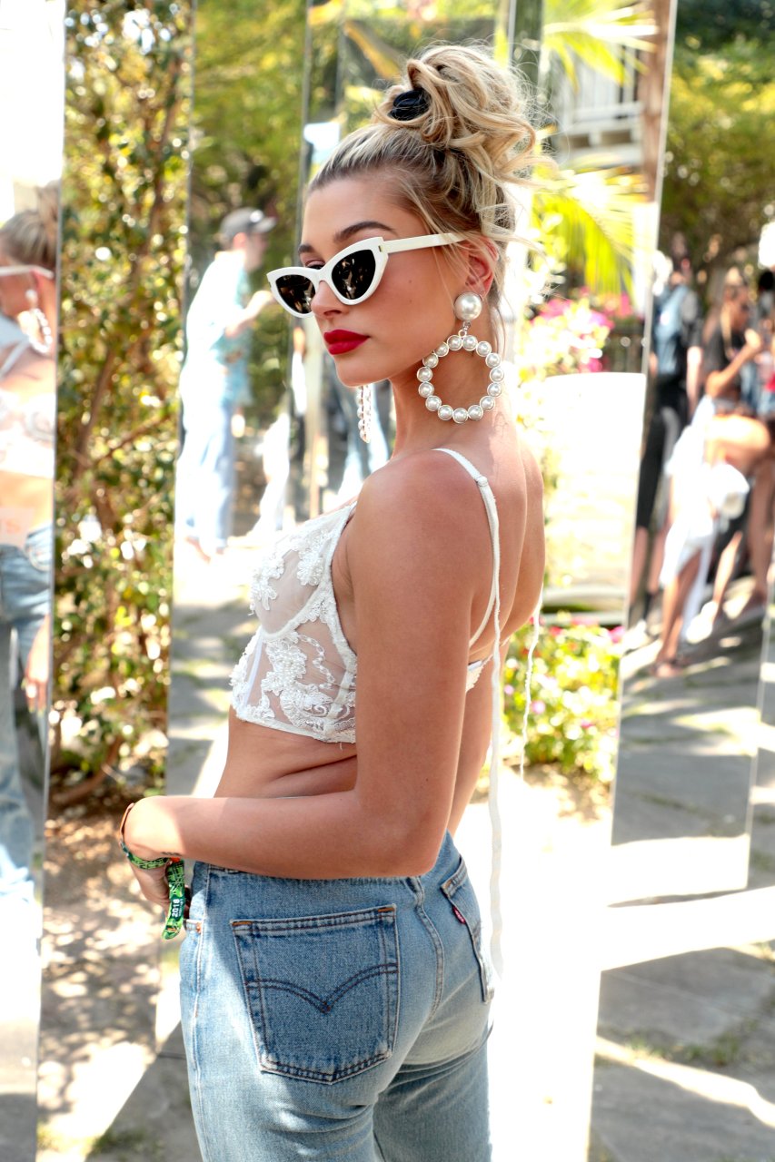 Hailey Baldwin lleva una blusa blanca de encaje transparente en el brunch de Levi’s Coachella en Palm Springs, 14/04/2018. Hailey Rhode Baldwin es una modelo de moda estadounidense de 21 años, estrella de televisión y actriz (Ocean’s 8 (2018)).