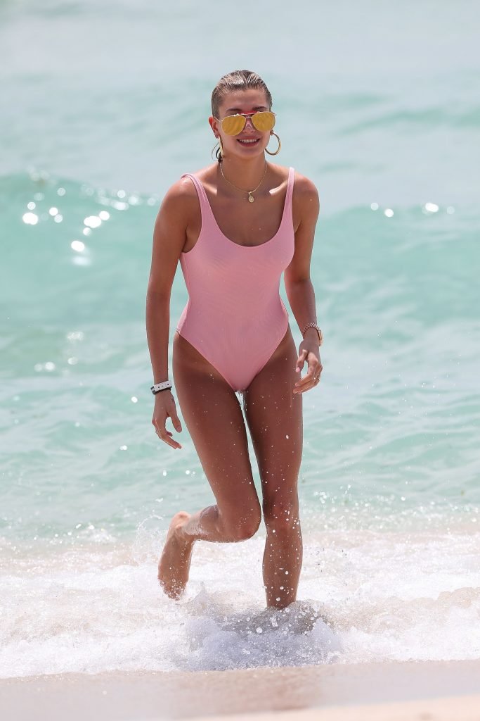Hailey Baldwin lleva un traje de baño de una pieza color rosa pálido en la playa de Miami, 10/06/2017. Hailey Rhode Baldwin es una modelo y actriz estadounidense de Tucson. Edad – 20.
