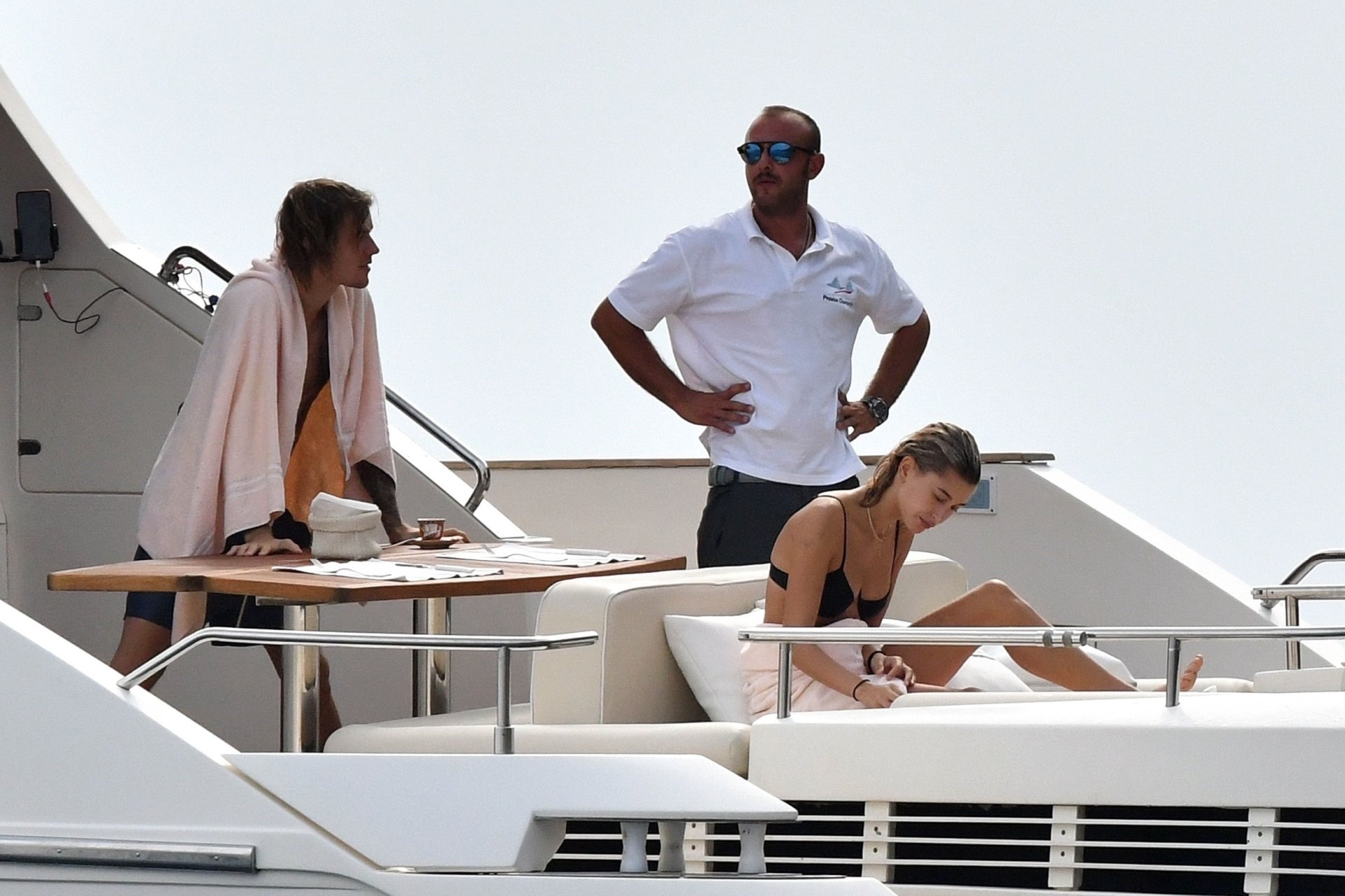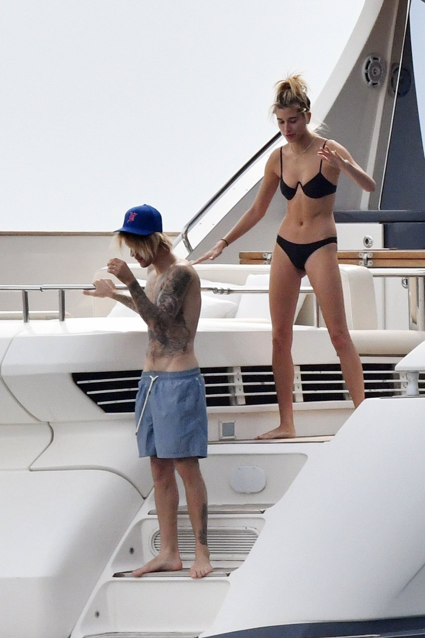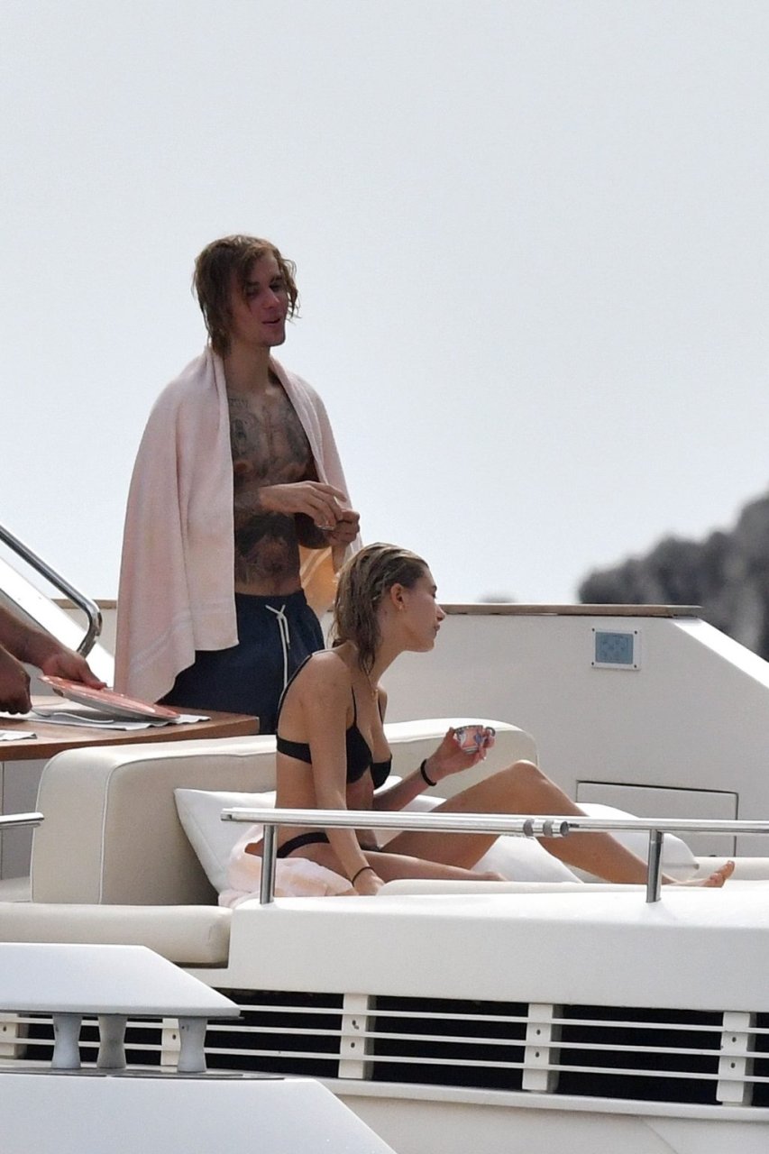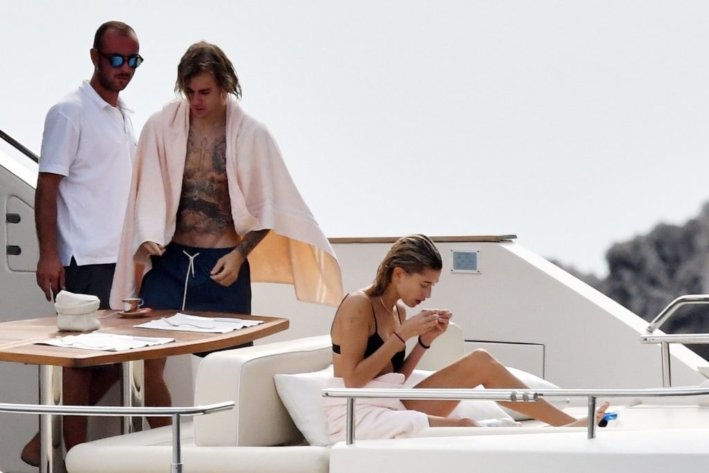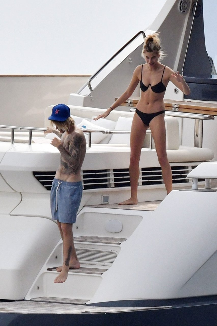 Los tortolitos muestran su cariño durante el almuerzo en su yate después de algunas compras en la ciudad y de saludar a jóvenes fans. Hailey muestra su figura delgada con un bikini negro para un chapuzón en el océano, 21/09/2018.