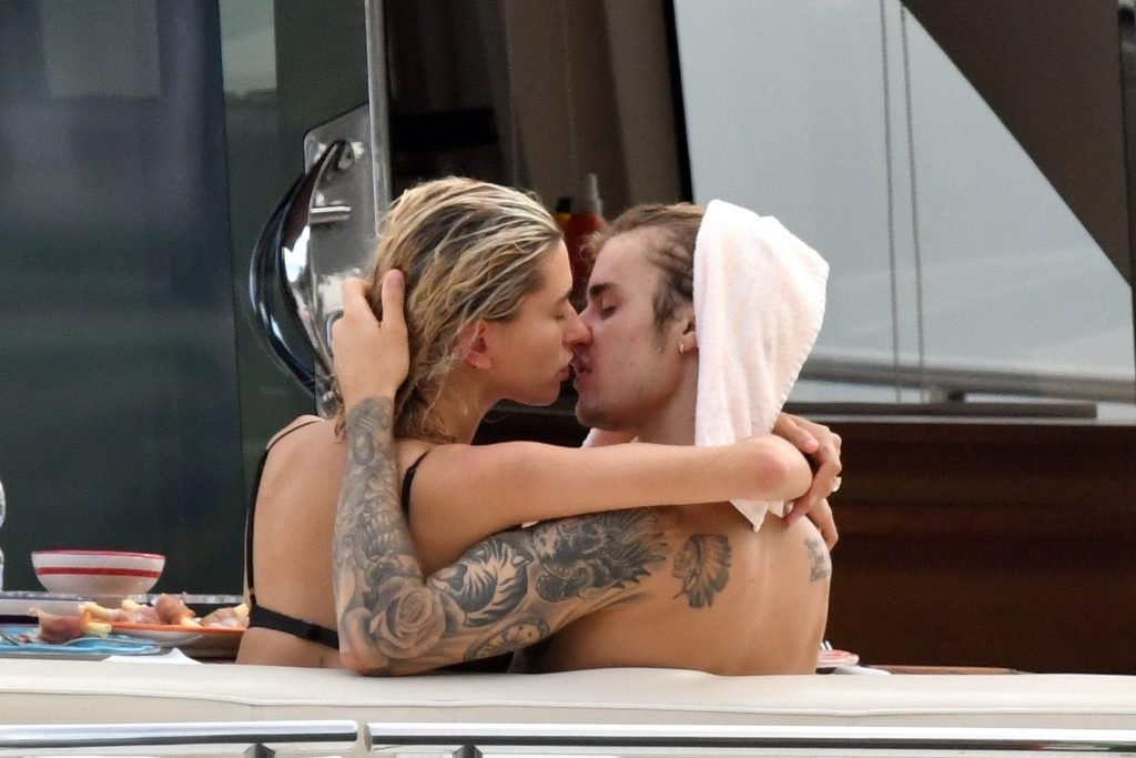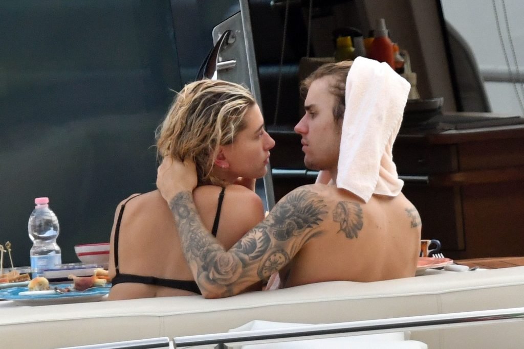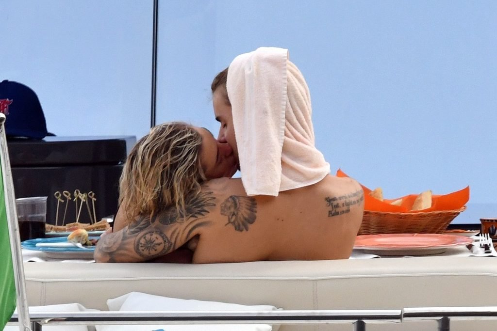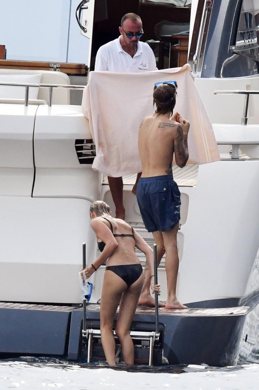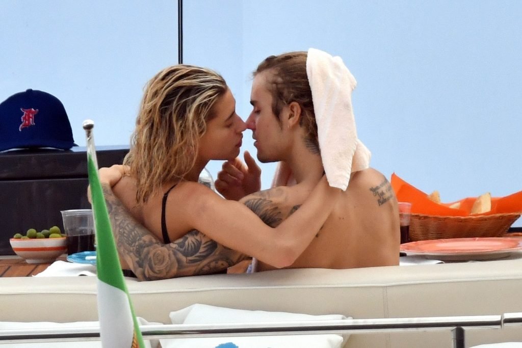 Los tortolitos muestran su cariño durante el almuerzo en su yate después de algunas compras en la ciudad y de saludar a jóvenes fans. Hailey muestra su figura delgada con un bikini negro para un chapuzón en el océano, 21/09/2018.