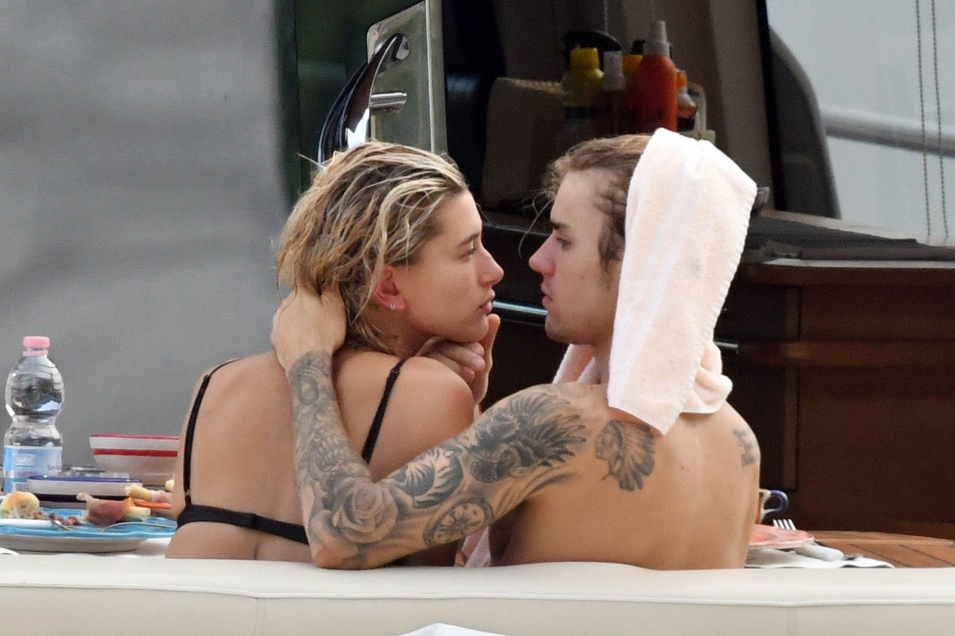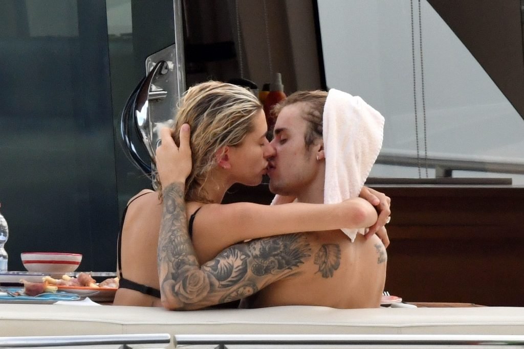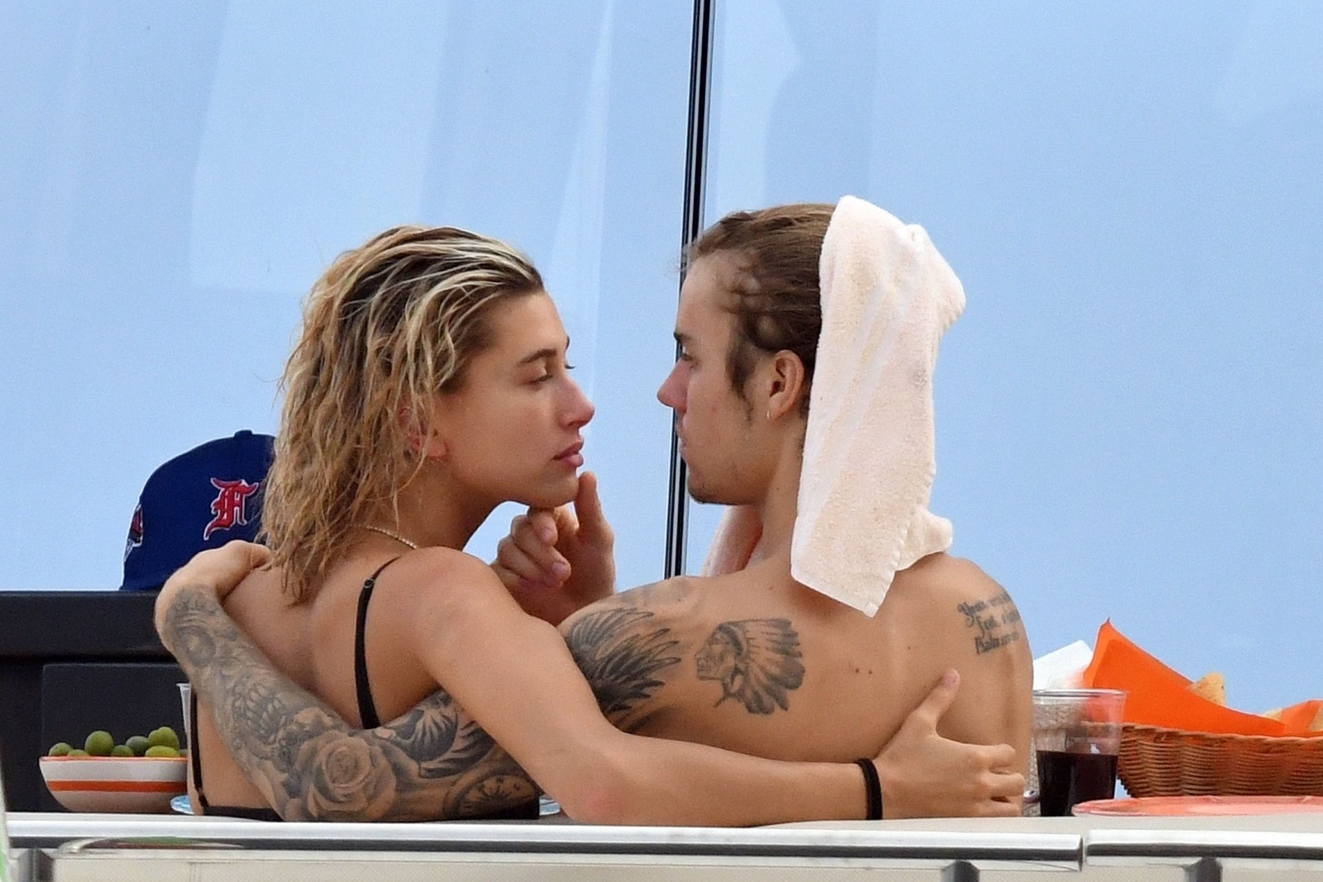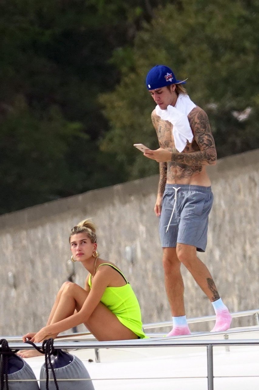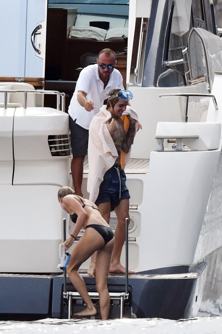 Los tortolitos muestran su cariño durante el almuerzo en su yate después de algunas compras en la ciudad y de saludar a jóvenes fans. Hailey muestra su figura delgada con un bikini negro para un chapuzón en el océano, 21/09/2018.
