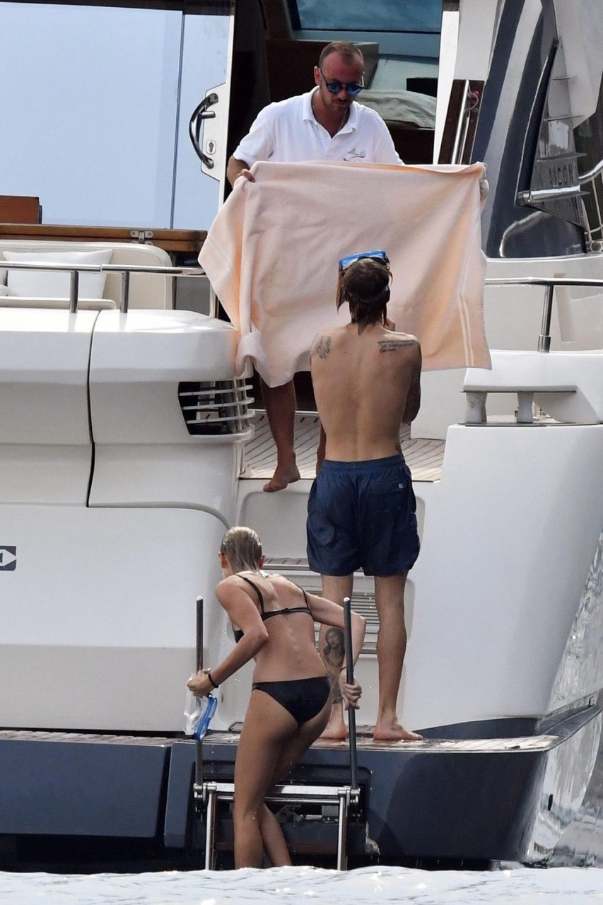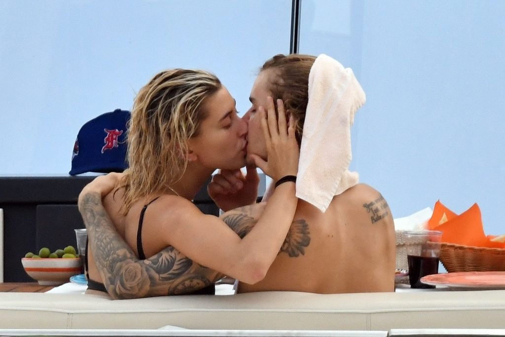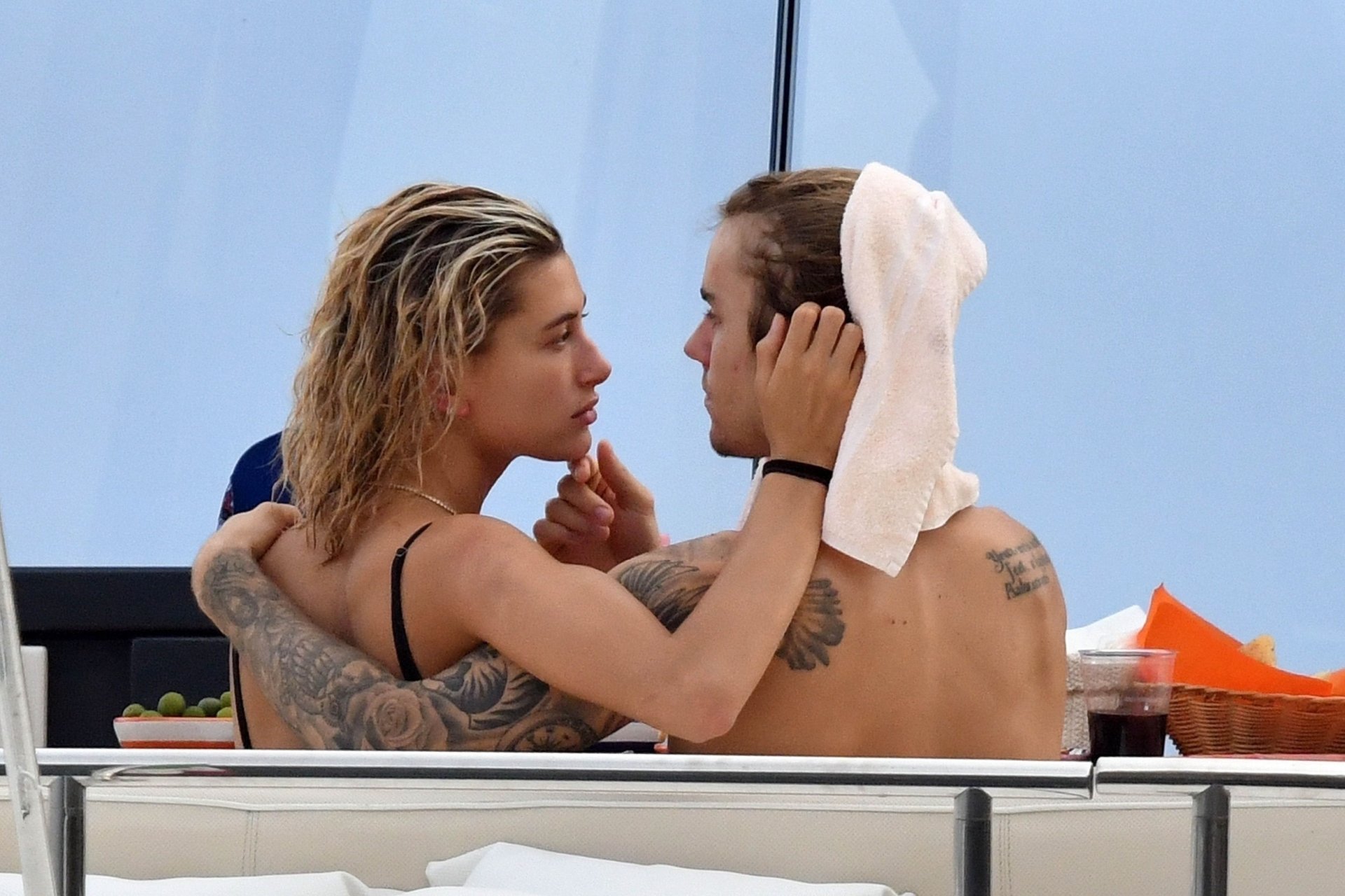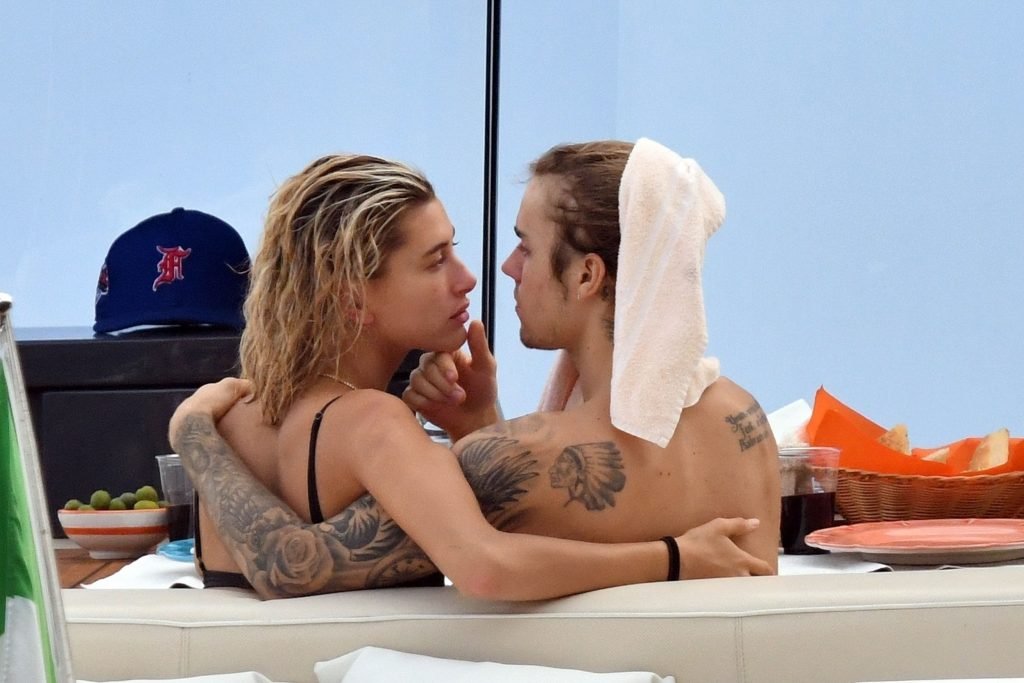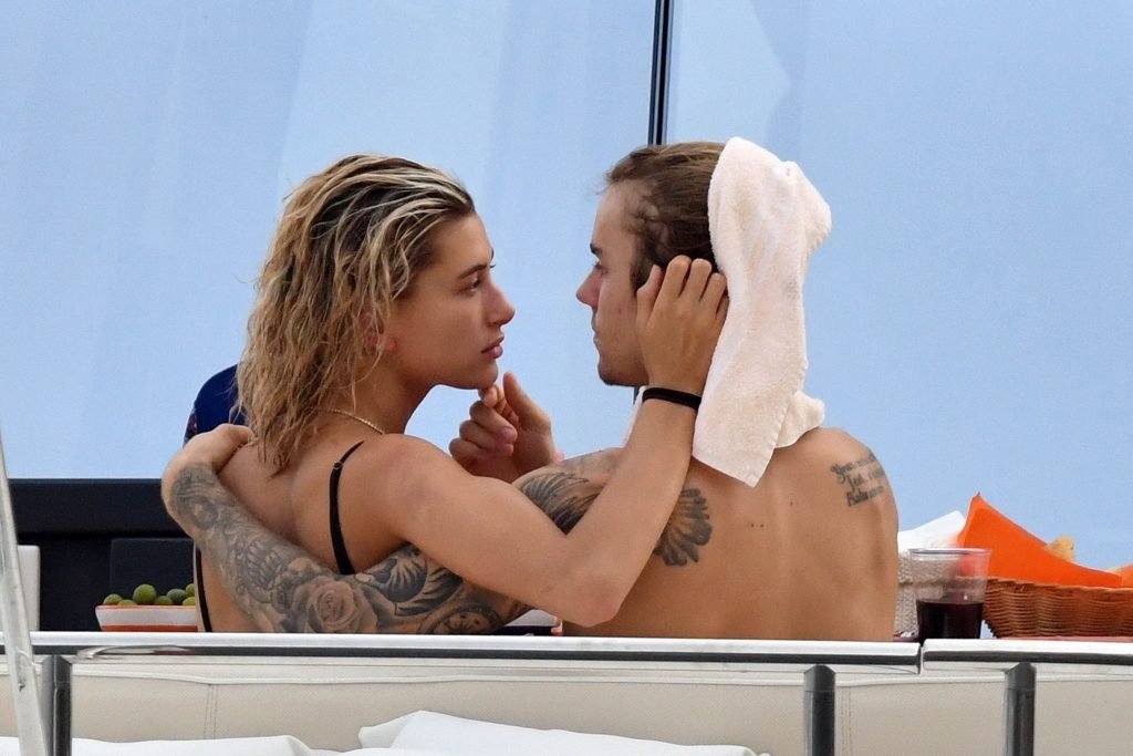 Los tortolitos muestran su cariño durante el almuerzo en su yate después de algunas compras en la ciudad y de saludar a jóvenes fans. Hailey muestra su figura delgada con un bikini negro para un chapuzón en el océano, 21/09/2018.