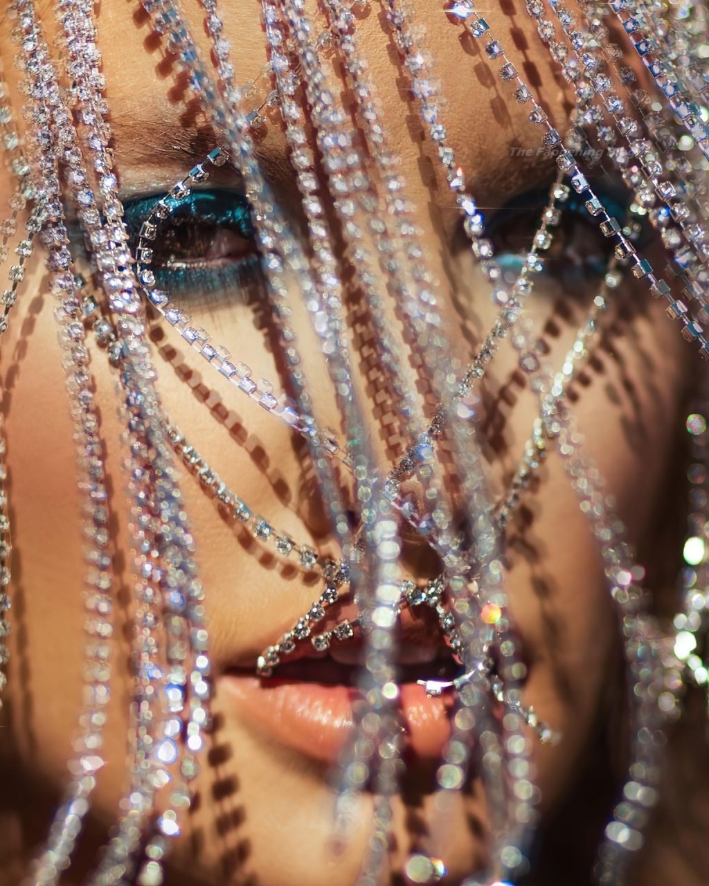 Model Haley Kalil posa desnuda de pecho, cubriendo sus pechos con pasties en una sesión fotográfica de Olya Helga (2021).