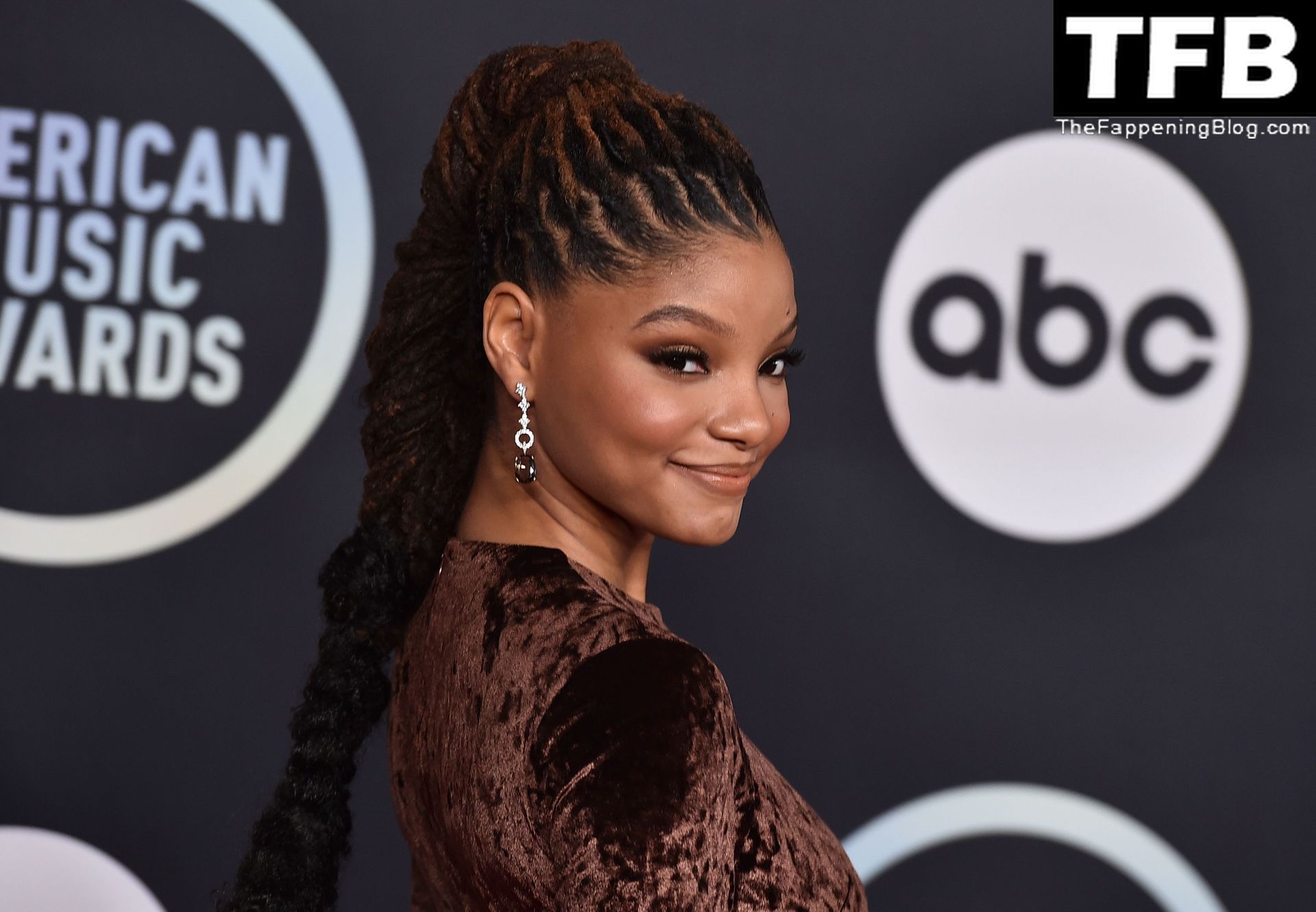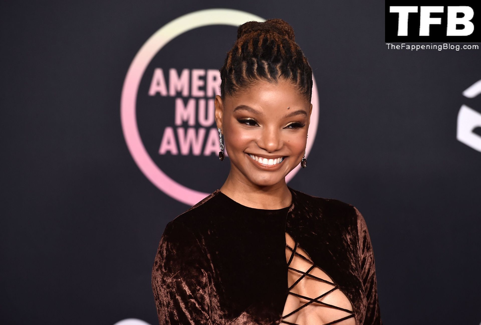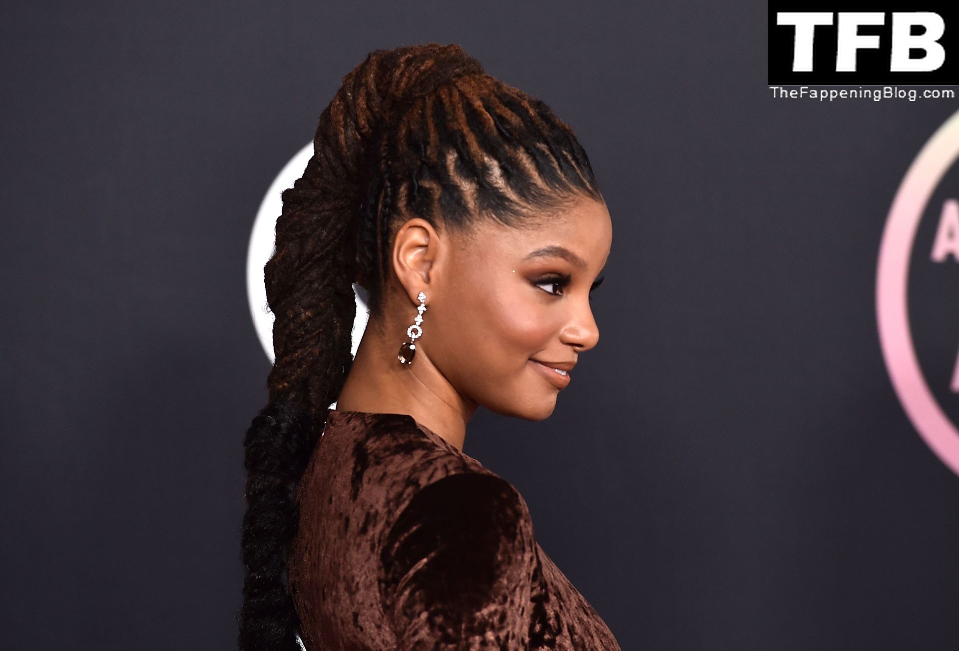 La actriz Halle Bailey posa sin sostén en la alfombra roja, mostrando un bonito underboob en los American Music Awards en el Microsoft Theater de Los Ángeles, 21/11/2021.
