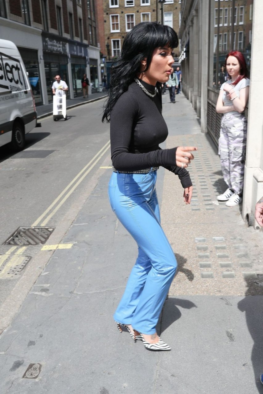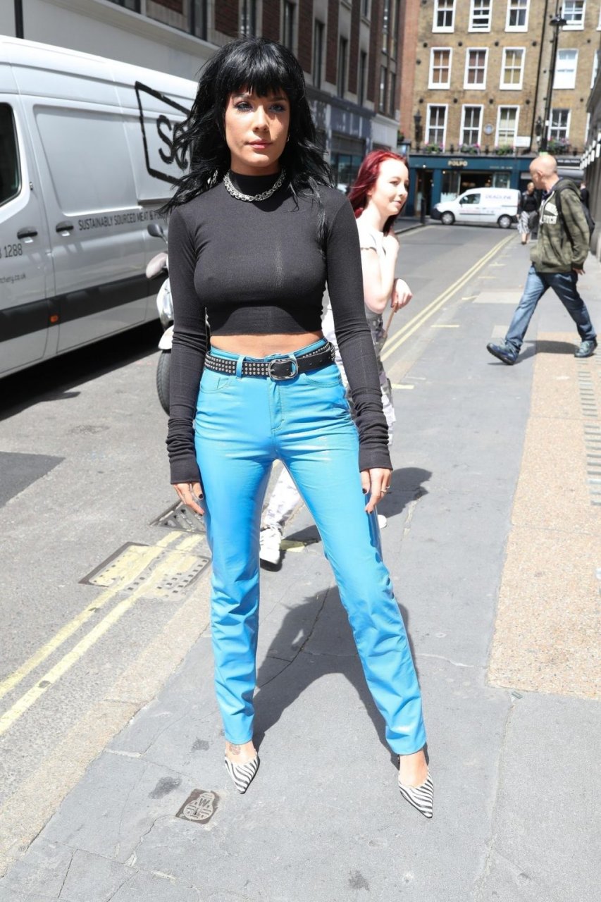 La cantante y compositora estadounidense Halsey aparece sin sostén con un top ajustado y pantalones azul eléctrico llegando a los estudios de KISS FM en Londres, 05/06/2019.