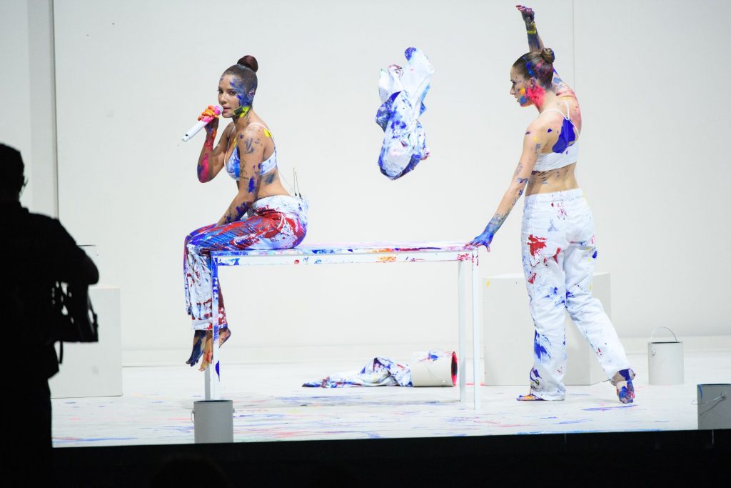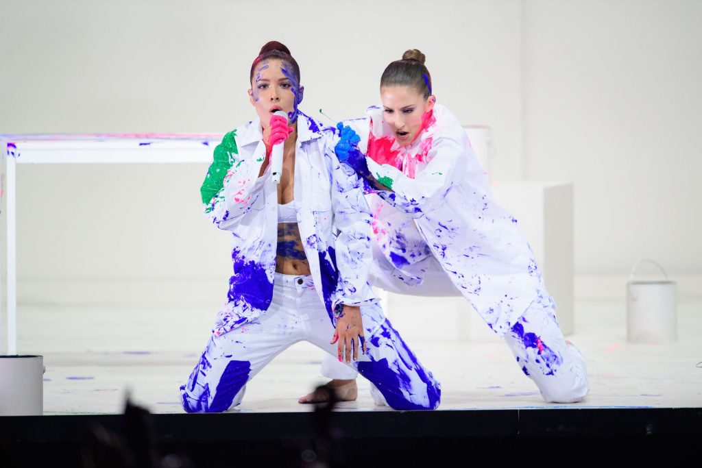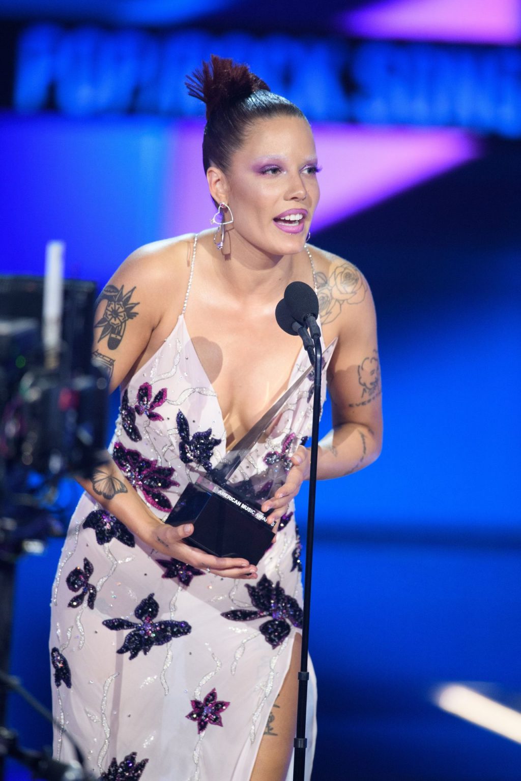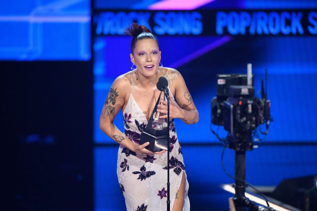 La cantante Halsey mostró sus pechos en el escenario mientras actuaba en los American Music Awards 2019 en Los Ángeles, 24/11/2019. Halsey estaba cubierta de pintura, y luego recibió el premio.