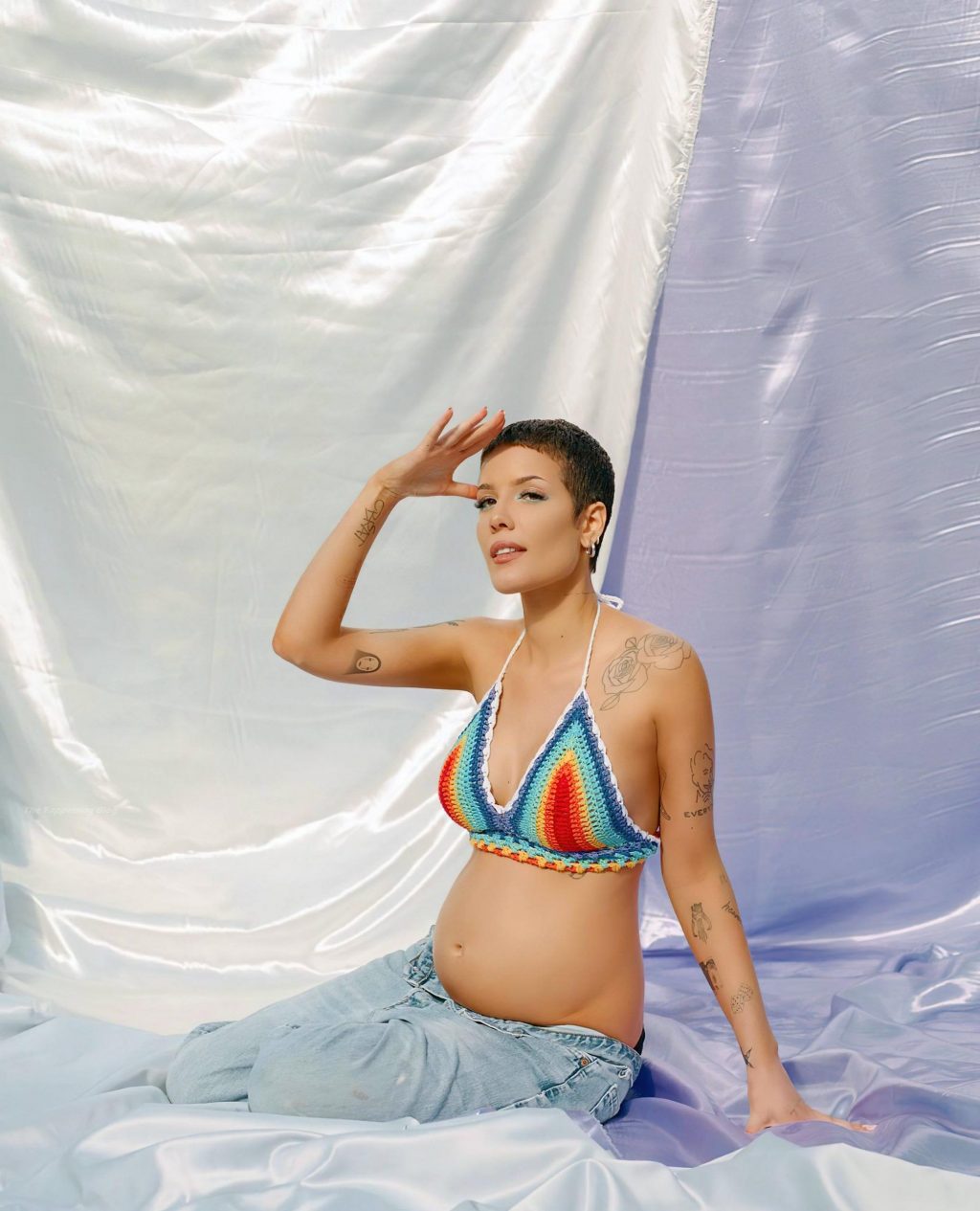 Check this out, guys! Here are some new photos of Halsey topless! She has just recently announced that she is pregnant! She posed topless for the announcement photos! Halsey poses in a knitted top and topless, hiding her bare breasts, for her latest pregnant portraits by Alev Aydin (January 2021).