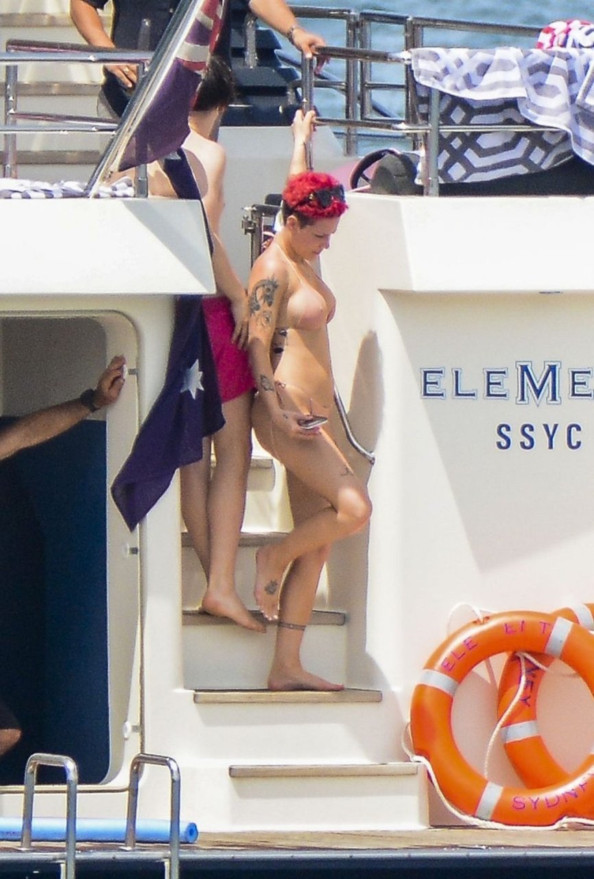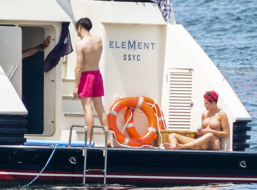 ¡Ella está viviendo la buena vida! Halsey y su supuesto novio Yungblud fueron vistos juntos, relajándose en un superyate de lujo en el puerto de Sídney con amigos, 17/02/2019.
