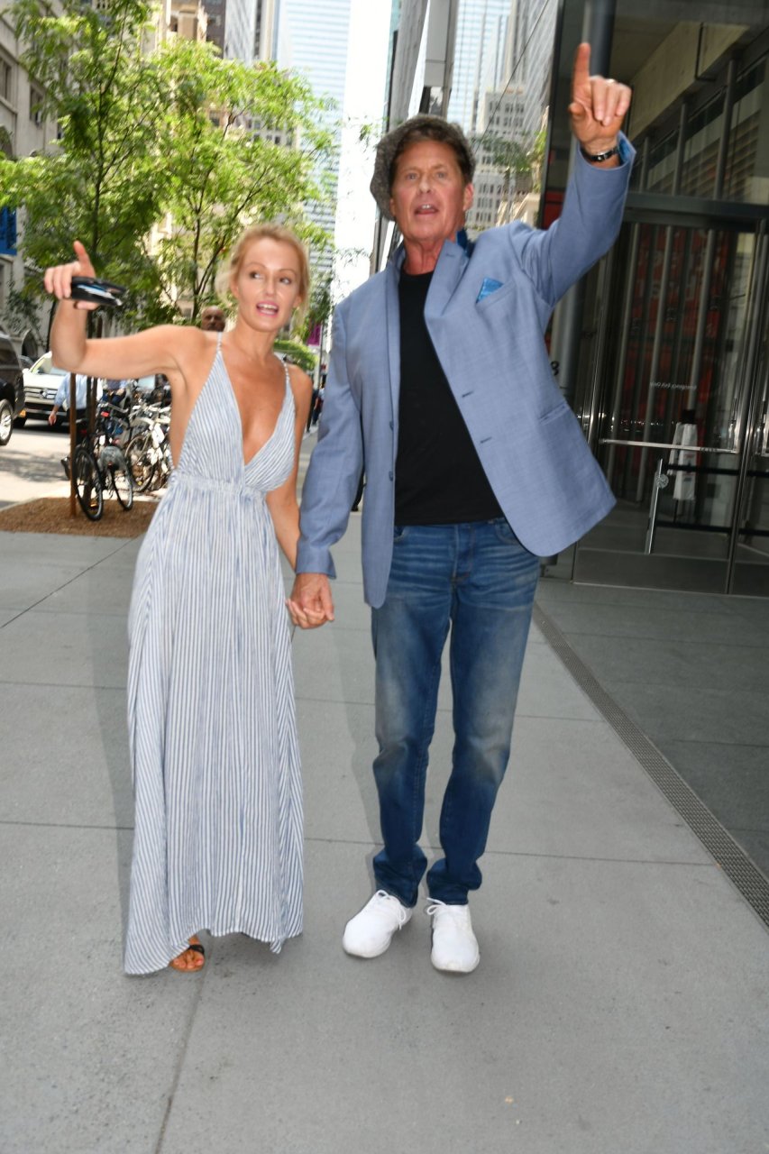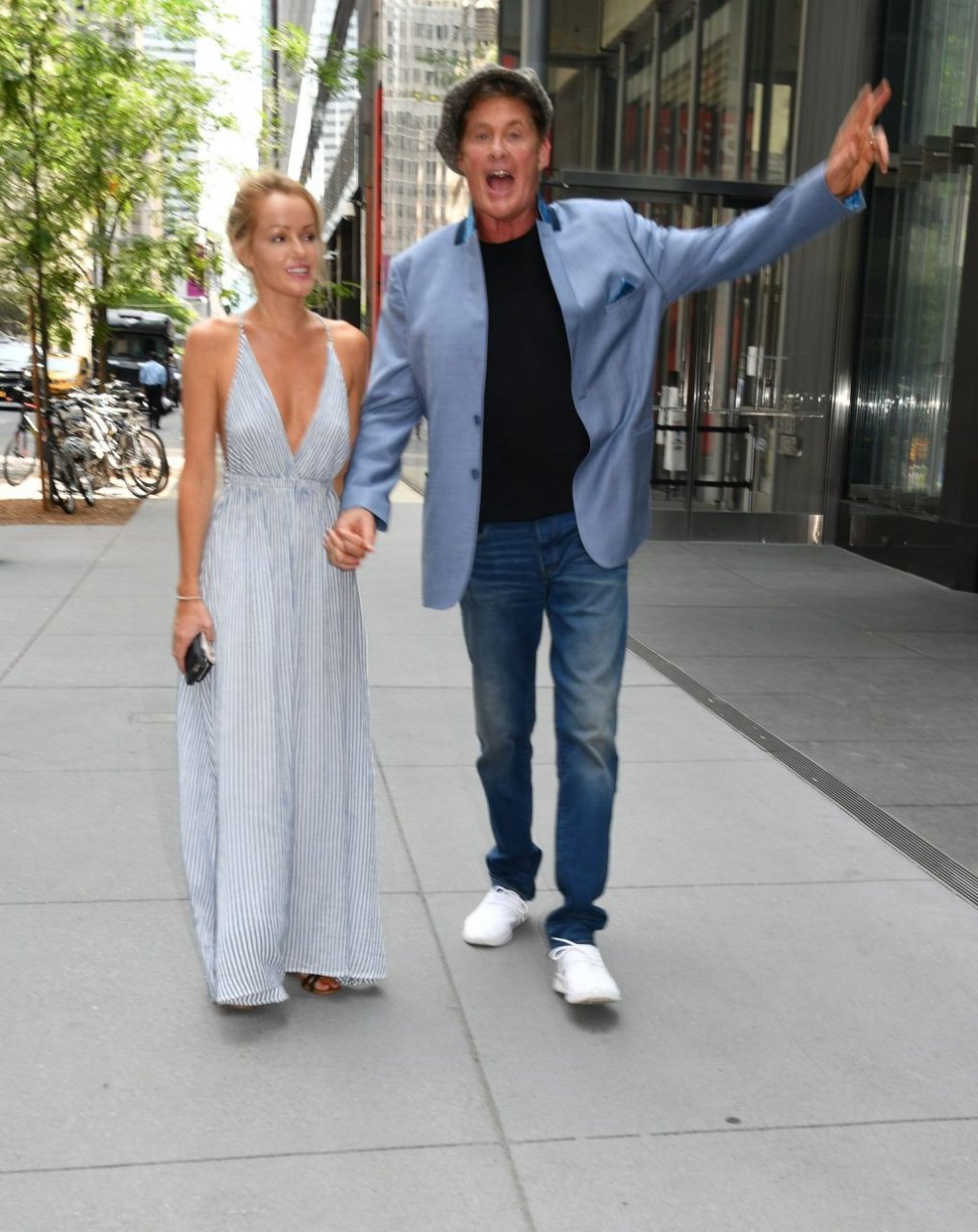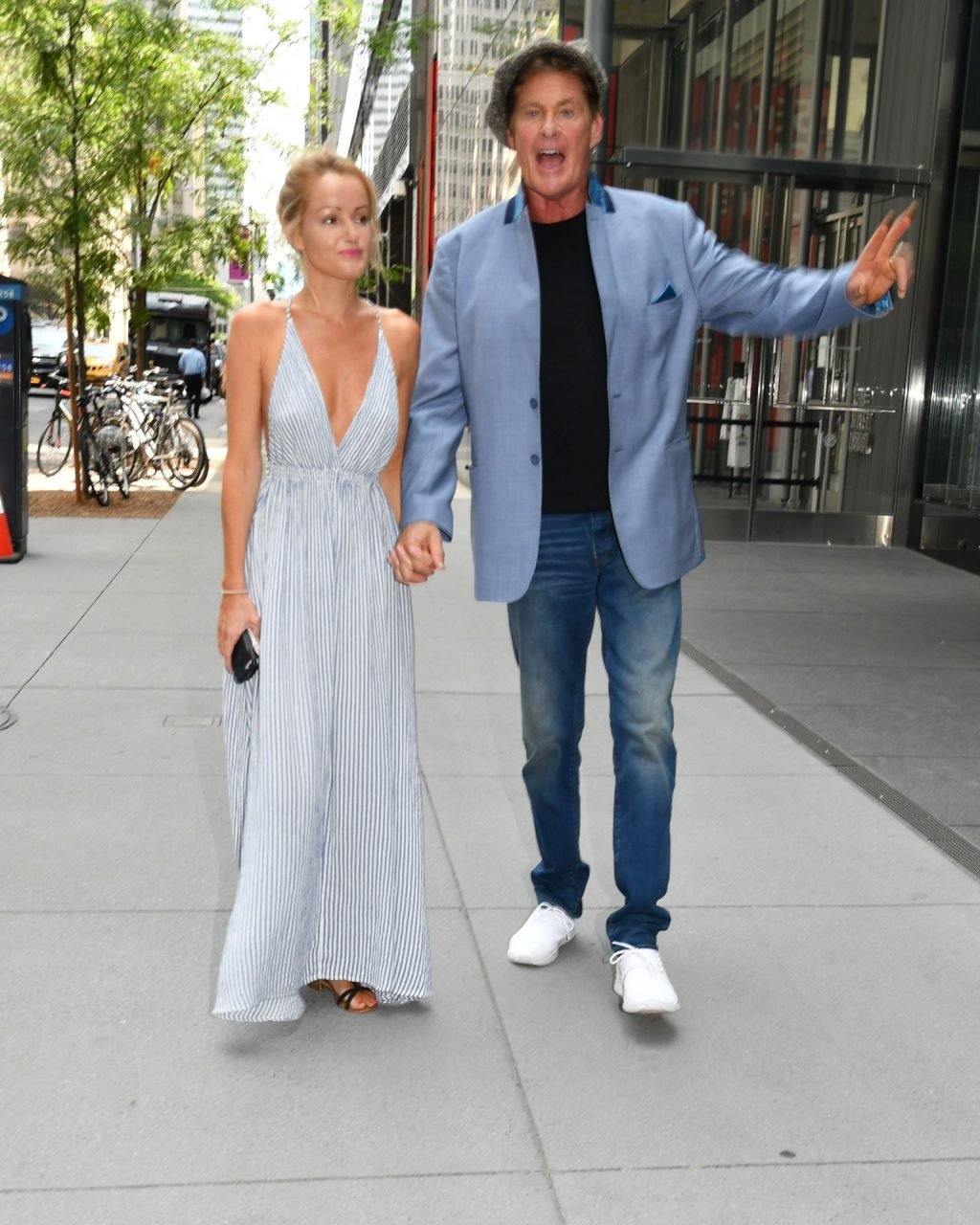 David Hasselhoff y Hayley Roberts están sonriendo mientras comparten un beso en la ciudad de Nueva York, 07/10/2019. La actriz de 38 años llevaba un vestido azul claro sin sujetador.