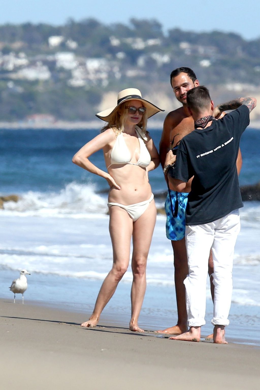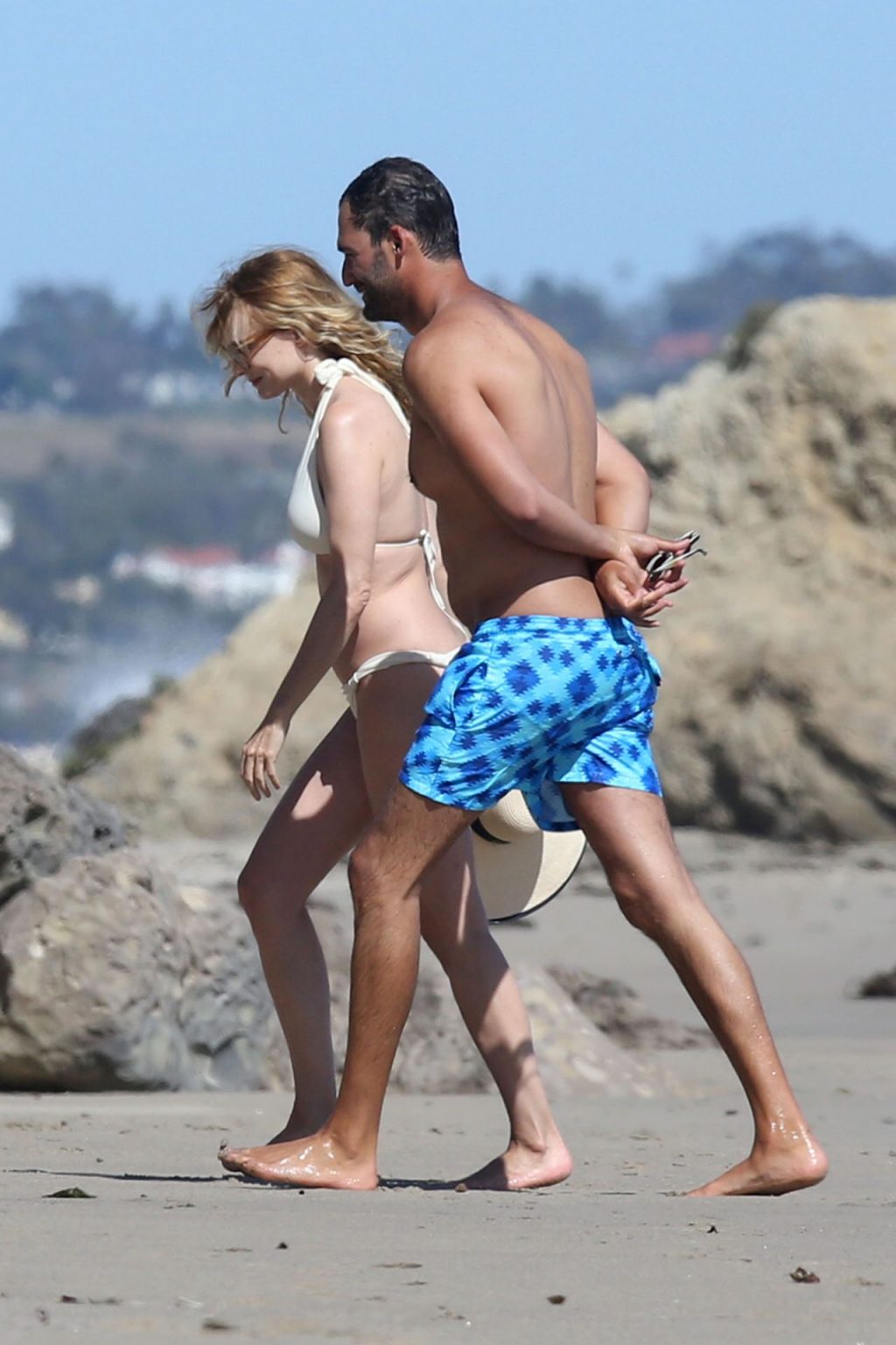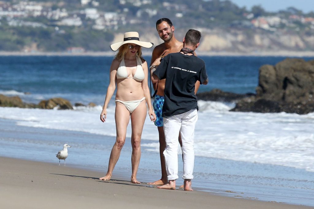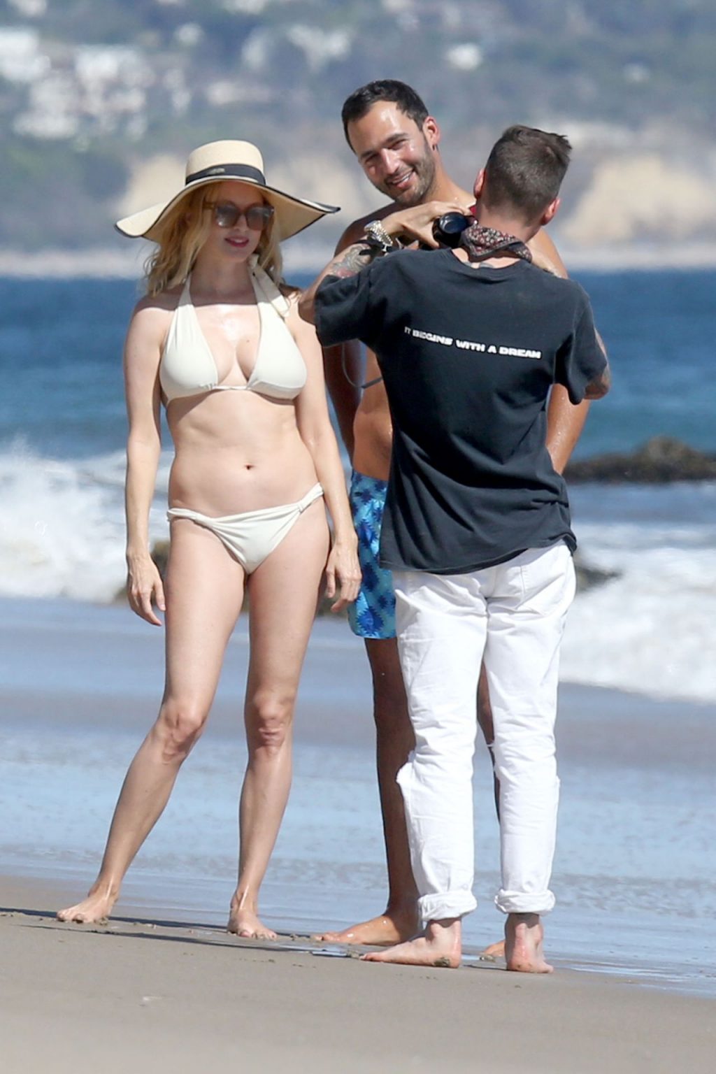 Vestida con un bikini color marfil, Heather se cuidó de proteger su piel con un enorme sombrero de ala ancha y gafas de sol. En un momento, un amigo en común bajó para unirse a ellos en la orilla y tomarles una foto. Heather y su amigo posaron felices para la instantánea. Pasando alrededor de 20 minutos riendo y charlando, la pareja luego regresó por la playa, con el viento soplando el cabello de Heather sobre su rostro mientras reajustaba su sombrero.