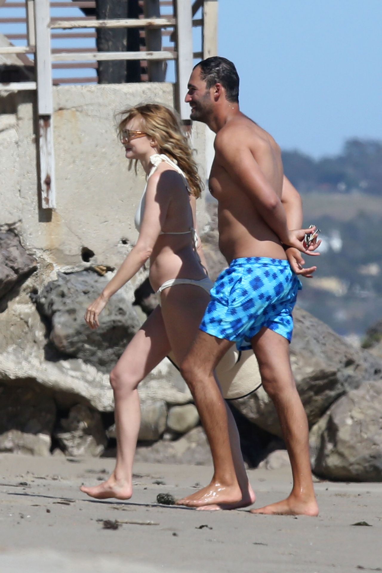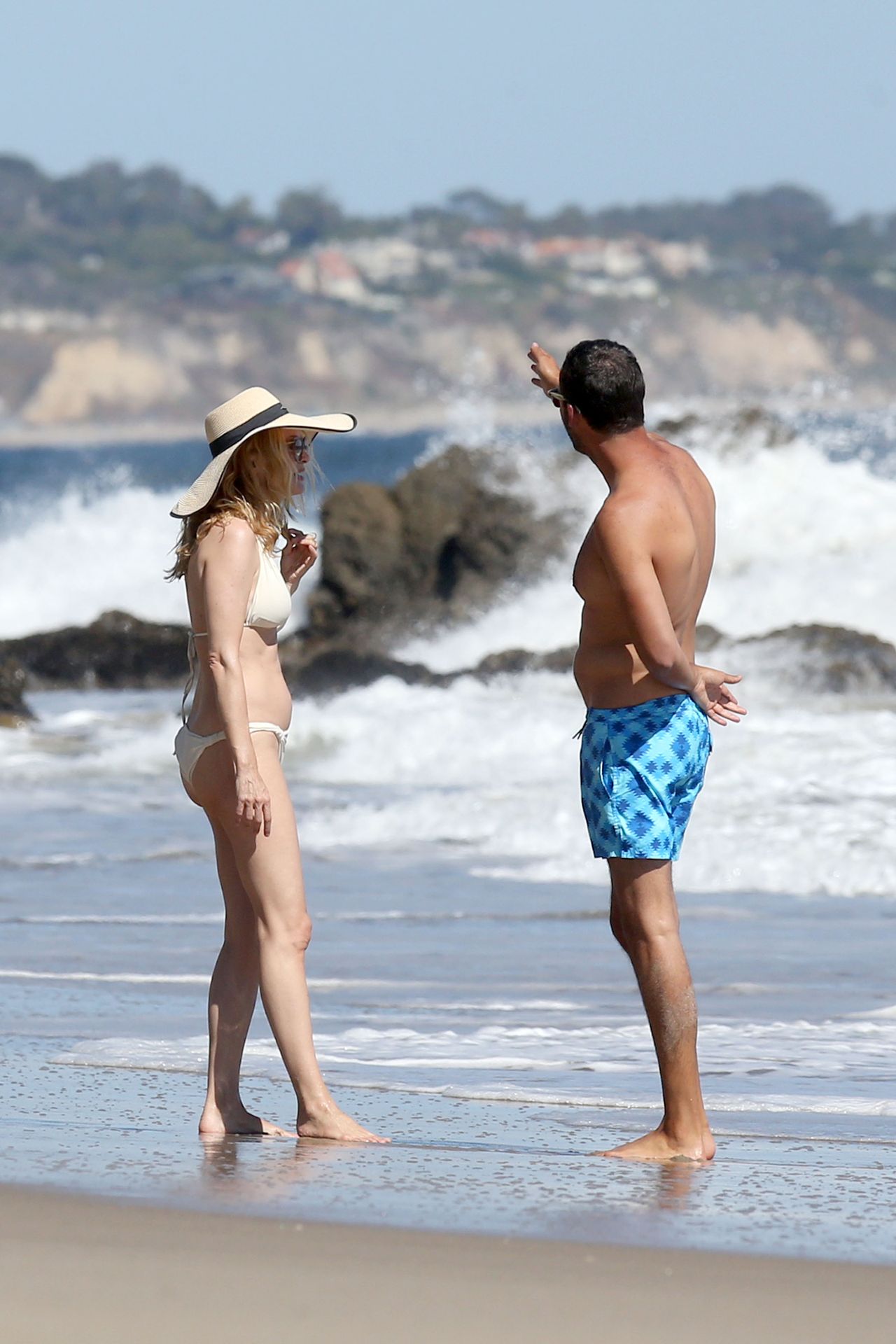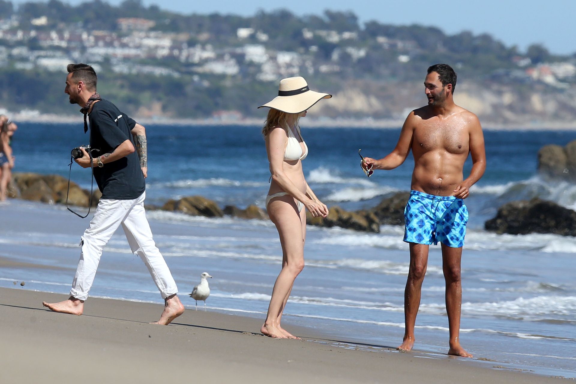 Vestida con un bikini color marfil, Heather se cuidó de proteger su piel con un enorme sombrero de ala ancha y gafas de sol. En un momento, un amigo en común bajó para unirse a ellos en la orilla y tomarles una foto. Heather y su amigo posaron felices para la instantánea. Pasando alrededor de 20 minutos riendo y charlando, la pareja luego regresó por la playa, con el viento soplando el cabello de Heather sobre su rostro mientras reajustaba su sombrero.