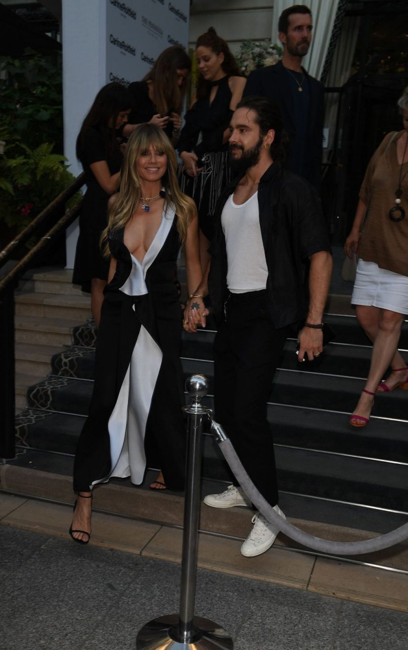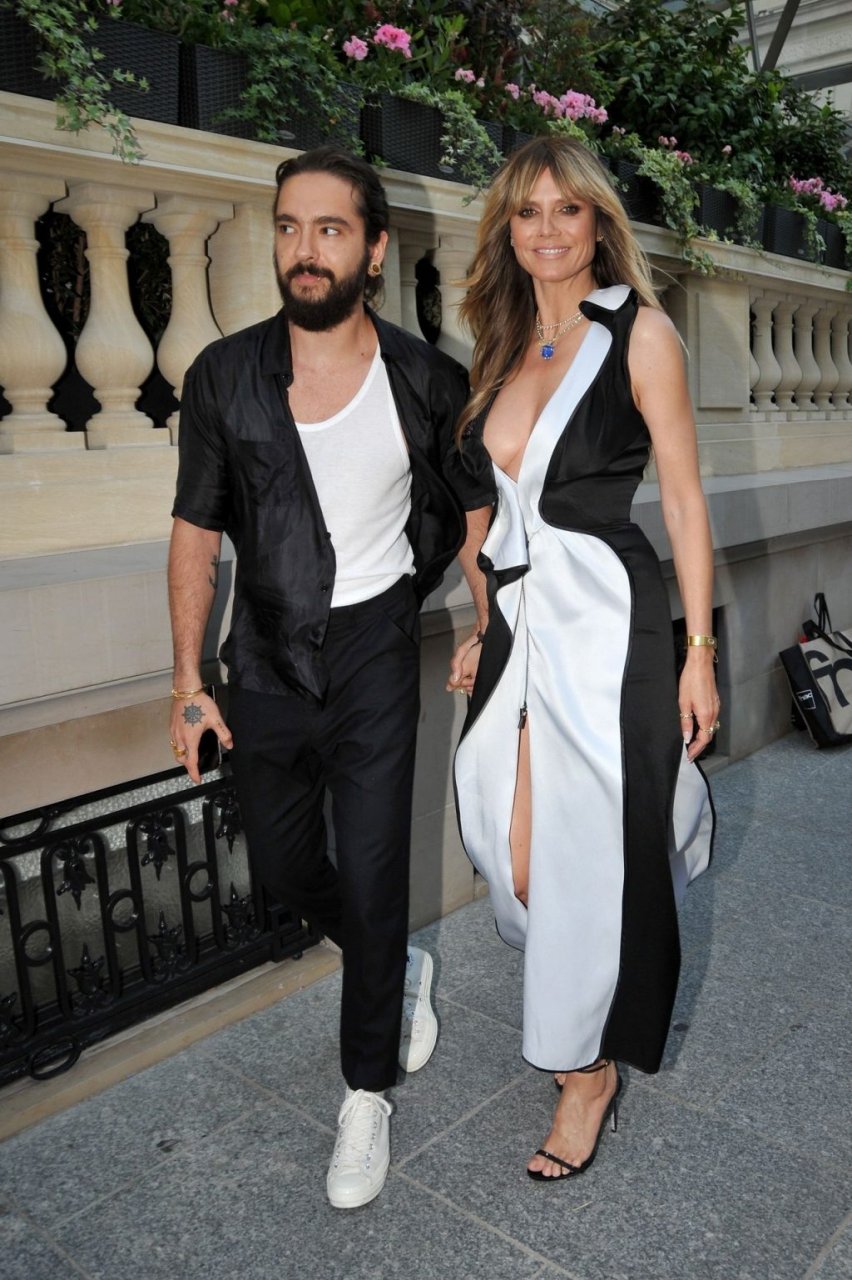 Heidi Klum y Tom Kaulitz asisten al cóctel “7 lovers” de Carine Roitfeld Parfums en el Hotel Peninsula en París, 01/07/2019. La modelo/actriz/presentadora de televisión alemana de 46 años llevaba un vestido blanco y negro con un escote pronunciado.