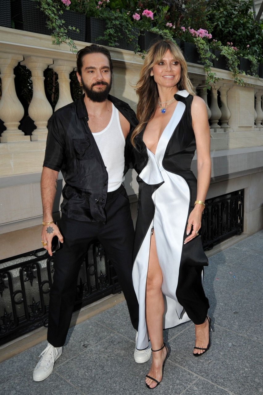 Heidi Klum y Tom Kaulitz asisten al cóctel “7 lovers” de Carine Roitfeld Parfums en el Hotel Peninsula en París, 01/07/2019. La modelo/actriz/presentadora de televisión alemana de 46 años llevaba un vestido blanco y negro con un escote pronunciado.