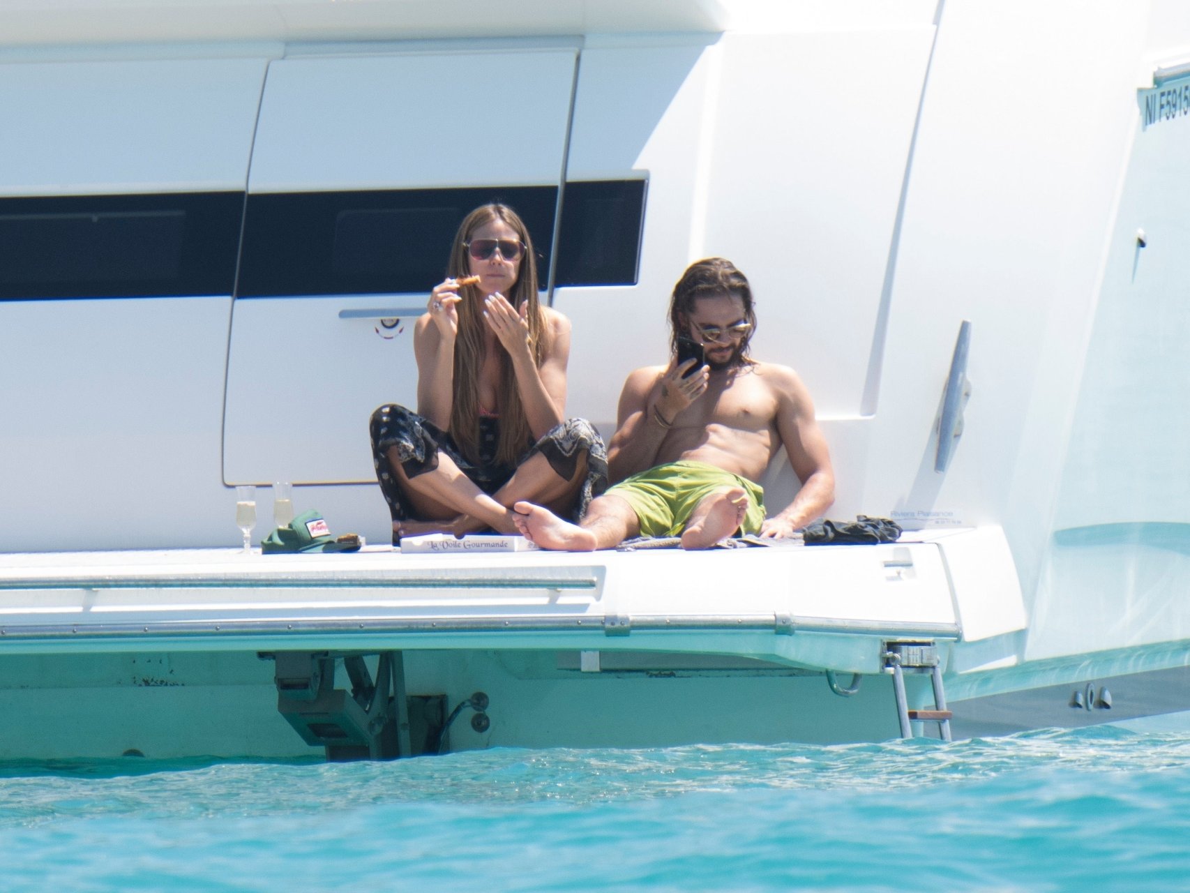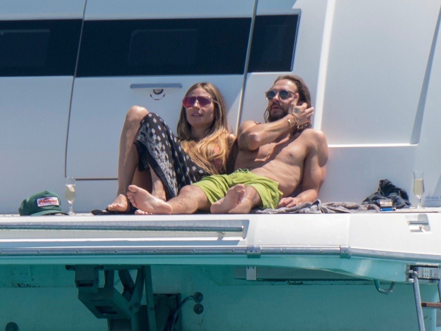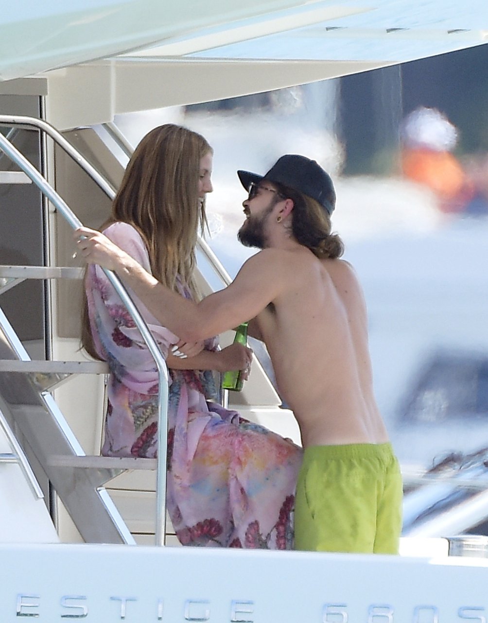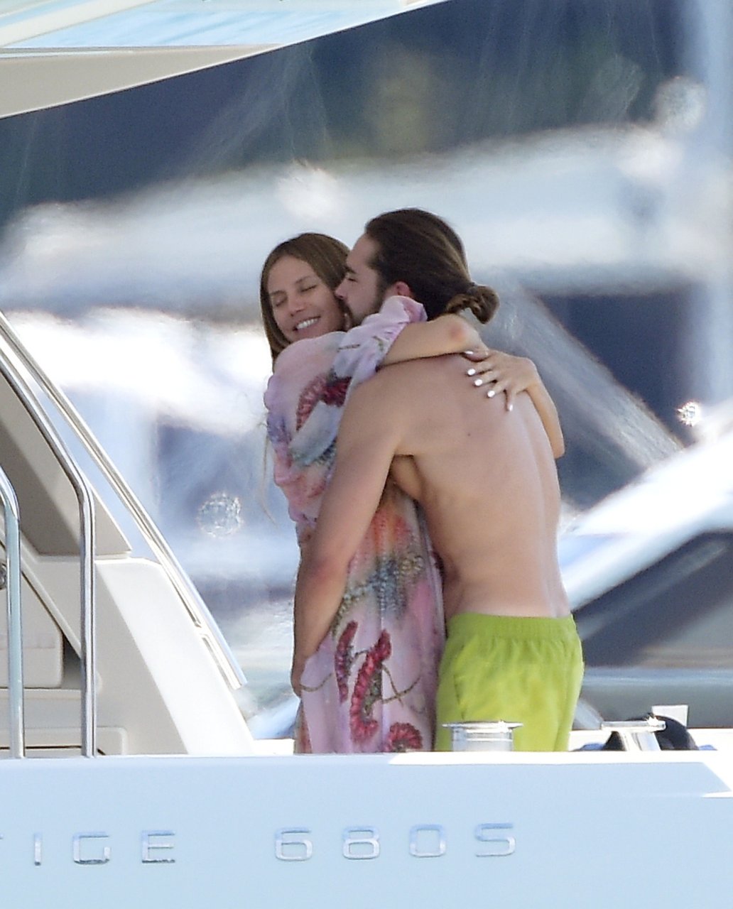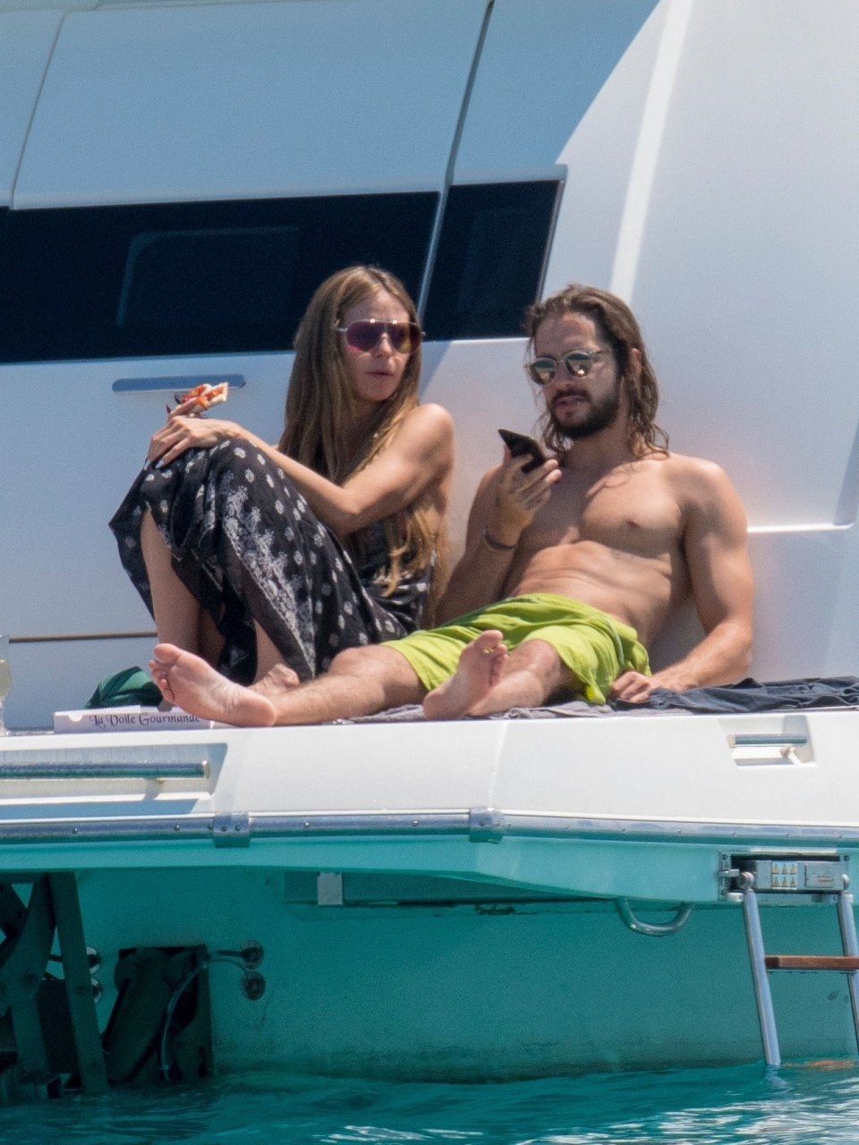 La supermodelo alemana y personalidad de televisión Heidi Klum, 44, y su nuevo novio Tom Kaulitz piden pizza en un barco en Cannes, 19/05/2018. La pareja enamorada se besó mientras tomaban el sol.