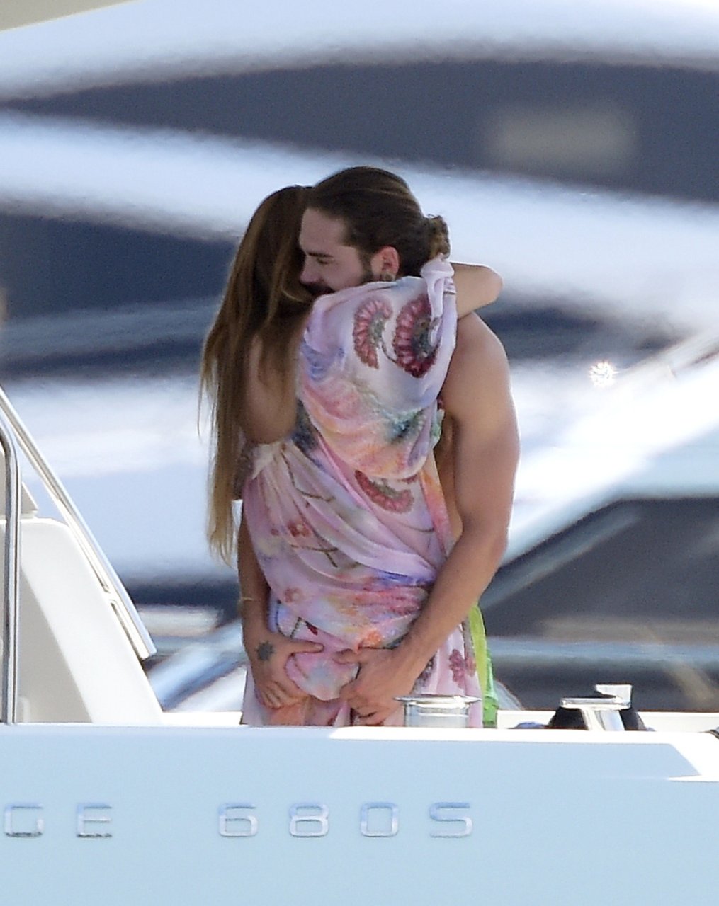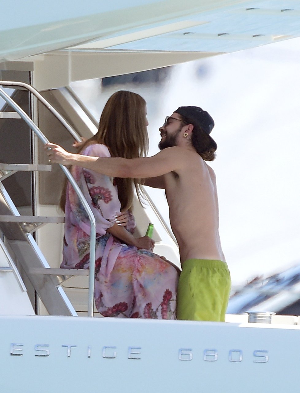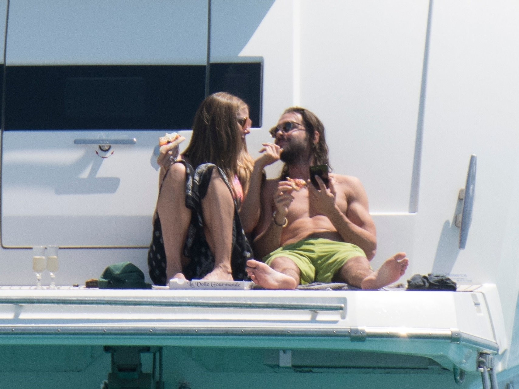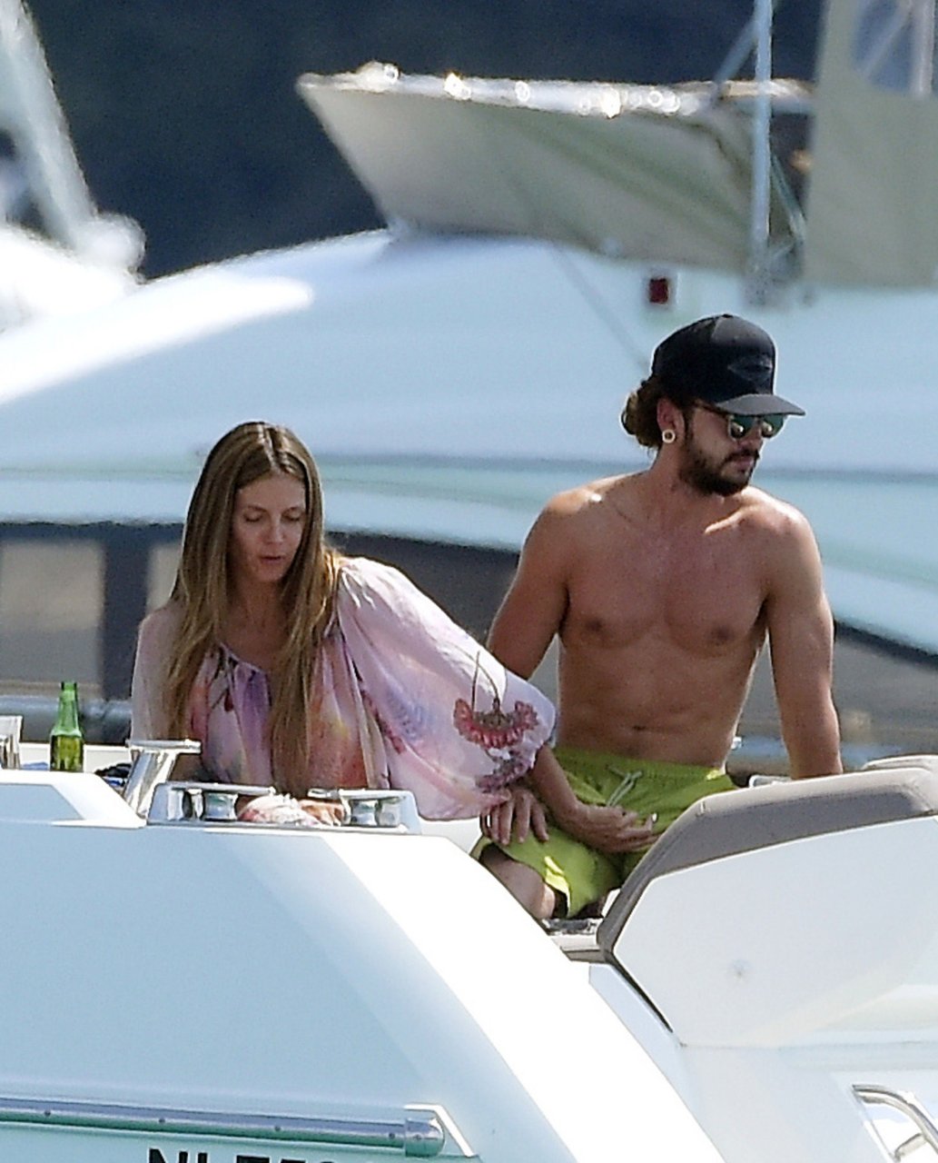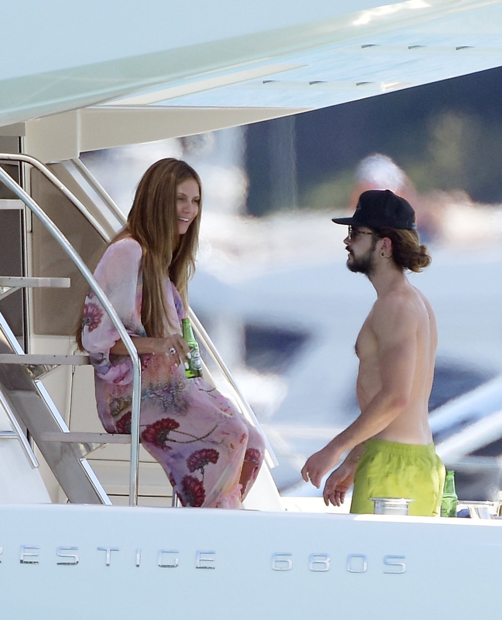 La supermodelo alemana y personalidad de televisión Heidi Klum, 44, y su nuevo novio Tom Kaulitz piden pizza en un barco en Cannes, 19/05/2018. La pareja enamorada se besó mientras tomaban el sol.