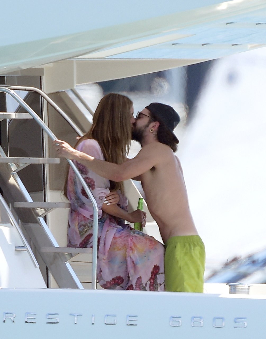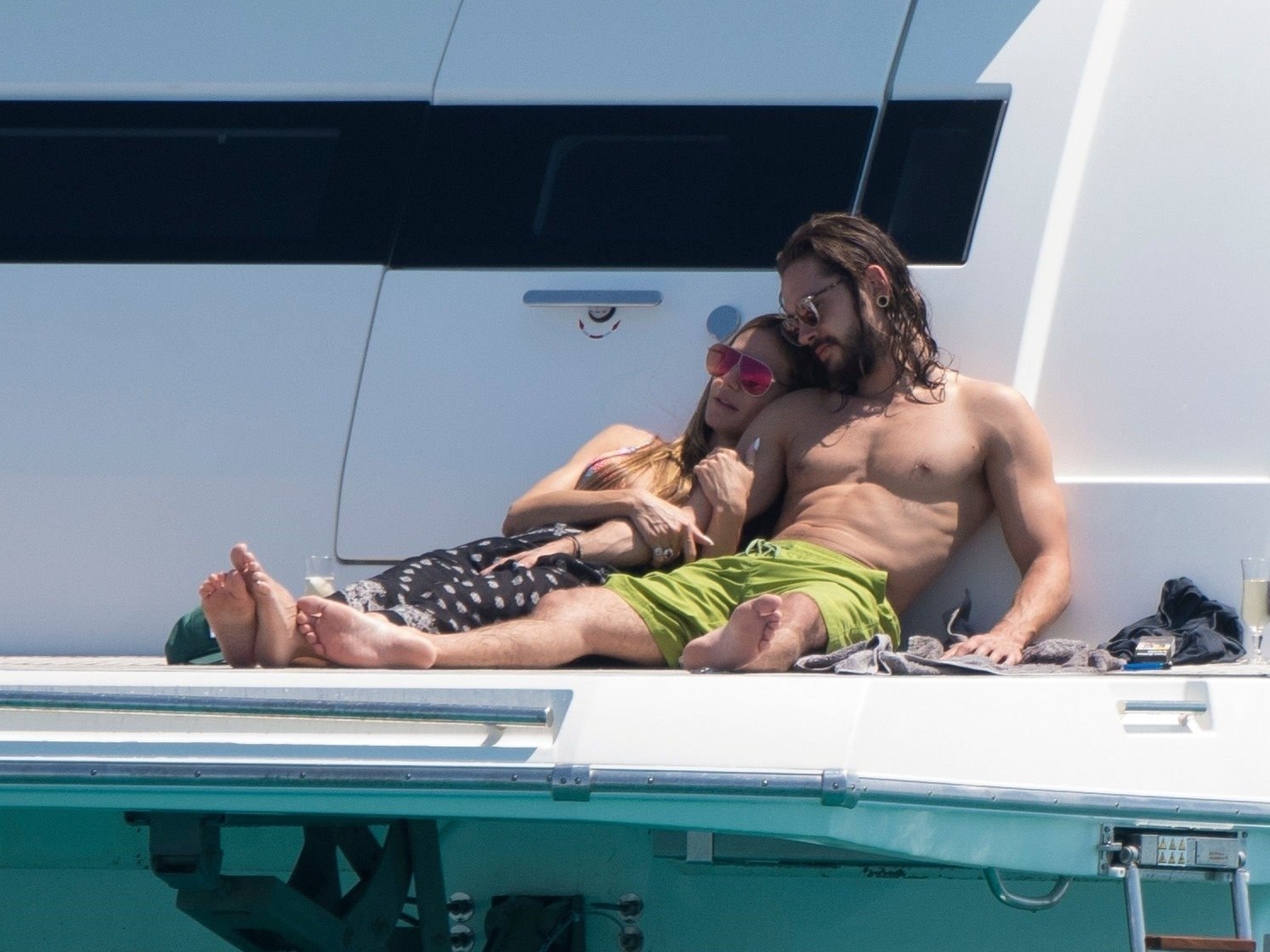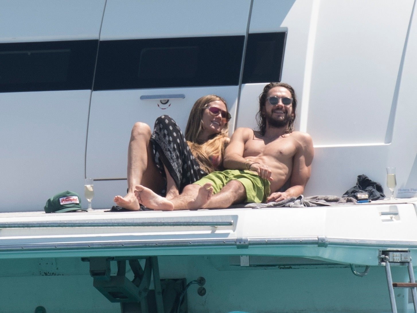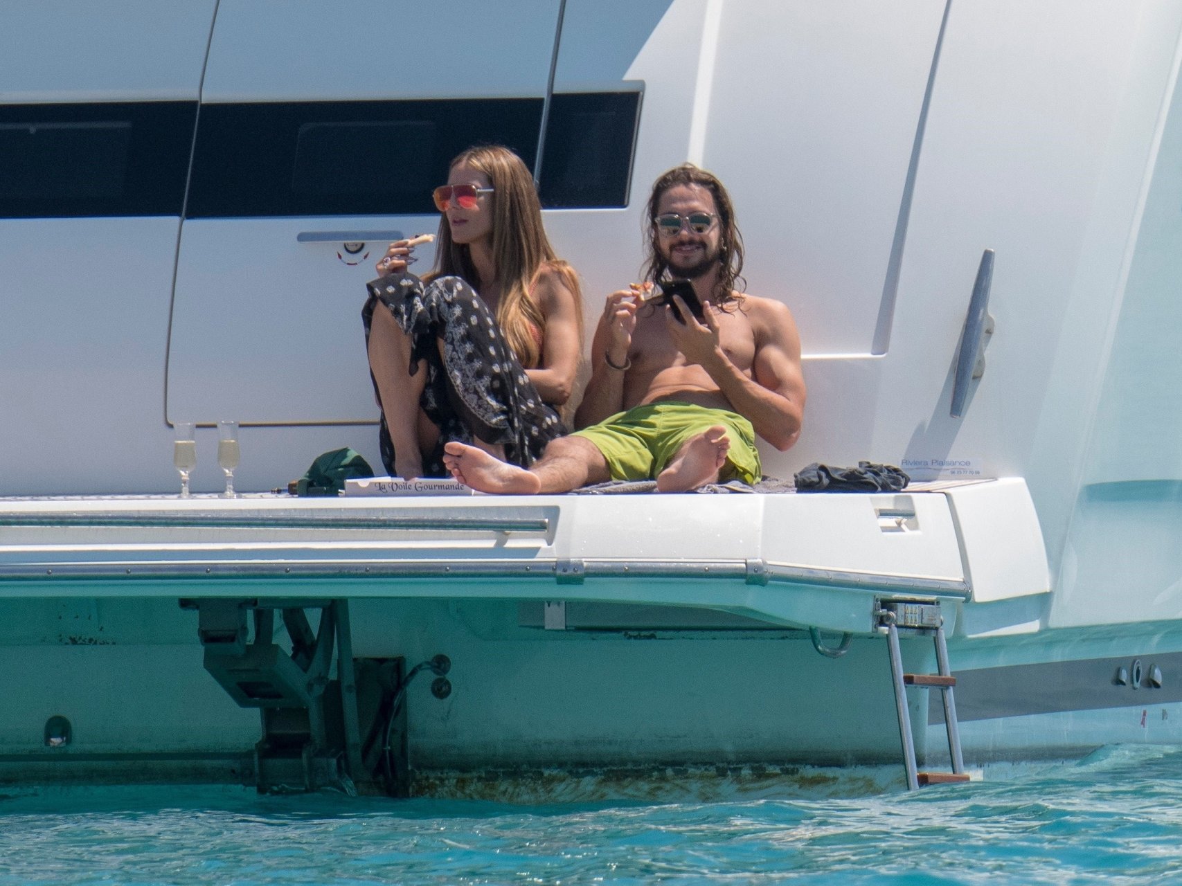 La supermodelo alemana y personalidad de televisión Heidi Klum, 44, y su nuevo novio Tom Kaulitz piden pizza en un barco en Cannes, 19/05/2018. La pareja enamorada se besó mientras tomaban el sol.