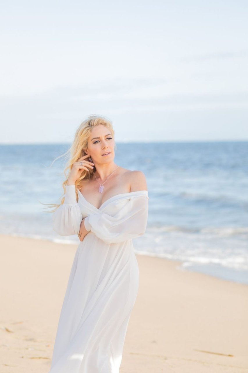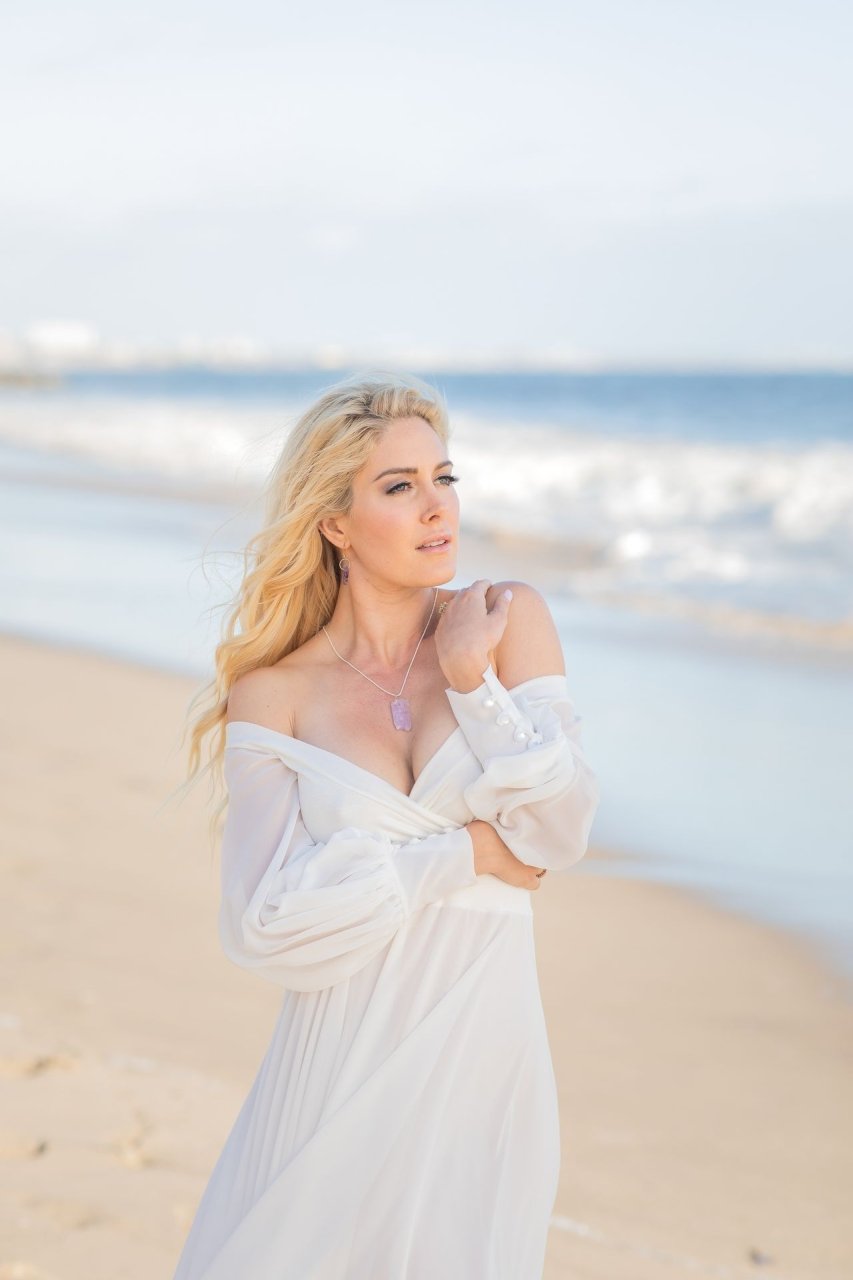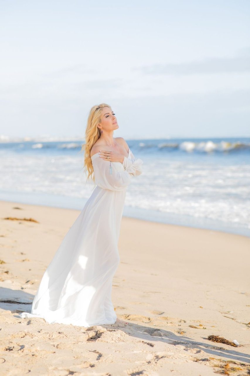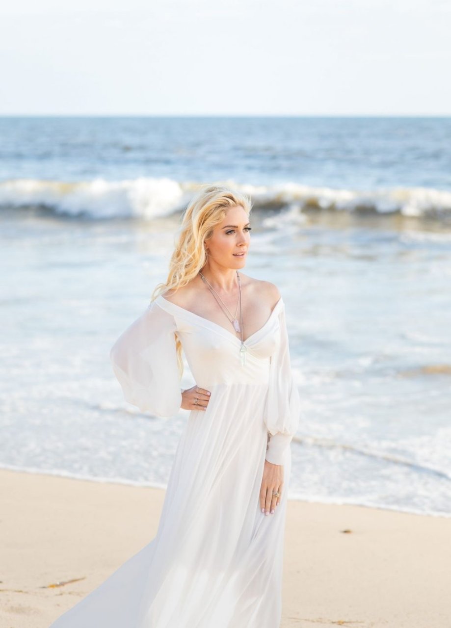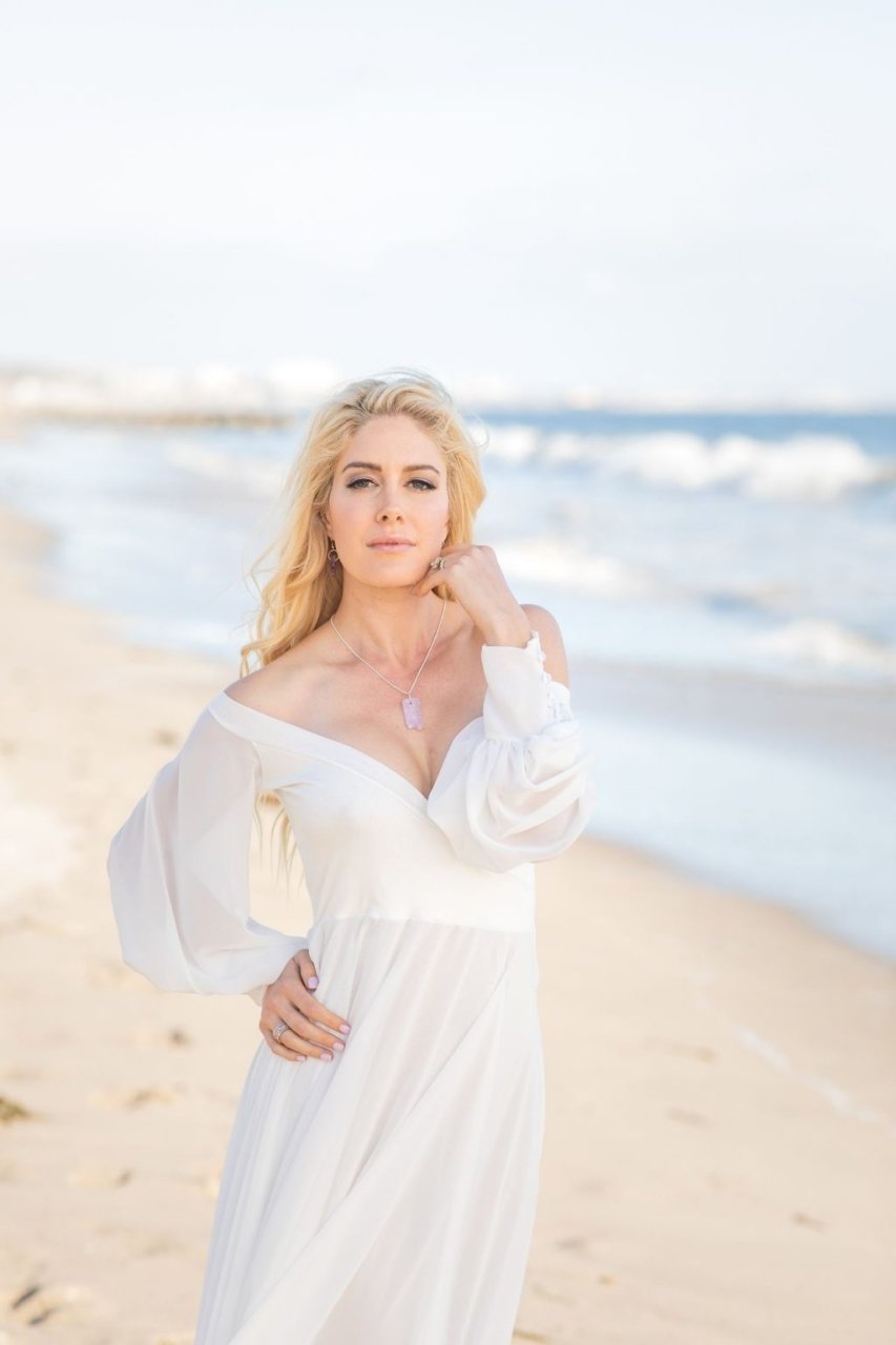 La personalidad de televisión y cantante Heidi Montag lleva un bonito vestido blanco transparente mientras posa para fotos este fin de semana en Malibu, 08/05/2019. La rubia caliente de 32 años mostró su escote en la playa.