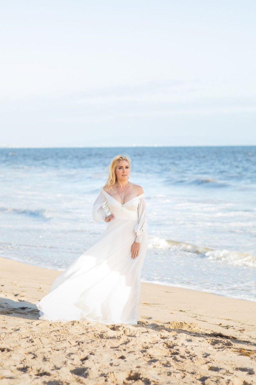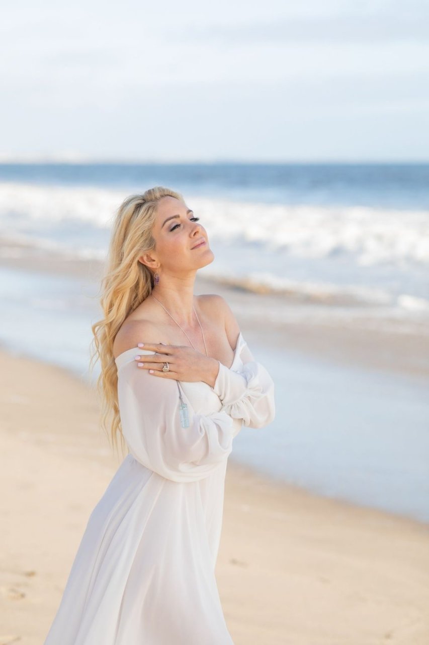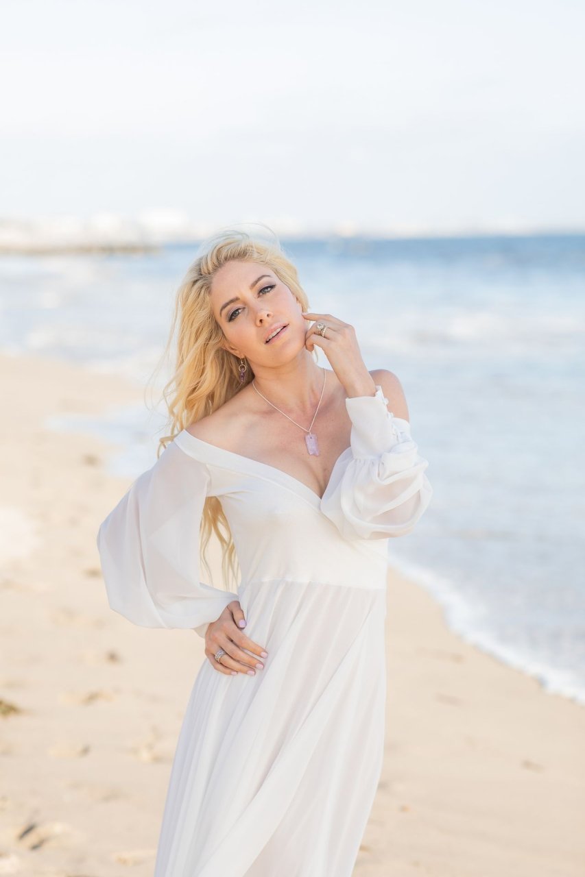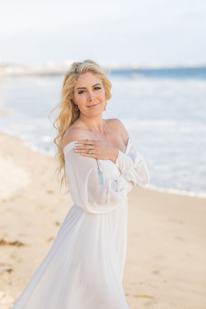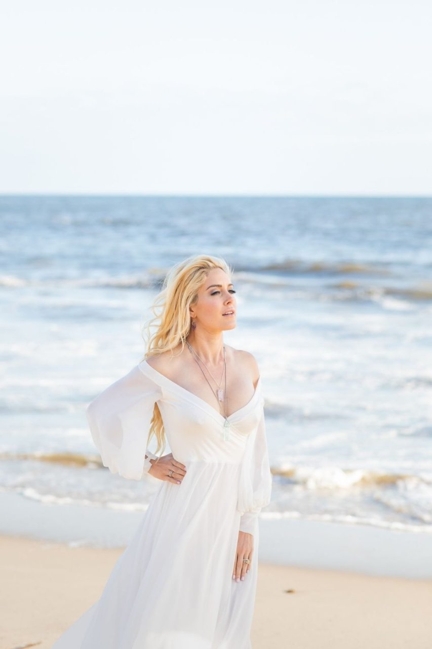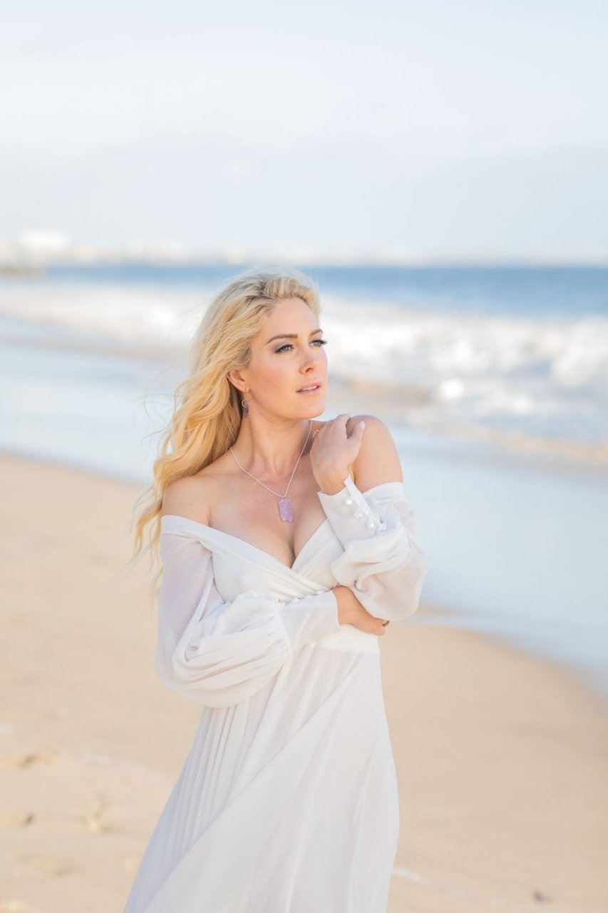 La personalidad de televisión y cantante Heidi Montag lleva un bonito vestido blanco transparente mientras posa para fotos este fin de semana en Malibu, 08/05/2019. La rubia caliente de 32 años mostró su escote en la playa.