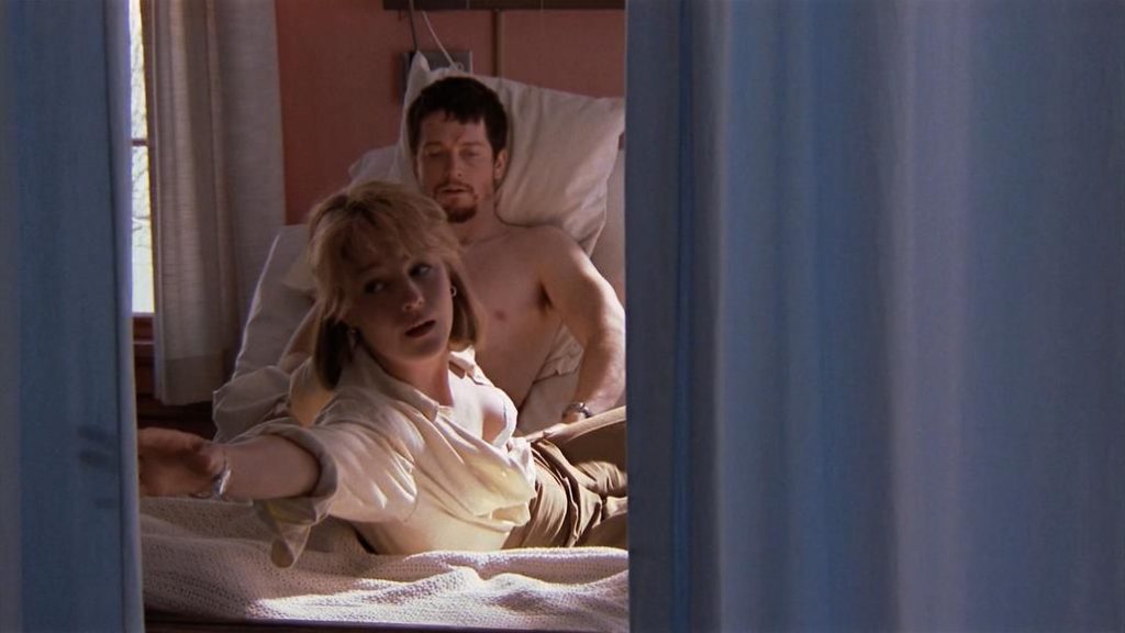 Helen Hunt con un sostén y una camisa abierta mientras besa a un hombre en una cama de hospital, y él le abre la falda para revelar sus bragas y luego la estimula con sus dedos.