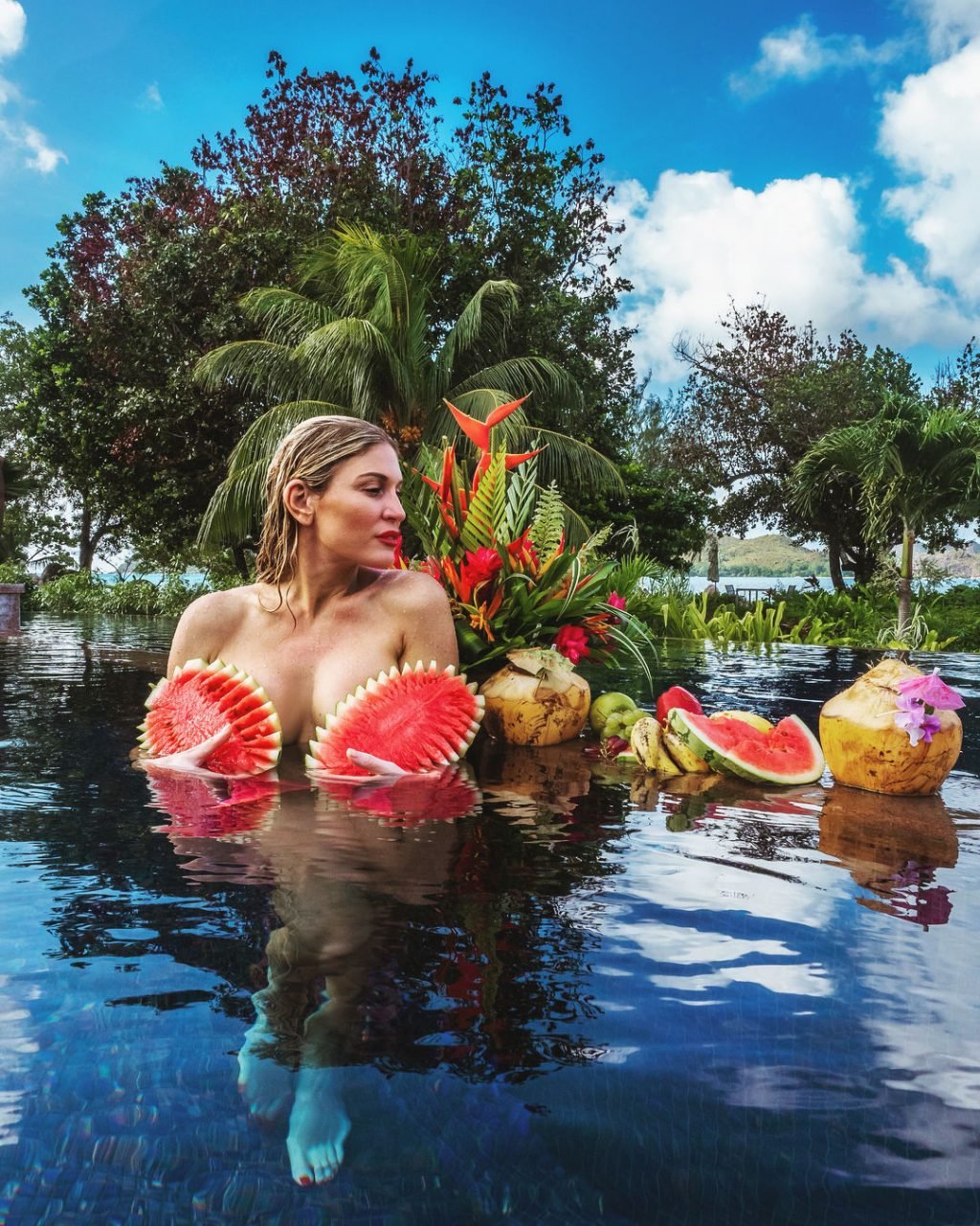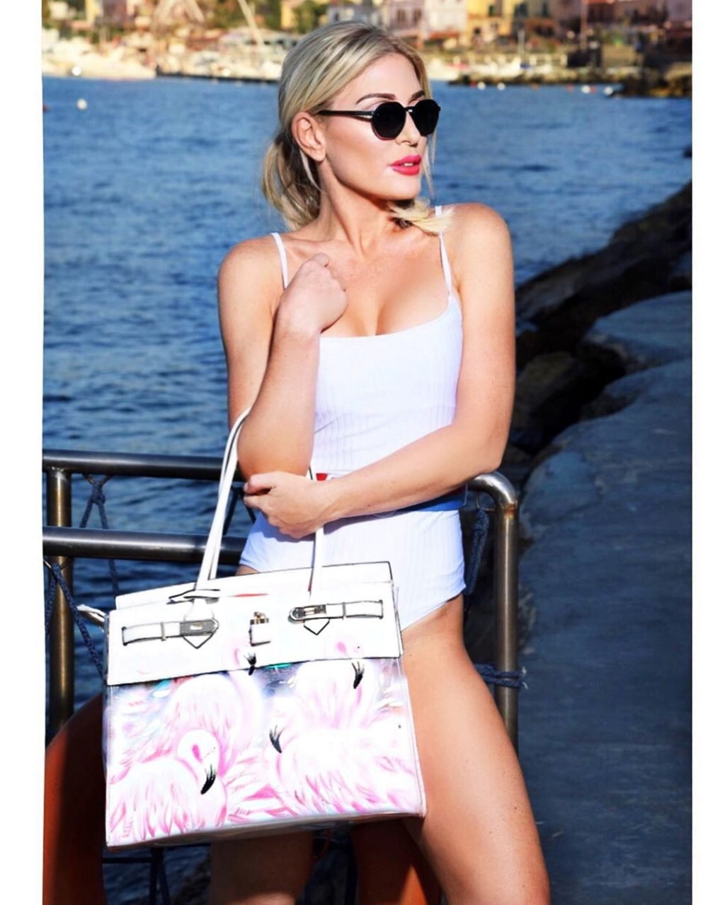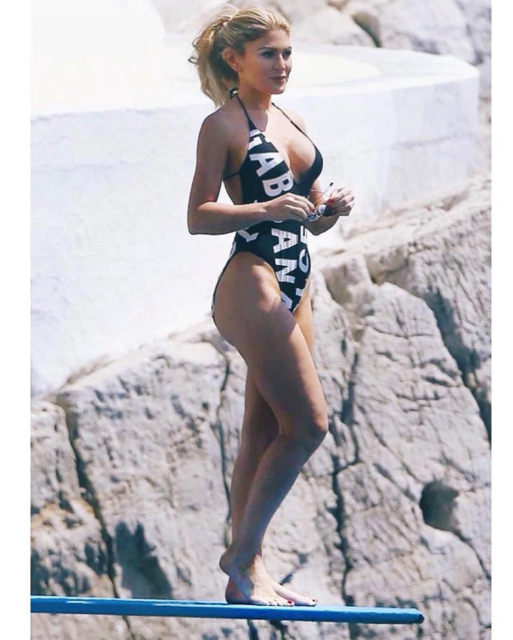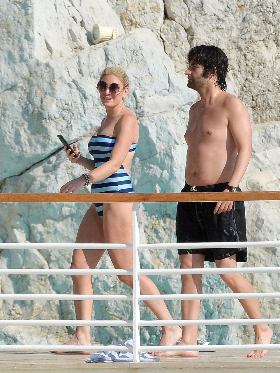 Hofit Golan muestra sus muy abundantes atributos en un traje de baño a rayas con escote pronunciado mientras disfrutaba de unas vacaciones de lujo en el Hotel Eden Roc en Antibes. 21/07/2018.