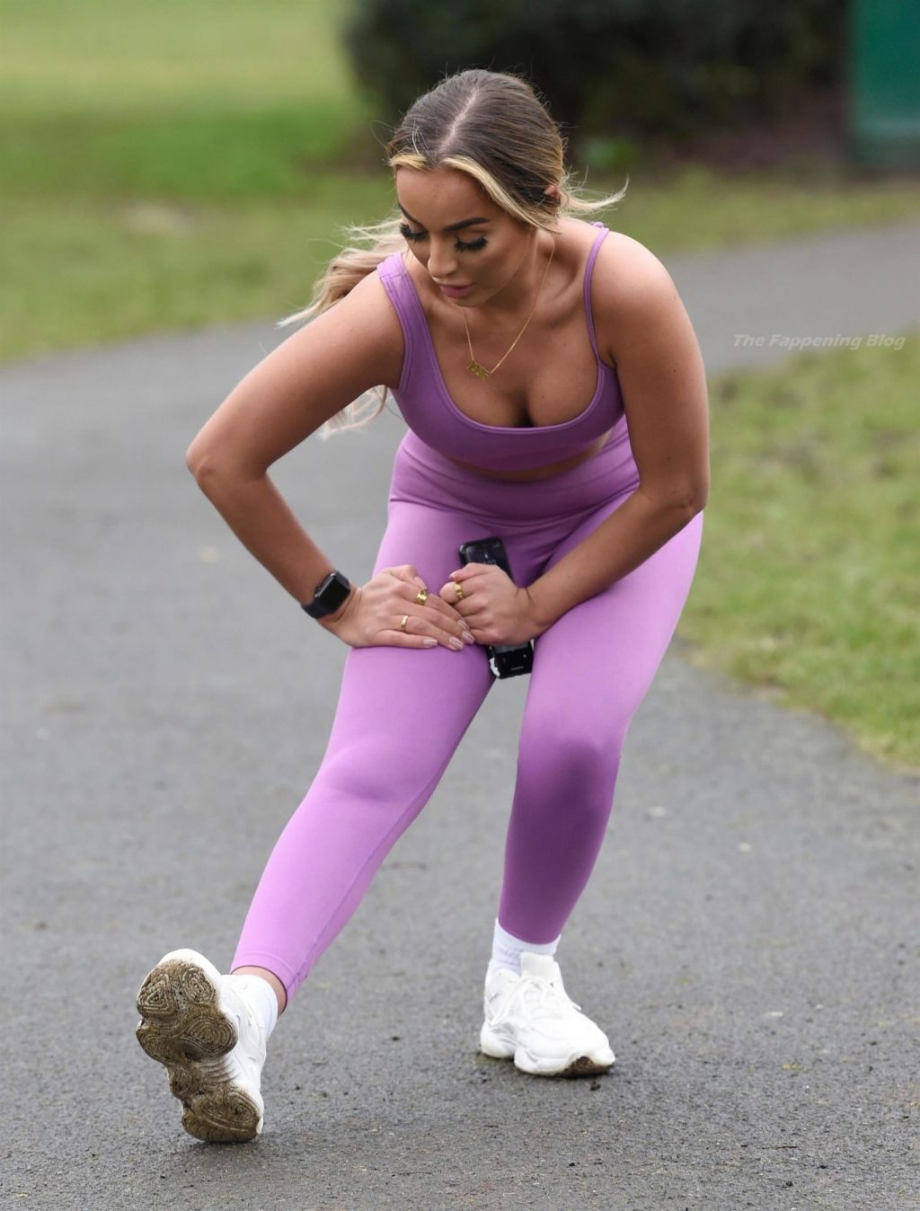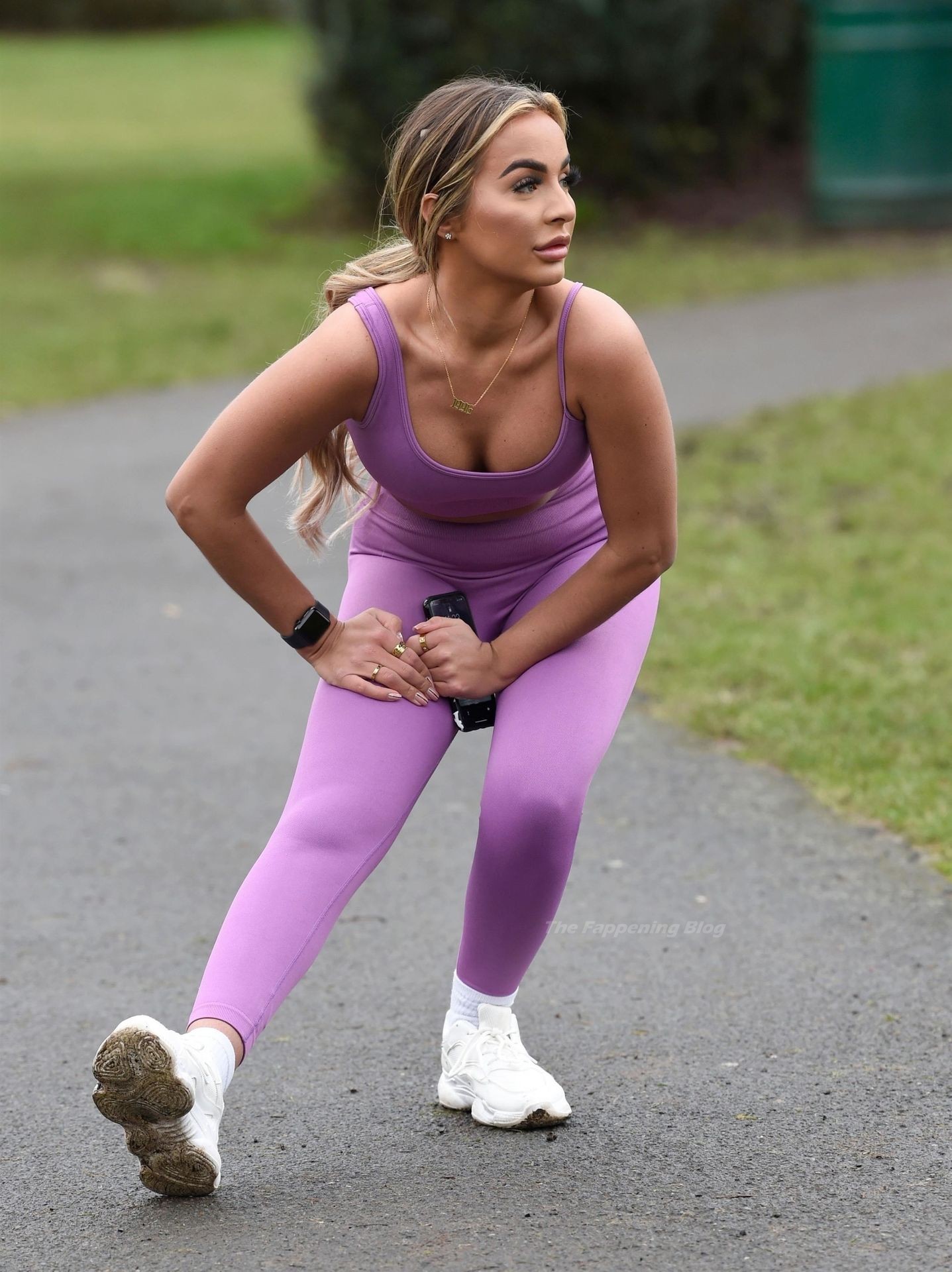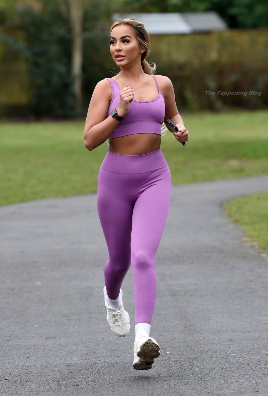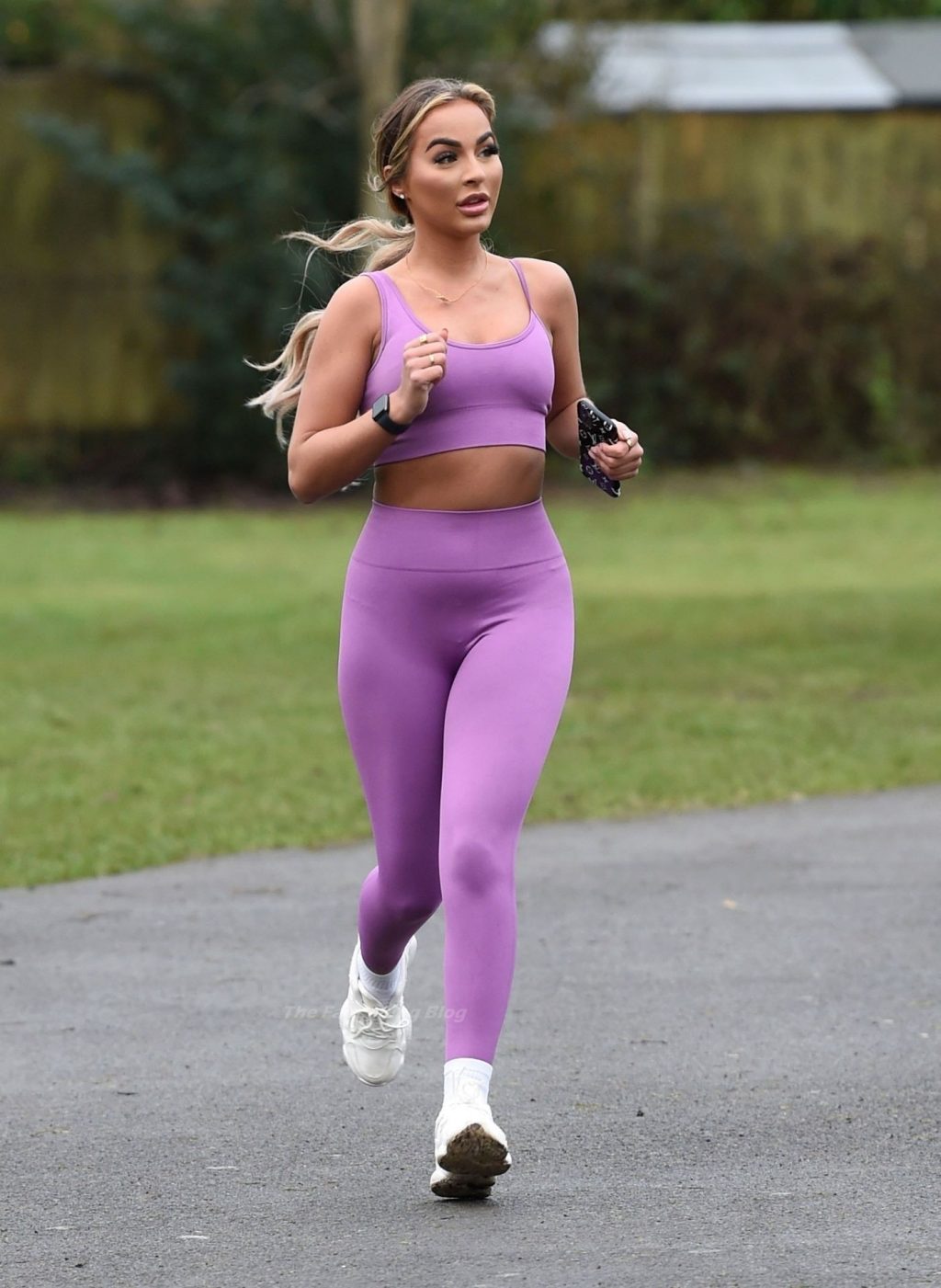 Presumiendo de su impresionante pérdida de peso de una piedra y media, la sexy estrella lució su conjunto de entrenamiento morado mientras trotaba con algunos intensos ejercicios de estiramiento en el camino.