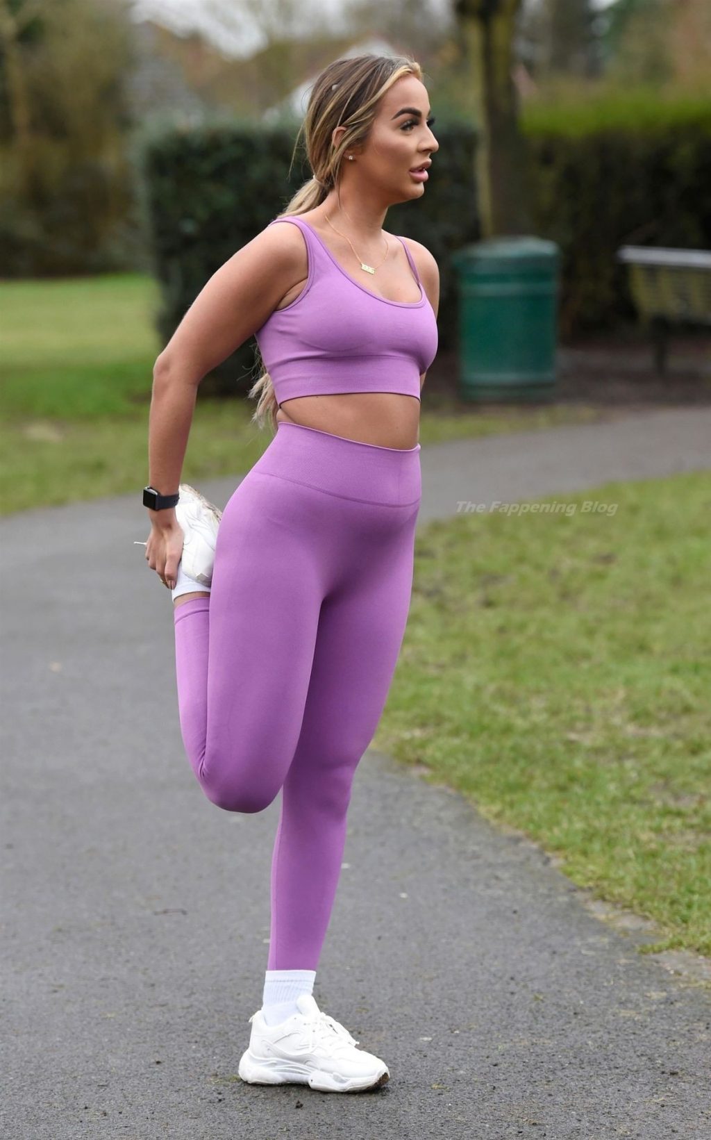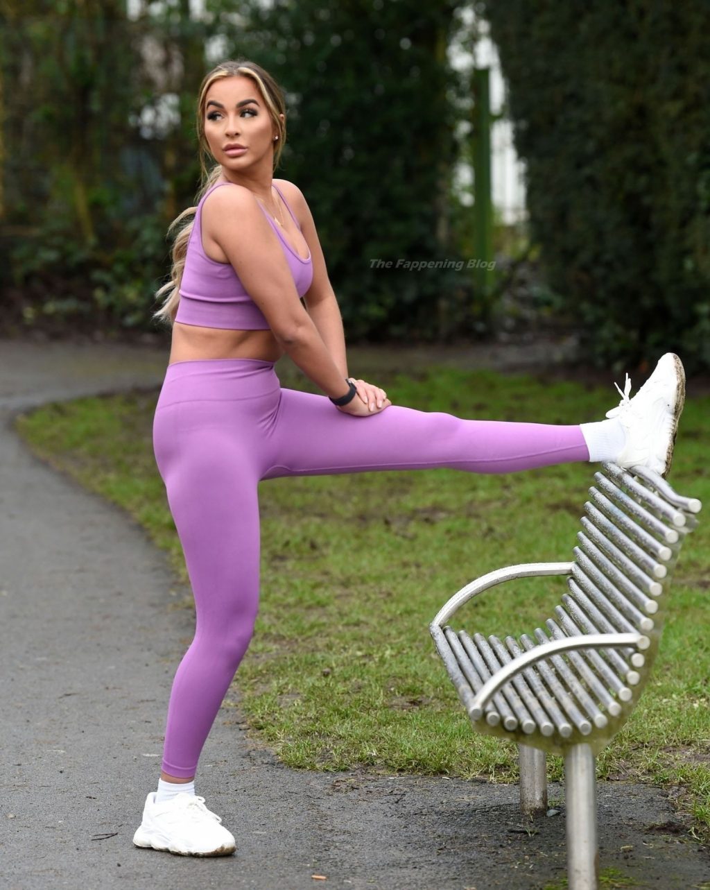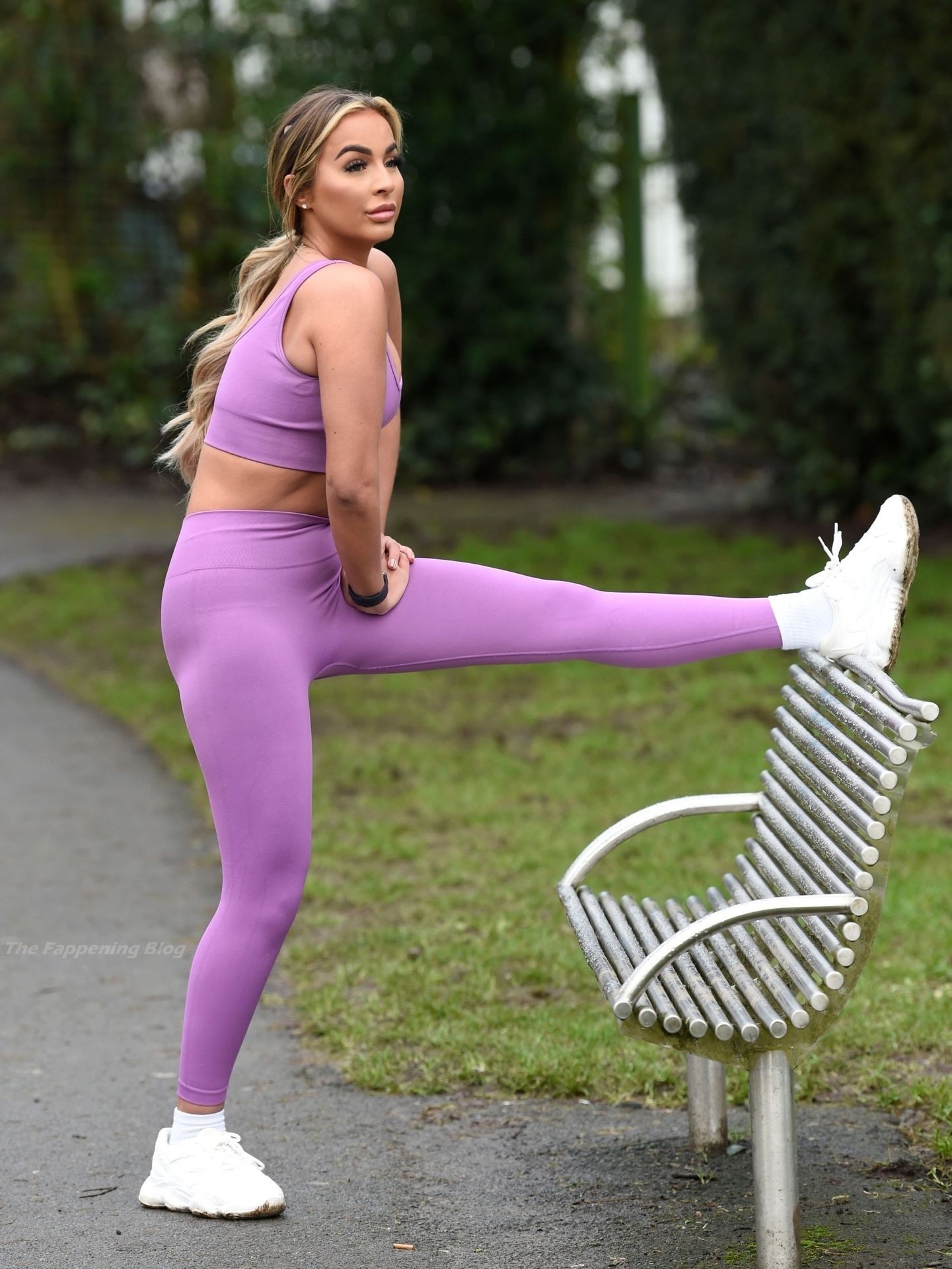 Presumiendo de su impresionante pérdida de peso de una piedra y media, la sexy estrella lució su conjunto de entrenamiento morado mientras trotaba con algunos intensos ejercicios de estiramiento en el camino.