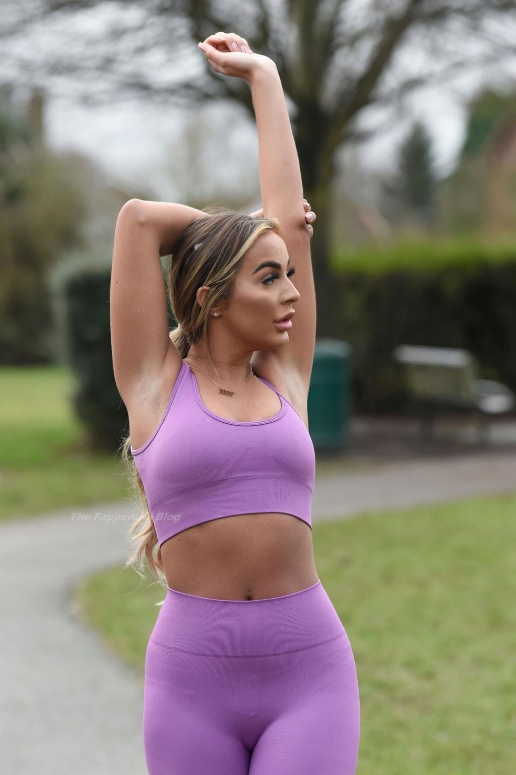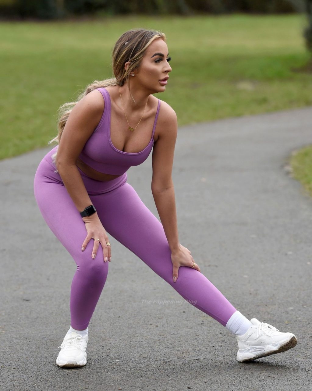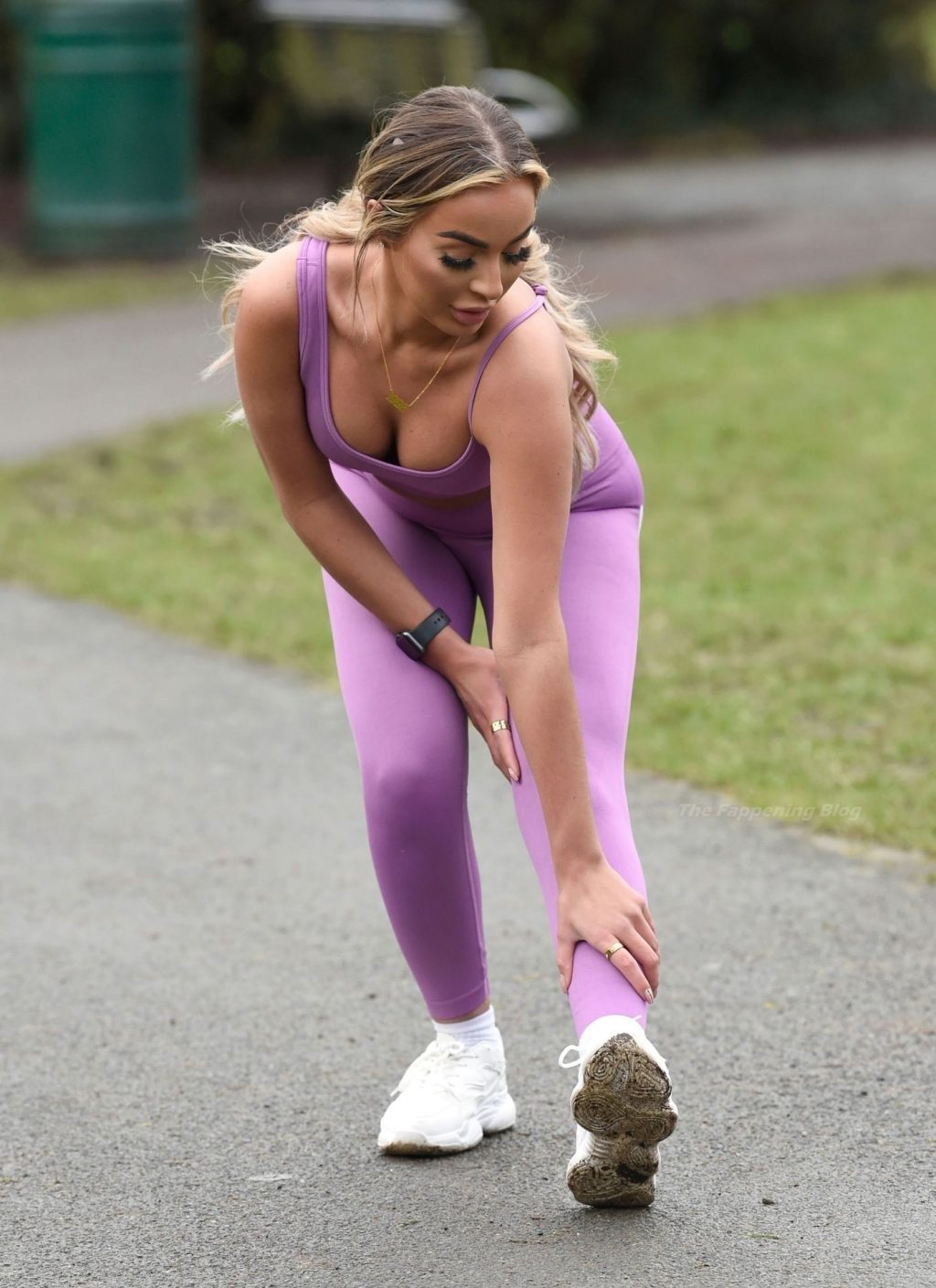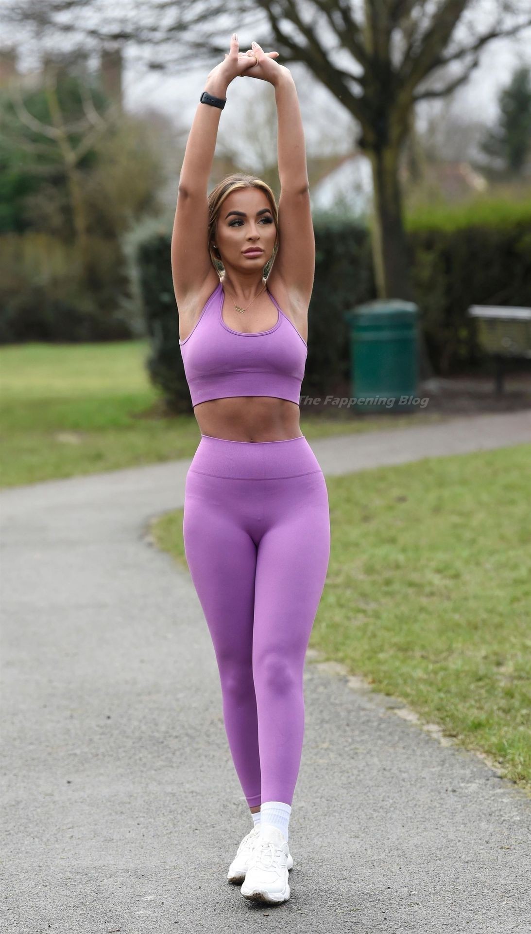 Presumiendo de su impresionante pérdida de peso de una piedra y media, la sexy estrella lució su conjunto de entrenamiento morado mientras trotaba con algunos intensos ejercicios de estiramiento en el camino.