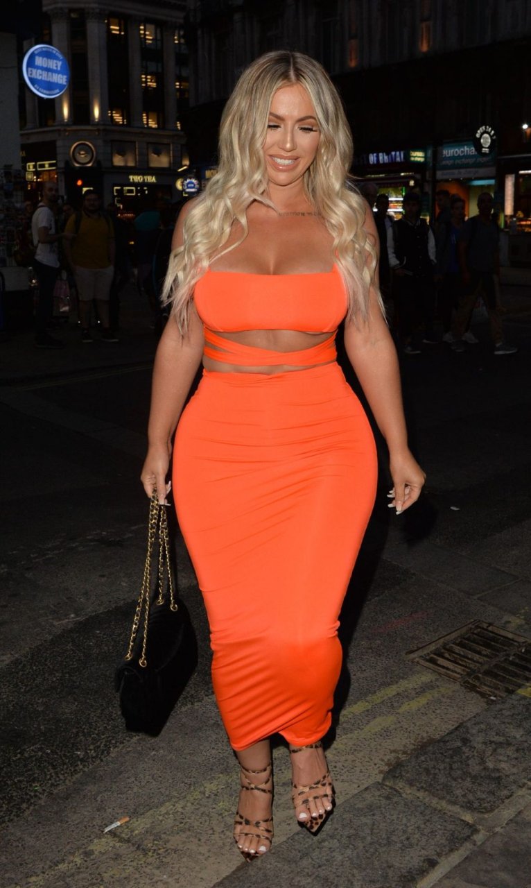 Holly Hagan muestra sus curvas en naranja neón mientras sale del club nocturno Opium en Londres después de celebrar el final de Celebs Go Dating, 07/08/2019.