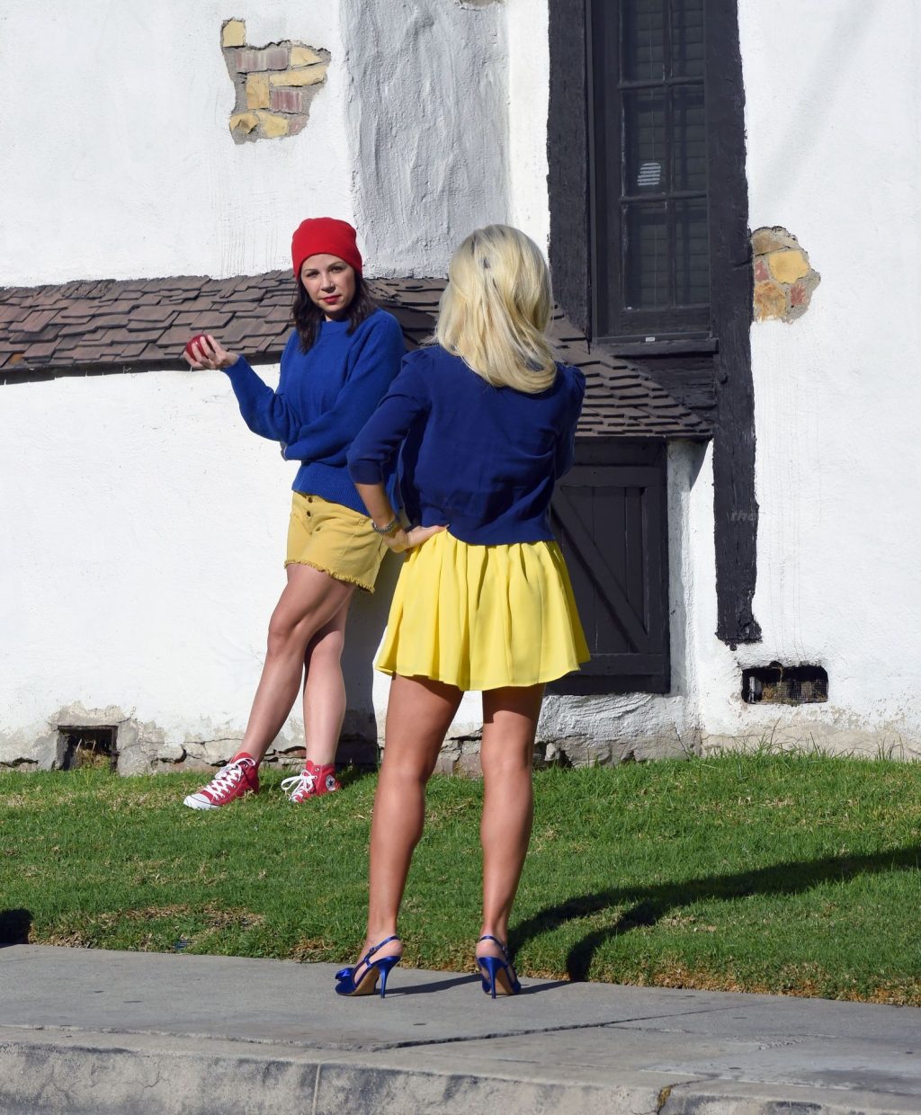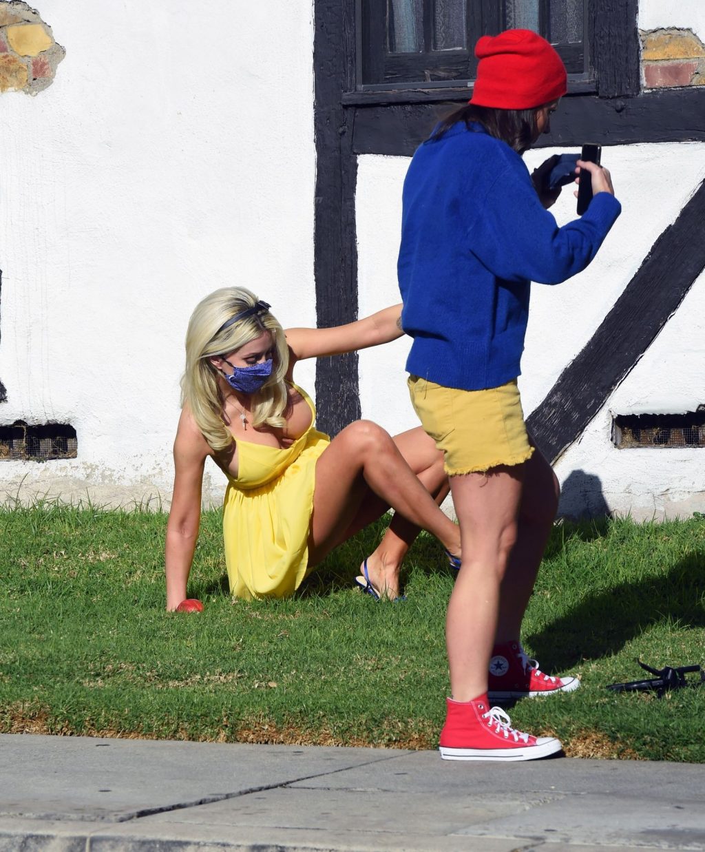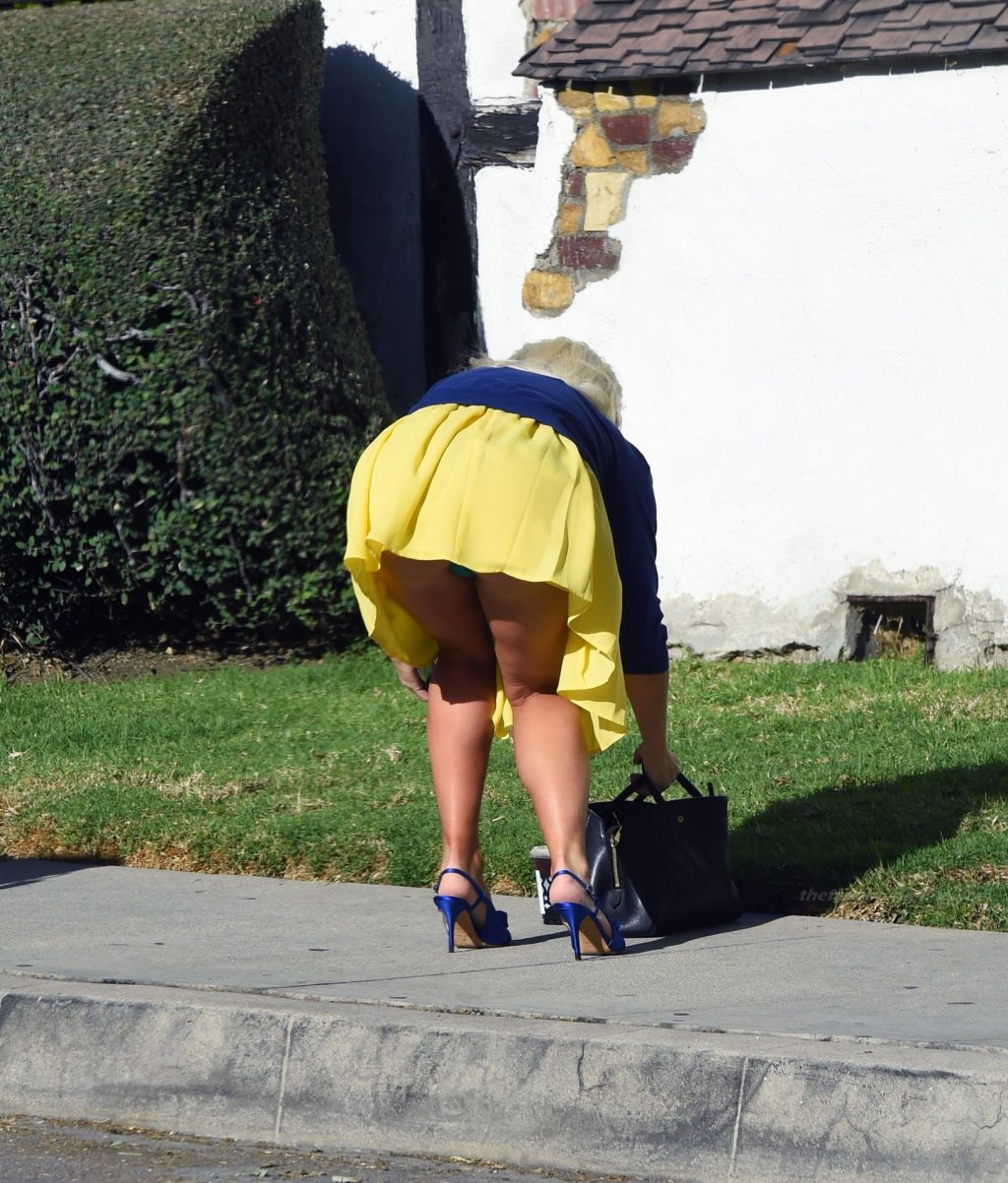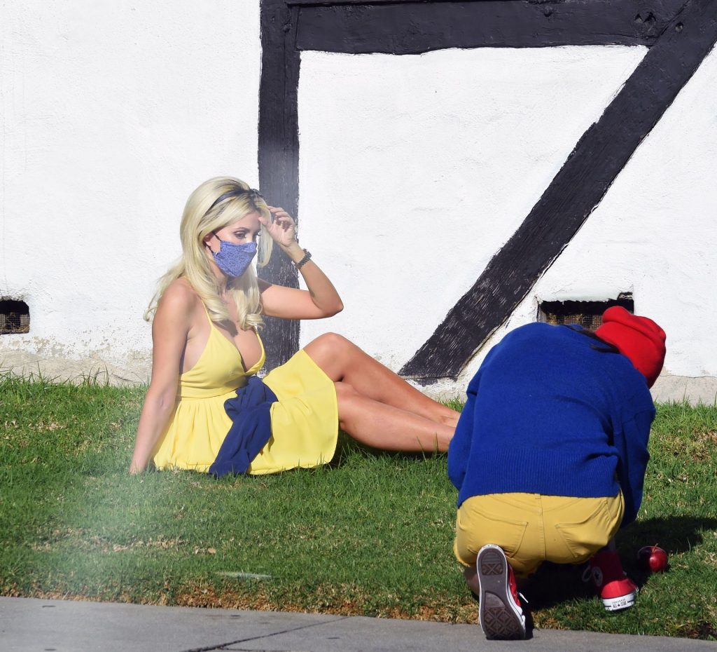 Holly Madison posa con su amiga con un atuendo revelador para una mini sesión de fotos en Los Ángeles, 12/05/2020. La actriz de 40 años lleva un vestido mini amarillo, tacones altos azules y una chaqueta corta azul.