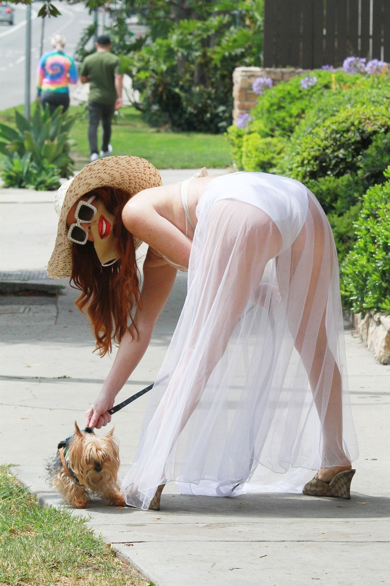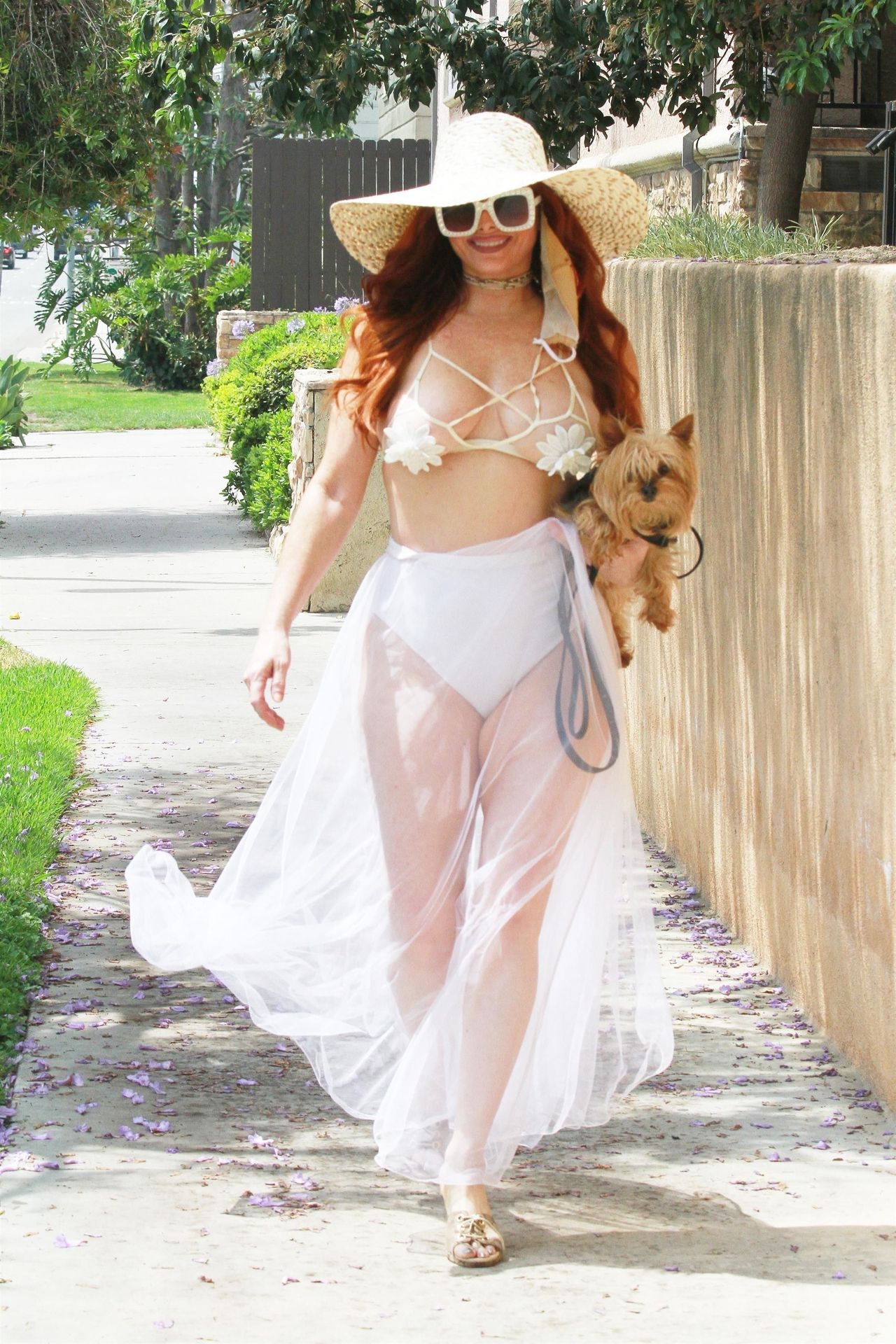La actriz estadounidense y estrella de las redes sociales Phoebe Price fue vista sonriendo con su perro y posando con un vestido transparente en Los Ángeles, 25/06/2020.