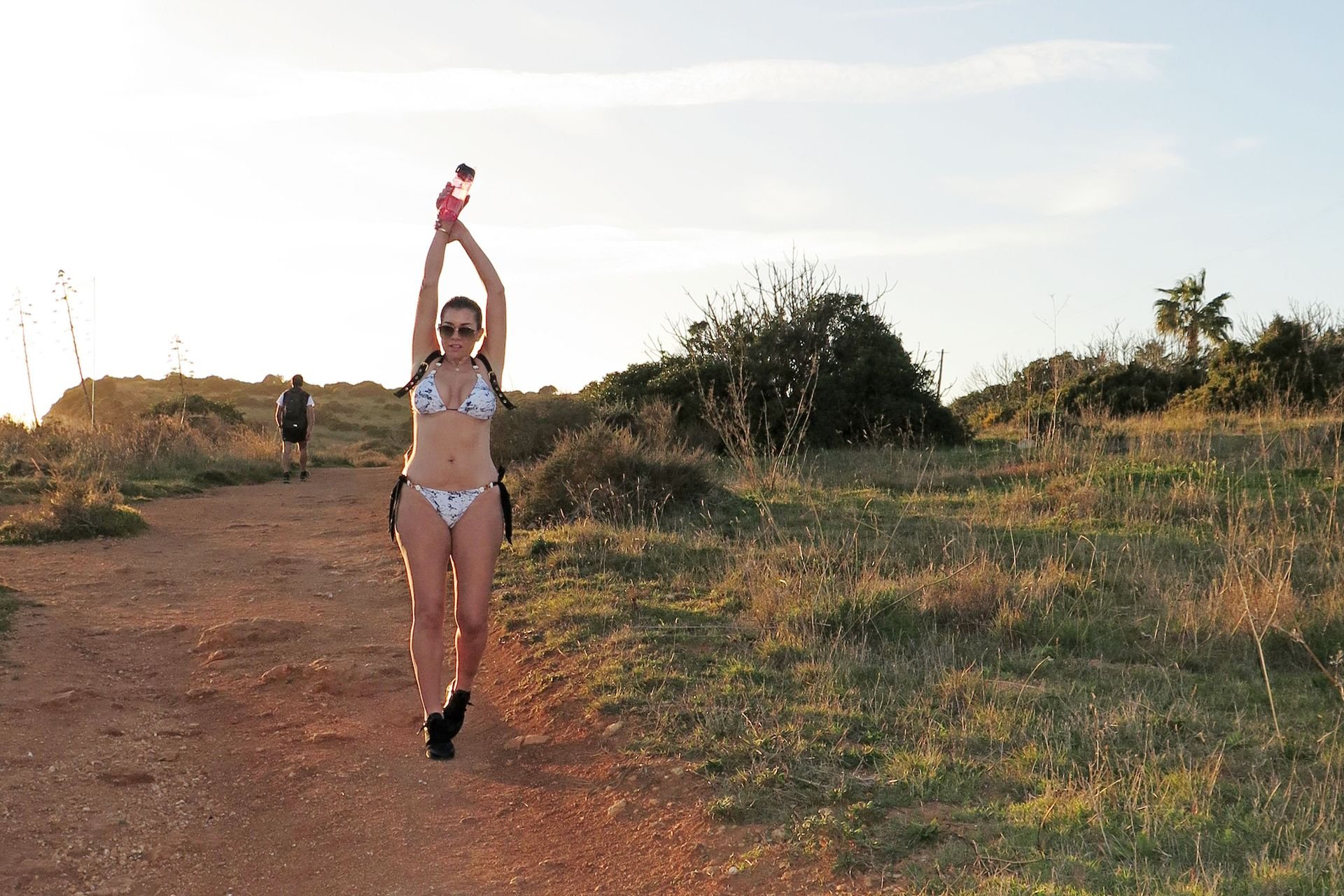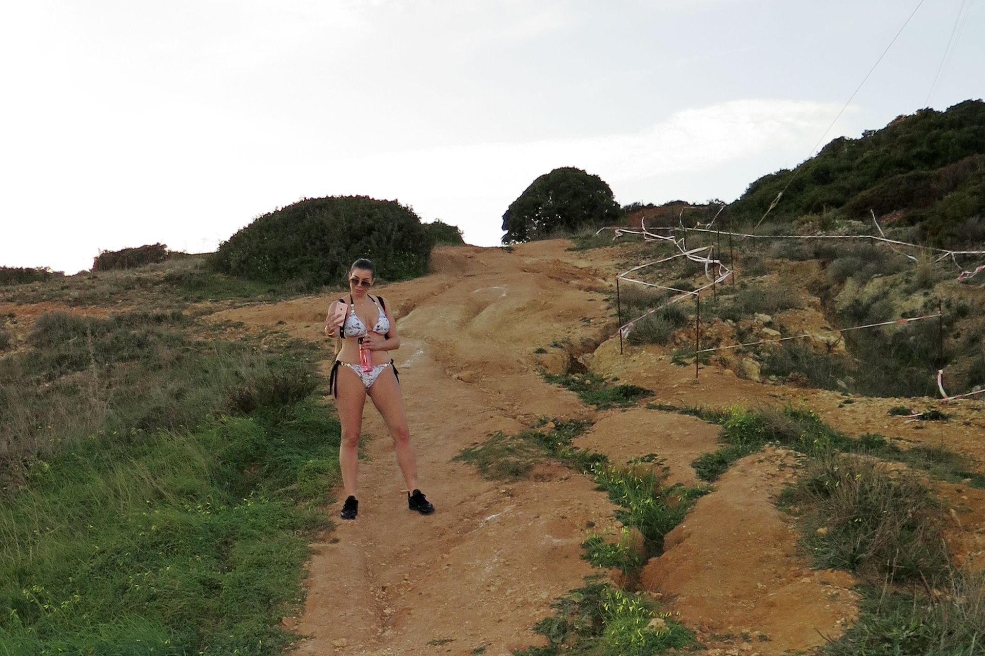 Imogen Thomas muestra con confianza su figura tonificada y va de excursión en bikini de su marca Chasing Summer, zapatillas Valentino y una mochila Burberry, 26/01/2019.