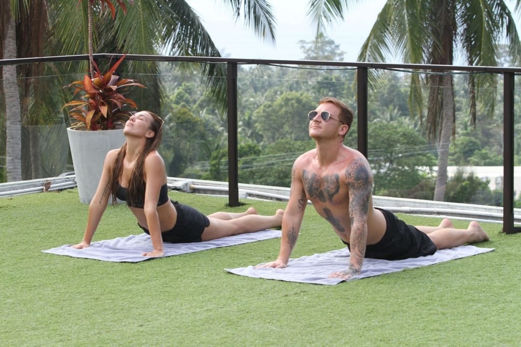 La estrella de “Ibiza Weekender” Imogen Townley se pone en forma con su novio Lewis con una serie de movimientos de Yoga, 20/04/2019.